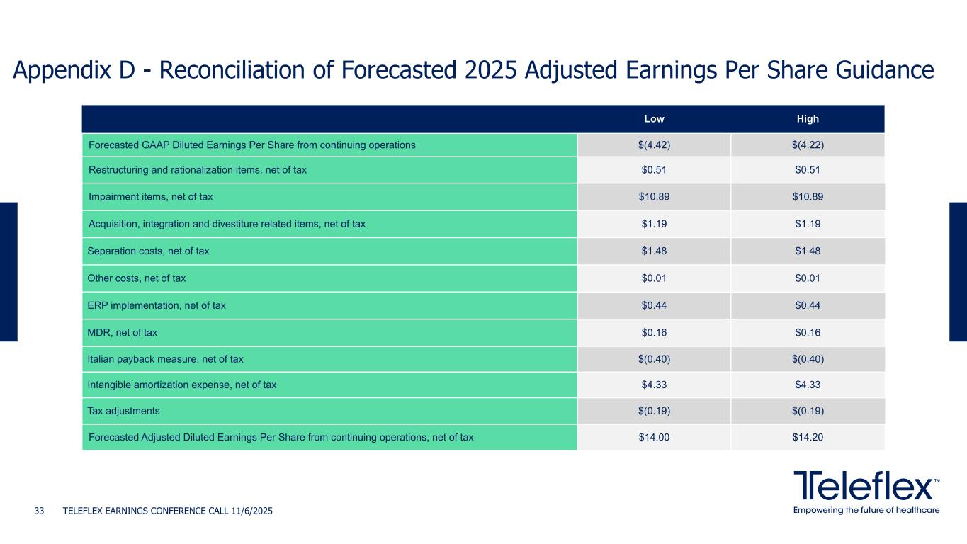 Appendix D - Reconciliation of Forecasted 2025 Adjusted Earnings Per Share Guidance TELEFLEX EARNINGS CONFERENCE CALL 11/6/202533 Low High Forecasted GAAP Diluted Earnings Per Share from continuing operations $(4.42) $(4.22) Restructuring and rationalization items, net of tax $0.51 $0.51 Impairment items, net of tax $10.89 $10.89 Acquisition, integration and divestiture related items, net of tax $1.19 $1.19 Separation costs, net of tax $1.48 $1.48 Other costs, net of tax $0.01 $0.01 ERP implementation, net of tax $0.44 $0.44 MDR, net of tax $0.16 $0.16 Italian payback measure, net of tax $(0.40) $(0.40) Intangible amortization expense, net of tax $4.33 $4.33 Tax adjustments $(0.19) $(0.19) Forecasted Adjusted Diluted Earnings Per Share from continuing operations, net of tax $14.00 $14.20