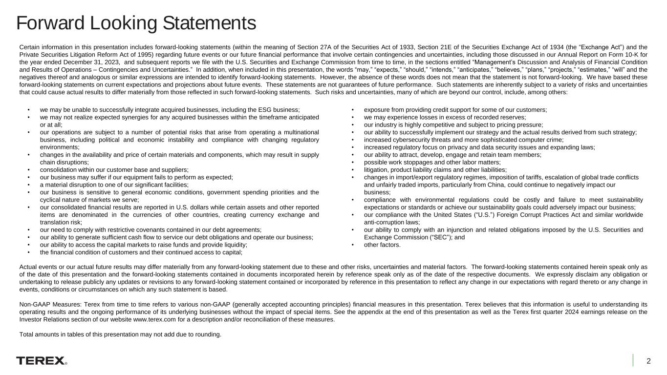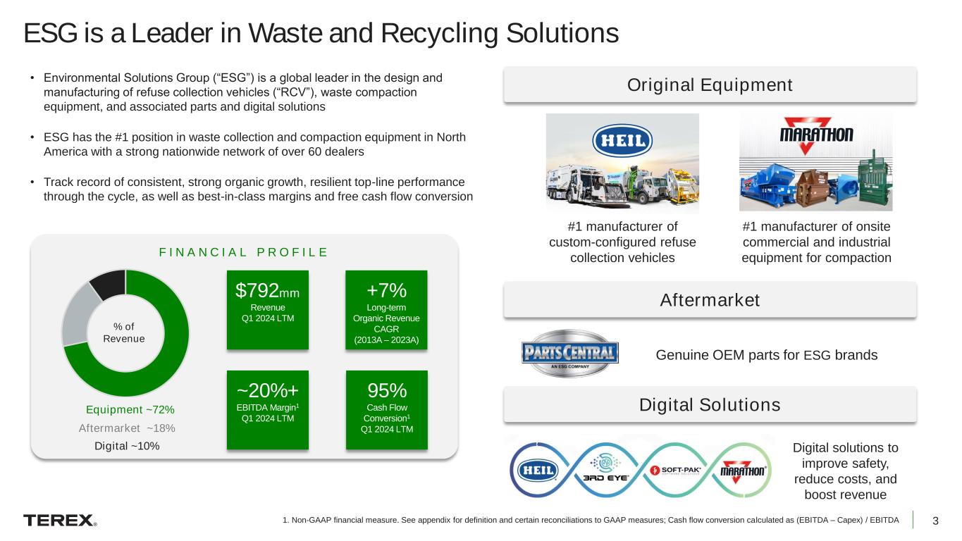2 Forward Looking Statements Certain information in this presentation includes forward-looking statements (within the meaning of Section 27A of the Securities Act of 1933, Section 21E of the Securities Exchange Act of 1934 (the “Exchange Act”) and the Private Securities Litigation Reform Act of 1995) regarding future events or our future financial performance that involve certain contingencies and uncertainties, including those discussed in our Annual Report on Form 10-K for the year ended December 31, 2023, and subsequent reports we file with the U.S. Securities and Exchange Commission from time to time, in the sections entitled “Management’s Discussion and Analysis of Financial Condition and Results of Operations – Contingencies and Uncertainties.” In addition, when included in this presentation, the words “may,” “expects,” “should,” “intends,” “anticipates,” “believes,” “plans,” “projects,” “estimates,” “will” and the negatives thereof and analogous or similar expressions are intended to identify forward-looking statements. However, the absence of these words does not mean that the statement is not forward-looking. We have based these forward-looking statements on current expectations and projections about future events. These statements are not guarantees of future performance. Such statements are inherently subject to a variety of risks and uncertainties that could cause actual results to differ materially from those reflected in such forward-looking statements. Such risks and uncertainties, many of which are beyond our control, include, among others: • we may be unable to successfully integrate acquired businesses, including the ESG business; • we may not realize expected synergies for any acquired businesses within the timeframe anticipated or at all; • our operations are subject to a number of potential risks that arise from operating a multinational business, including political and economic instability and compliance with changing regulatory environments; • changes in the availability and price of certain materials and components, which may result in supply chain disruptions; • consolidation within our customer base and suppliers; • our business may suffer if our equipment fails to perform as expected; • a material disruption to one of our significant facilities; • our business is sensitive to general economic conditions, government spending priorities and the cyclical nature of markets we serve; • our consolidated financial results are reported in U.S. dollars while certain assets and other reported items are denominated in the currencies of other countries, creating currency exchange and translation risk; • our need to comply with restrictive covenants contained in our debt agreements; • our ability to generate sufficient cash flow to service our debt obligations and operate our business; • our ability to access the capital markets to raise funds and provide liquidity; • the financial condition of customers and their continued access to capital; • exposure from providing credit support for some of our customers; • we may experience losses in excess of recorded reserves; • our industry is highly competitive and subject to pricing pressure; • our ability to successfully implement our strategy and the actual results derived from such strategy; • increased cybersecurity threats and more sophisticated computer crime; • increased regulatory focus on privacy and data security issues and expanding laws; • our ability to attract, develop, engage and retain team members; • possible work stoppages and other labor matters; • litigation, product liability claims and other liabilities; • changes in import/export regulatory regimes, imposition of tariffs, escalation of global trade conflicts and unfairly traded imports, particularly from China, could continue to negatively impact our business; • compliance with environmental regulations could be costly and failure to meet sustainability expectations or standards or achieve our sustainability goals could adversely impact our business; • our compliance with the United States (“U.S.”) Foreign Corrupt Practices Act and similar worldwide anti-corruption laws; • our ability to comply with an injunction and related obligations imposed by the U.S. Securities and Exchange Commission (“SEC”); and • other factors. Actual events or our actual future results may differ materially from any forward-looking statement due to these and other risks, uncertainties and material factors. The forward-looking statements contained herein speak only as of the date of this presentation and the forward-looking statements contained in documents incorporated herein by reference speak only as of the date of the respective documents. We expressly disclaim any obligation or undertaking to release publicly any updates or revisions to any forward-looking statement contained or incorporated by reference in this presentation to reflect any change in our expectations with regard thereto or any change in events, conditions or circumstances on which any such statement is based. Non-GAAP Measures: Terex from time to time refers to various non-GAAP (generally accepted accounting principles) financial measures in this presentation. Terex believes that this information is useful to understanding its operating results and the ongoing performance of its underlying businesses without the impact of special items. See the appendix at the end of this presentation as well as the Terex first quarter 2024 earnings release on the Investor Relations section of our website www.terex.com for a description and/or reconciliation of these measures. Total amounts in tables of this presentation may not add due to rounding.