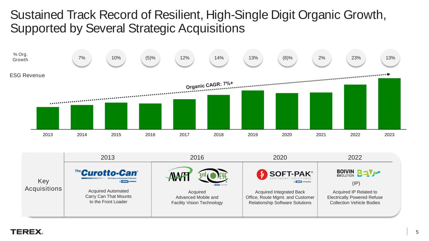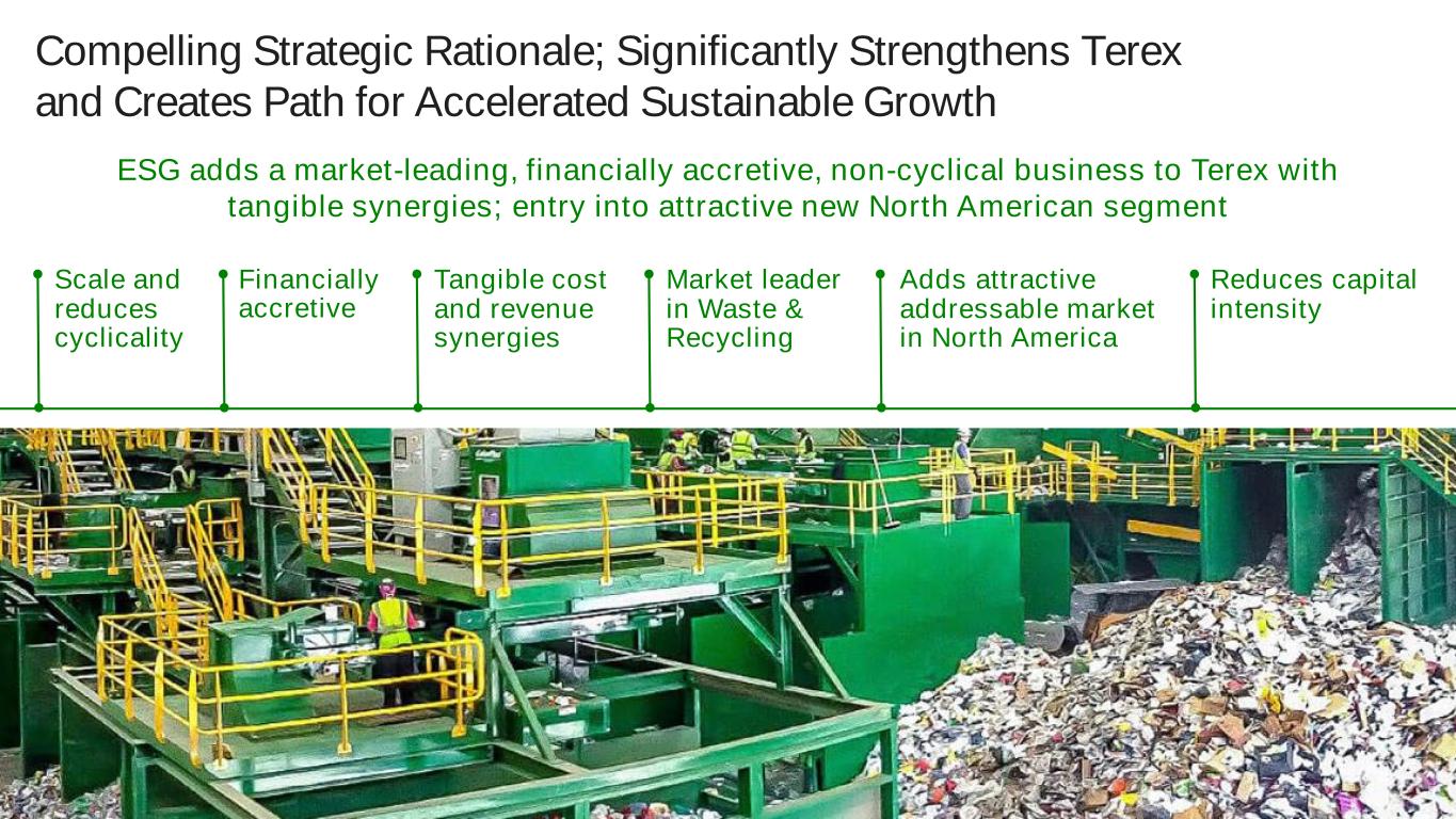 4 Compelling Strategic Rationale; Significantly Strengthens Terex and Creates Path for Accelerated Sustainable Growth Adds attractive addressable market in North America Financially accretive Scale and reduces cyclicality Tangible cost and revenue synergies Market leader in Waste & Recycling Reduces capital intensity ESG adds a market-leading, financially accretive, non-cyclical business to Terex with tangible synergies; entry into attractive new North American segment