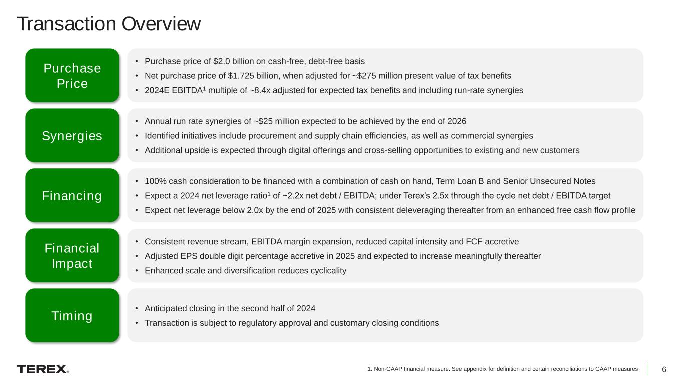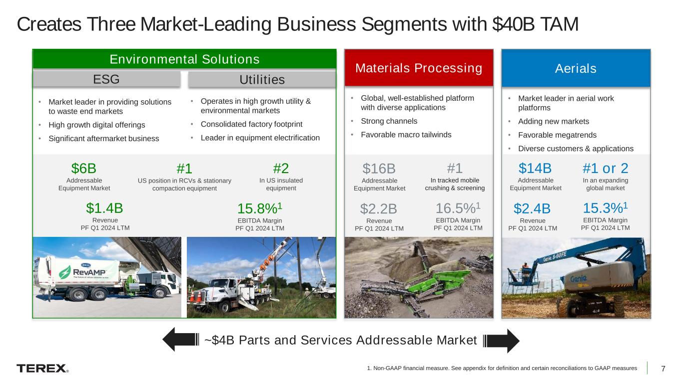 6 Purchase Price • Purchase price of $2.0 billion on cash-free, debt-free basis • Net purchase price of $1.725 billion, when adjusted for ~$275 million present value of tax benefits • 2024E EBITDA1 multiple of ~8.4x adjusted for expected tax benefits and including run-rate synergies Synergies • Annual run rate synergies of ~$25 million expected to be achieved by the end of 2026 • Identified initiatives include procurement and supply chain efficiencies, as well as commercial synergies • Additional upside is expected through digital offerings and cross-selling opportunities to existing and new customers Financial Impact • Consistent revenue stream, EBITDA margin expansion, reduced capital intensity and FCF accretive • Adjusted EPS double digit percentage accretive in 2025 and expected to increase meaningfully thereafter • Enhanced scale and diversification reduces cyclicality Timing • Anticipated closing in the second half of 2024 • Transaction is subject to regulatory approval and customary closing conditions Financing • 100% cash consideration to be financed with a combination of cash on hand, Term Loan B and Senior Unsecured Notes • Expect a 2024 net leverage ratio1 of ~2.2x net debt / EBITDA; under Terex’s 2.5x through the cycle net debt / EBITDA target • Expect net leverage below 2.0x by the end of 2025 with consistent deleveraging thereafter from an enhanced free cash flow profile Transaction Overview 1. Non-GAAP financial measure. See appendix for definition and certain reconciliations to GAAP measures