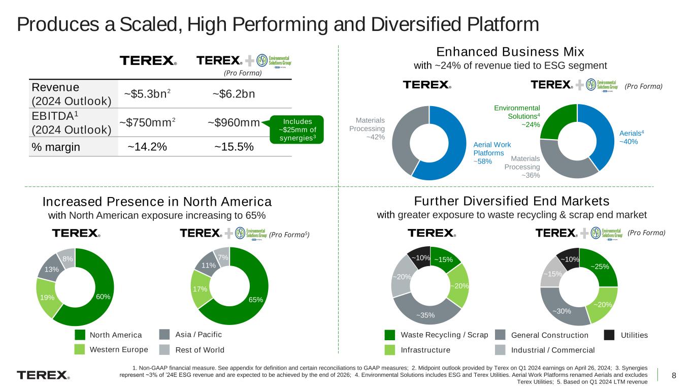 7 Materials Processing Utilities Environmental Solutions ESG Aerials • Market leader in providing solutions to waste end markets • High growth digital offerings • Significant aftermarket business $6B Addressable Equipment Market $1.4B Revenue PF Q1 2024 LTM • Operates in high growth utility & environmental markets • Consolidated factory footprint • Leader in equipment electrification #2 In US insulated equipment Creates Three Market-Leading Business Segments with $40B TAM • Market leader in aerial work platforms • Adding new markets • Favorable megatrends • Diverse customers & applications $14B Addressable Equipment Market #1 or 2 In an expanding global market $2.4B Revenue PF Q1 2024 LTM 15.3%1 EBITDA Margin PF Q1 2024 LTM • Global, well-established platform with diverse applications • Strong channels • Favorable macro tailwinds $16B Addressable Equipment Market #1 In tracked mobile crushing & screening $2.2B Revenue PF Q1 2024 LTM 16.5%1 EBITDA Margin PF Q1 2024 LTM #1 US position in RCVs & stationary compaction equipment 15.8%1 EBITDA Margin PF Q1 2024 LTM ~$4B Parts and Services Addressable Market 1. Non-GAAP financial measure. See appendix for definition and certain reconciliations to GAAP measures