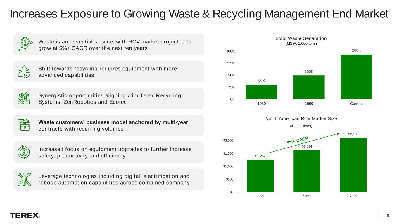 8 Aerial Work Platforms ~58% Materials Processing ~42% ~15% ~20% ~35% ~20% ~10% 65% 17% 11% 7% 60%19% 13% 8% Produces a Scaled, High Performing and Diversified Platform Aerials4 ~40% Materials Processing ~36% Environmental Solutions4 ~24% Enhanced Business Mix with ~24% of revenue tied to ESG segment (Pro Forma) (Pro Forma)(Pro Forma5) ~25% ~20% ~30% ~15% ~10% Infrastructure Waste Recycling / Scrap General Construction Industrial / Commercial Utilities Further Diversified End Markets with greater exposure to waste recycling & scrap end market Revenue (2024 Outlook) ~$5.3bn2 ~$6.2bn EBITDA1 (2024 Outlook) ~$750mm2 ~$960mm % margin ~14.2% ~15.5% (Pro Forma) North America Western Europe Asia / Pacific Rest of World Increased Presence in North America with North American exposure increasing to 65% Includes ~$25mm of synergies3 1. Non-GAAP financial measure. See appendix for definition and certain reconciliations to GAAP measures; 2. Midpoint outlook provided by Terex on Q1 2024 earnings on April 26, 2024; 3. Synergies represent ~3% of ’24E ESG revenue and are expected to be achieved by the end of 2026; 4. Environmental Solutions includes ESG and Terex Utilities. Aerial Work Platforms renamed Aerials and excludes Terex Utilities; 5. Based on Q1 2024 LTM revenue