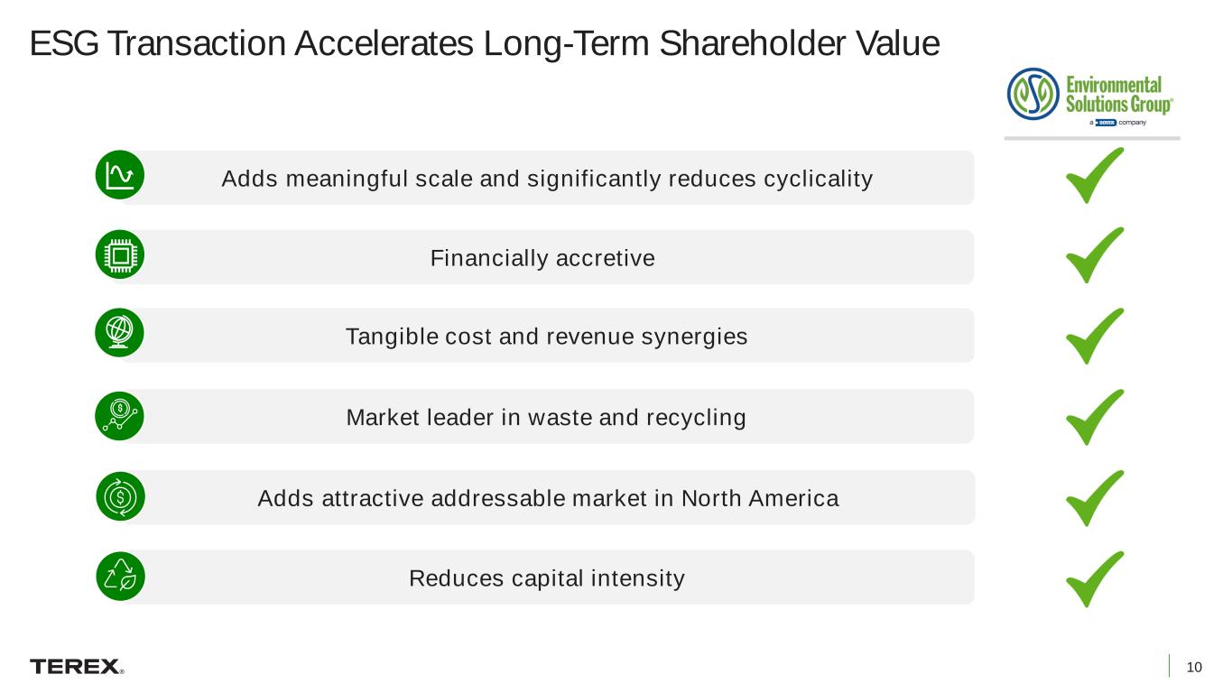 9 Increases Exposure to Growing Waste & Recycling Management End Market Waste customers’ business model anchored by multi-year contracts with recurring volumes Waste is an essential service, with RCV market projected to grow at 5%+ CAGR over the next ten years Synergistic opportunities aligning with Terex Recycling Systems, ZenRobotics and Ecotec Increased focus on equipment upgrades to further increase safety, productivity and efficiency Leverage technologies including digital, electrification and robotic automation capabilities across combined company Shift towards recycling requires equipment with more advanced capabilities Solid Waste Generation 90K 150K 280K 0K 75K 150K 225K 300K 1960 1990 Current (MSW, 1,000 tons) ($ in millions) North American RCV Market Size $1,262 $1,634 $2,108 $0 $500 $1,000 $1,500 $2,000 2023 2028 2033