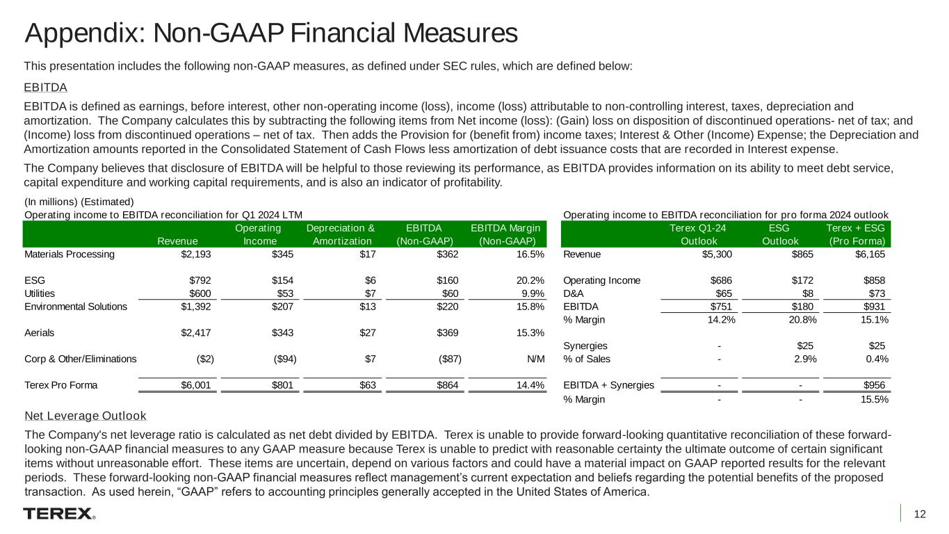 12 Appendix: Non-GAAP Financial Measures This presentation includes the following non-GAAP measures, as defined under SEC rules, which are defined below: EBITDA EBITDA is defined as earnings, before interest, other non-operating income (loss), income (loss) attributable to non-controlling interest, taxes, depreciation and amortization. The Company calculates this by subtracting the following items from Net income (loss): (Gain) loss on disposition of discontinued operations- net of tax; and (Income) loss from discontinued operations – net of tax. Then adds the Provision for (benefit from) income taxes; Interest & Other (Income) Expense; the Depreciation and Amortization amounts reported in the Consolidated Statement of Cash Flows less amortization of debt issuance costs that are recorded in Interest expense. The Company believes that disclosure of EBITDA will be helpful to those reviewing its performance, as EBITDA provides information on its ability to meet debt service, capital expenditure and working capital requirements, and is also an indicator of profitability. Net Leverage Outlook The Company's net leverage ratio is calculated as net debt divided by EBITDA. Terex is unable to provide forward-looking quantitative reconciliation of these forward- looking non-GAAP financial measures to any GAAP measure because Terex is unable to predict with reasonable certainty the ultimate outcome of certain significant items without unreasonable effort. These items are uncertain, depend on various factors and could have a material impact on GAAP reported results for the relevant periods. These forward-looking non-GAAP financial measures reflect management’s current expectation and beliefs regarding the potential benefits of the proposed transaction. As used herein, “GAAP” refers to accounting principles generally accepted in the United States of America. (In millions) (Estimated) Operating income to EBITDA reconciliation for Q1 2024 LTM Operating income to EBITDA reconciliation for pro forma 2024 outlook Revenue Operating Income Depreciation & Amortization EBITDA (Non-GAAP) EBITDA Margin (Non-GAAP) Terex Q1-24 Outlook ESG Outlook Terex + ESG (Pro Forma) Materials Processing $2,193 $345 $17 $362 16.5% Revenue $5,300 $865 $6,165 ESG $792 $154 $6 $160 20.2% Operating Income $686 $172 $858 Utilities $600 $53 $7 $60 9.9% D&A $65 $8 $73 Environmental Solutions $1,392 $207 $13 $220 15.8% EBITDA $751 $180 $931 % Margin 14.2% 20.8% 15.1% Aerials $2,417 $343 $27 $369 15.3% Synergies - $25 $25 Corp & Other/Eliminations ($2) ($94) $7 ($87) N/M % of Sales - 2.9% 0.4% Terex Pro Forma $6,001 $801 $63 $864 14.4% EBITDA + Synergies - - $956 % Margin - - 15.5%