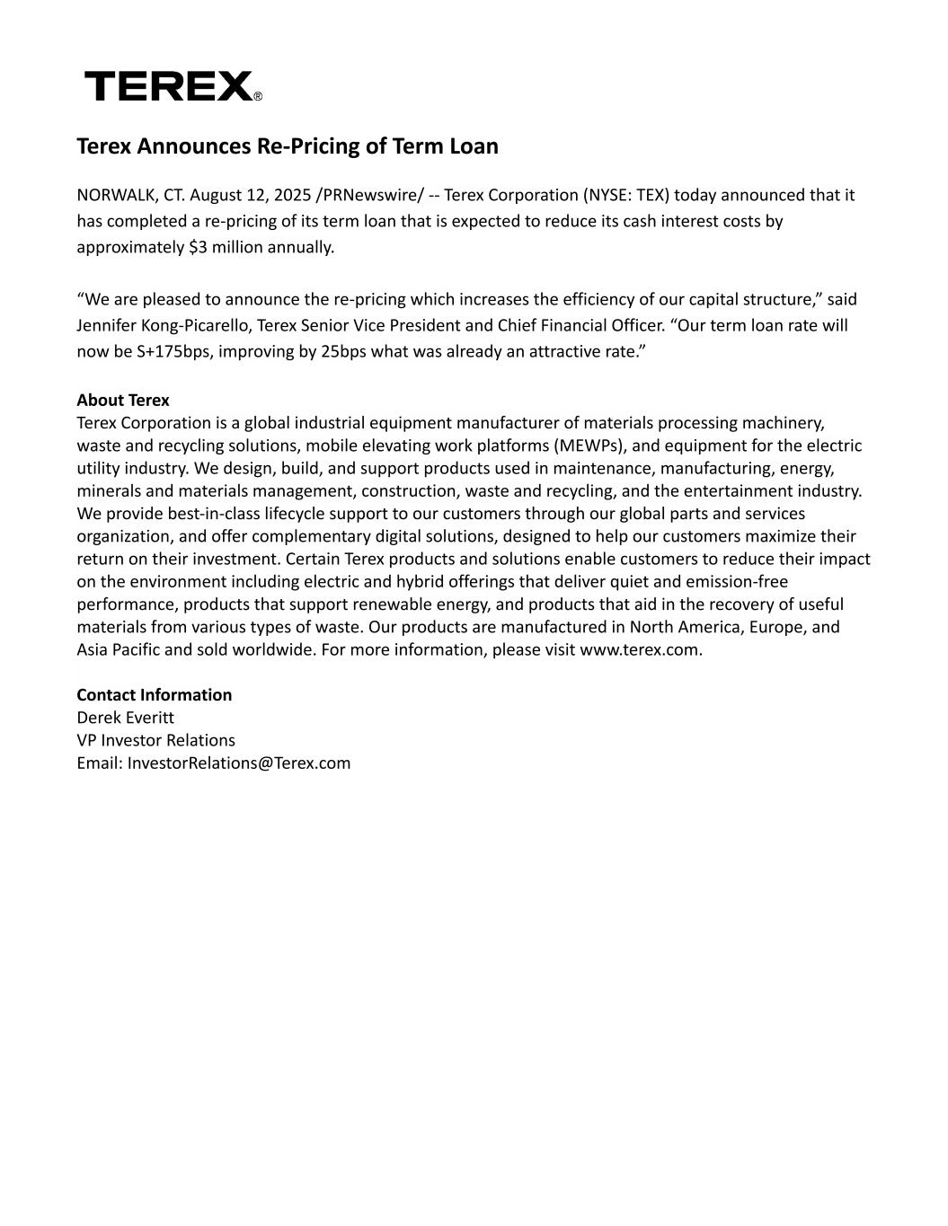 Terex Announces Re-Pricing of Term Loan NORWALK, CT. August 12, 2025 /PRNewswire/ -- Terex Corporation (NYSE: TEX) today announced that it has completed a re-pricing of its term loan that is expected to reduce its cash interest costs by approximately $3 million annually. “We are pleased to announce the re-pricing which increases the efficiency of our capital structure,” said Jennifer Kong-Picarello, Terex Senior Vice President and Chief Financial Officer. “Our term loan rate will now be S+175bps, improving by 25bps what was already an attractive rate.” About Terex Terex Corporation is a global industrial equipment manufacturer of materials processing machinery, waste and recycling solutions, mobile elevating work platforms (MEWPs), and equipment for the electric utility industry. We design, build, and support products used in maintenance, manufacturing, energy, minerals and materials management, construction, waste and recycling, and the entertainment industry. We provide best-in-class lifecycle support to our customers through our global parts and services organization, and offer complementary digital solutions, designed to help our customers maximize their return on their investment. Certain Terex products and solutions enable customers to reduce their impact on the environment including electric and hybrid offerings that deliver quiet and emission-free performance, products that support renewable energy, and products that aid in the recovery of useful materials from various types of waste. Our products are manufactured in North America, Europe, and Asia Pacific and sold worldwide. For more information, please visit www.terex.com.   Contact Information Derek Everitt VP Investor Relations Email: InvestorRelations@Terex.com