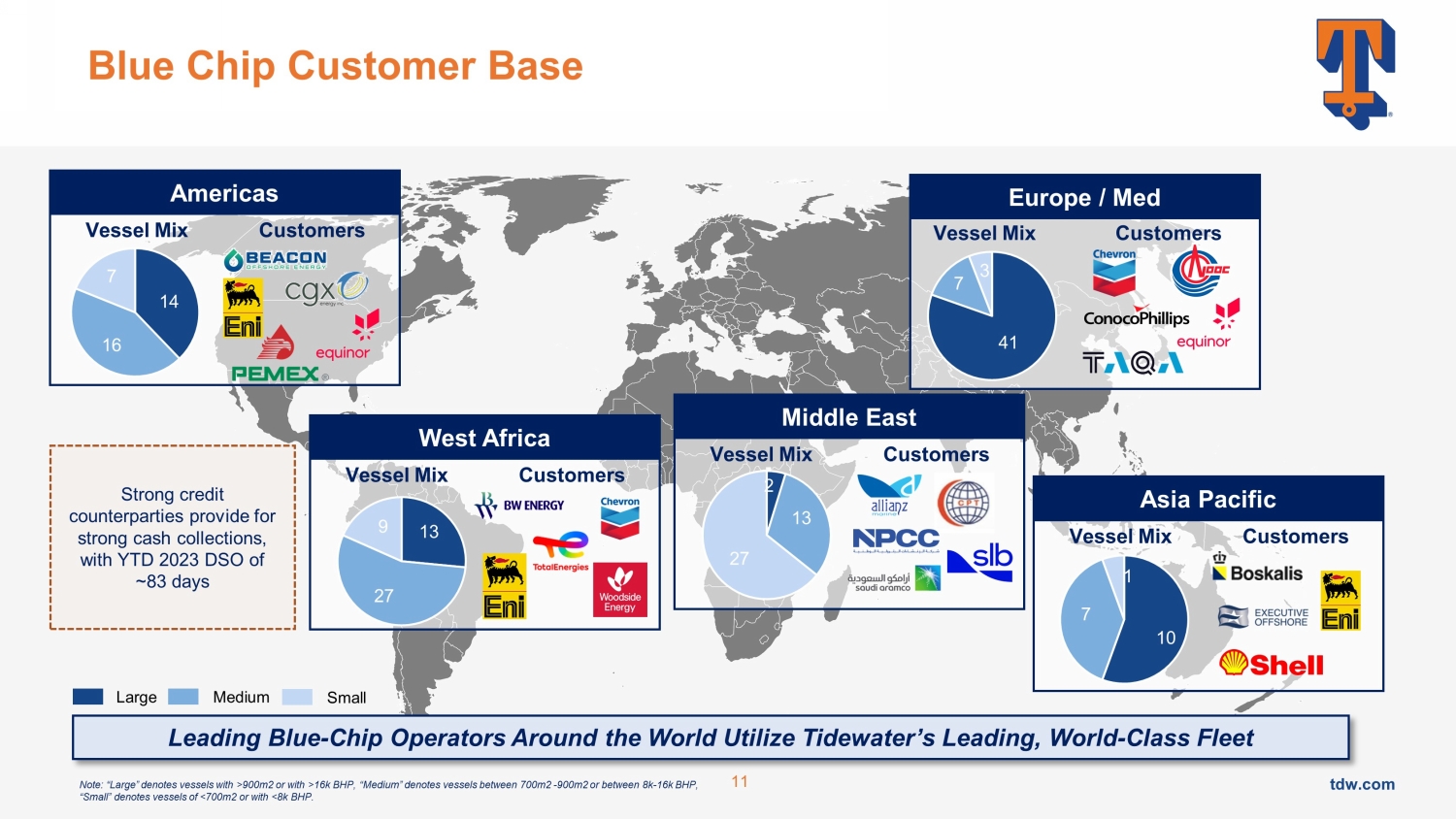 tdw.com tdw.com Blue Chip Customer Base Vessel Mix Customers Asia Pacific Vessel Mix Customers West Africa Vessel Mix Customers Americas Large Medium Vessel Mix Customers Europe / Med Leading Blue - Chip Operators Around the World Utilize Tidewater’s Leading, World - Class Fleet 11 Vessel Mix Customers Middle East Small 14 16 7 13 27 9 41 7 3 2 13 27 10 7 1 Strong credit counterparties provide for strong cash collections, with YTD 2023 DSO of ~83 days Note: “Large” denotes vessels with >900m2 or with >16k BHP, “Medium” denotes vessels between 700m2 - 900m2 or between 8k - 16k BHP, “Small” denotes vessels of <700m2 or with <8k BHP.