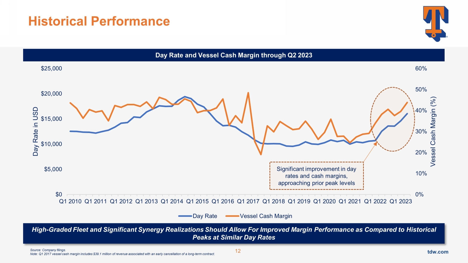 tdw.com tdw.com Historical Performance 12 Source: Company filings. Note: Q1 2017 vessel cash margin includes $39.1 million of revenue associated with an early cancellation of a long - term contract . 0% 10% 20% 30% 40% 50% 60% $0 $5,000 $10,000 $15,000 $20,000 $25,000 Q1 2010 Q1 2011 Q1 2012 Q1 2013 Q1 2014 Q1 2015 Q1 2016 Q1 2017 Q1 2018 Q1 2019 Q1 2020 Q1 2021 Q1 2022 Q1 2023 Vessel Cash Margin (%) Day Rate in USD Day Rate Vessel Cash Margin Day Rate and Vessel Cash Margin through Q2 2023 High - Graded Fleet and Significant Synergy Realizations Should Allow For Improved Margin Performance as Compared to Historical Peaks at Similar Day Rates Significant improvement in day rates and cash margins, approaching prior peak levels