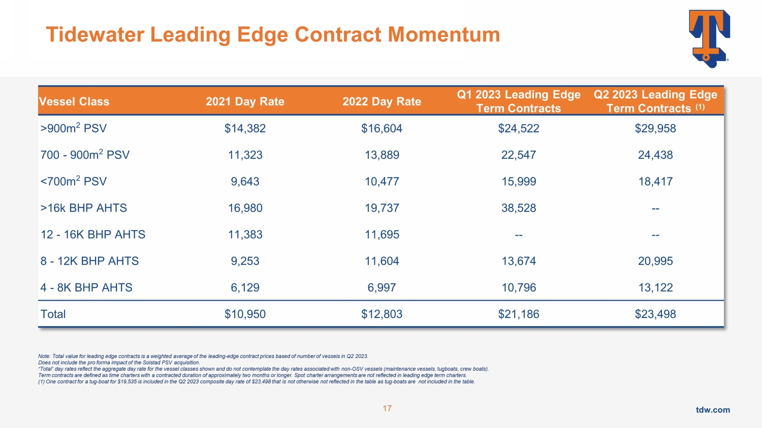 tdw.com tdw.com Tidewater Leading Edge Contract Momentum 17 Vessel Class 2021 Day Rate 2022 Day Rate Q1 2023 Leading Edge Term Contracts Q2 2023 Leading Edge Term Contracts (1) >900m 2 PSV $14,382 $16,604 $24,522 $29,958 700 - 900m 2 PSV 11,323 13,889 22,547 24,438 <700m 2 PSV 9,643 10,477 15,999 18,417 >16k BHP AHTS 16,980 19,737 38,528 -- 12 - 16K BHP AHTS 11,383 11,695 -- -- 8 - 12K BHP AHTS 9,253 11,604 13,674 20,995 4 - 8K BHP AHTS 6,129 6,997 10,796 13,122 Total $10,950 $12,803 $21,186 $23,498 Note: Total value for leading edge contracts is a weighted average of the leading - edge contract prices based of number of vessel s in Q2 2023. Does not include the pro forma impact of the Solstad PSV acquisition. “Total” day rates reflect the aggregate day rate for the vessel classes shown and do not contemplate the day rates associated wi th non - OSV vessels (maintenance vessels, tugboats, crew boats). Term contracts are defined as time charters with a contracted duration of approximately two months or longer. Spot charter ar ran gements are not reflected in leading edge term charters. (1) One contract for a tug - boat for $19,535 is included in the Q2 2023 composite day rate of $23,498 that is not otherwise not r eflected in the table as tug - boats are not included in the table.