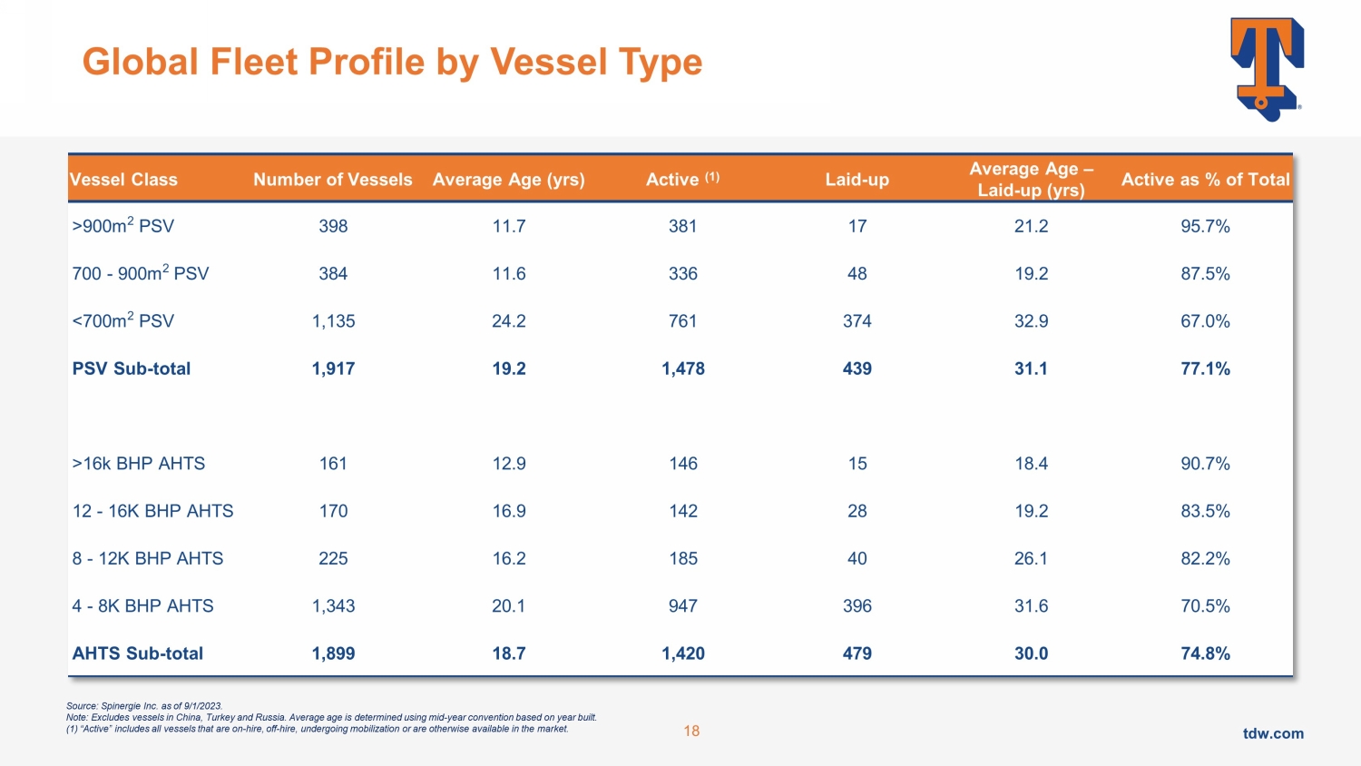 tdw.com tdw.com Global Fleet Profile by Vessel Type 18 Vessel Class Number of Vessels Average Age ( yrs ) Active (1) Laid - up Average Age – Laid - up ( yrs ) Active as % of Total >900m 2 PSV 398 11.7 381 17 21.2 95.7% 700 - 900m 2 PSV 384 11.6 336 48 19.2 87.5% <700m 2 PSV 1,135 24.2 761 374 32.9 67.0% PSV Sub - total 1,917 19.2 1,478 439 31.1 77.1% >16k BHP AHTS 161 12.9 146 15 18.4 90.7% 12 - 16K BHP AHTS 170 16.9 142 28 19.2 83.5% 8 - 12K BHP AHTS 225 16.2 185 40 26.1 82.2% 4 - 8K BHP AHTS 1,343 20.1 947 396 31.6 70.5% AHTS Sub - total 1,899 18.7 1,420 479 30.0 74.8% Source: Spinergie Inc. as of 9/ 1/2023. Note: Excludes vessels in China, Turkey and Russia. Average age is determined using mid - year convention based on year built. (1) “Active” includes all vessels that are on - hire, off - hire, undergoing mobilization or are otherwise available in the market.