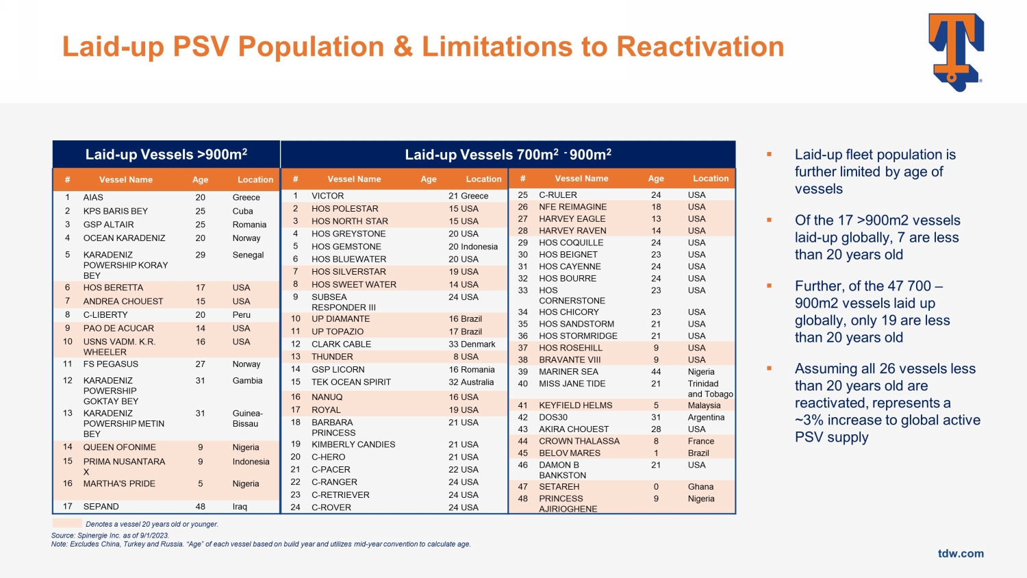 tdw.com tdw.com Laid - up PSV Population & Limitations to Reactivation # Vessel Name Age Location 1 AIAS 20 Greece 2 KPS BARIS BEY 25 Cuba 3 GSP ALTAIR 25 Romania 4 OCEAN KARADENIZ 20 Norway 5 KARADENIZ POWERSHIP KORAY BEY 29 Senegal 6 HOS BERETTA 17 USA 7 ANDREA CHOUEST 15 USA 8 C - LIBERTY 20 Peru 9 PAO DE ACUCAR 14 USA 10 USNS VADM. K.R. WHEELER 16 USA 11 FS PEGASUS 27 Norway 12 KARADENIZ POWERSHIP GOKTAY BEY 31 Gambia 13 KARADENIZ POWERSHIP METIN BEY 31 Guinea - Bissau 14 QUEEN OFONIME 9 Nigeria 15 PRIMA NUSANTARA X 9 Indonesia 16 MARTHA'S PRIDE 5 Nigeria 17 SEPAND 48 Iraq Laid - up Vessels >900m 2 # Vessel Name Age Location 1 VICTOR 21 Greece 2 HOS POLESTAR 15 USA 3 HOS NORTH STAR 15 USA 4 HOS GREYSTONE 20 USA 5 HOS GEMSTONE 20 Indonesia 6 HOS BLUEWATER 20 USA 7 HOS SILVERSTAR 19 USA 8 HOS SWEET WATER 14 USA 9 SUBSEA RESPONDER III 24 USA 10 UP DIAMANTE 16 Brazil 11 UP TOPAZIO 17 Brazil 12 CLARK CABLE 33 Denmark 13 THUNDER 8 USA 14 GSP LICORN 16 Romania 15 TEK OCEAN SPIRIT 32 Australia 16 NANUQ 16 USA 17 ROYAL 19 USA 18 BARBARA PRINCESS 21 USA 19 KIMBERLY CANDIES 21 USA 20 C - HERO 21 USA 21 C - PACER 22 USA 22 C - RANGER 24 USA 23 C - RETRIEVER 24 USA 24 C - ROVER 24 USA # Vessel Name Age Location 25 C - RULER 24 USA 26 NFE REIMAGINE 18 USA 27 HARVEY EAGLE 13 USA 28 HARVEY RAVEN 14 USA 29 HOS COQUILLE 24 USA 30 HOS BEIGNET 23 USA 31 HOS CAYENNE 24 USA 32 HOS BOURRE 24 USA 33 HOS CORNERSTONE 23 USA 34 HOS CHICORY 23 USA 35 HOS SANDSTORM 21 USA 36 HOS STORMRIDGE 21 USA 37 HOS ROSEHILL 9 USA 38 BRAVANTE VIII 9 USA 39 MARINER SEA 44 Nigeria 40 MISS JANE TIDE 21 Trinidad and Tobago 41 KEYFIELD HELMS 5 Malaysia 42 DOS30 31 Argentina 43 AKIRA CHOUEST 28 USA 44 CROWN THALASSA 8 France 45 BELOV MARES 1 Brazil 46 DAMON B BANKSTON 21 USA 47 SETAREH 0 Ghana 48 PRINCESS AJIRIOGHENE 9 Nigeria Laid - up Vessels 700m 2 - 900m 2 Source: Spinergie Inc. as of 9/1/2023. Note: Excludes China, Turkey and Russia. “Age” of each vessel based on build year and utilizes mid - year convention to calculate age. ▪ Laid - up fleet population is further limited by age of vessels ▪ Of the 17 >900m2 vessels laid - up globally, 7 are less than 20 years old ▪ Further, of the 47 700 – 900m2 vessels laid up globally, only 19 are less than 20 years old ▪ Assuming all 26 vessels less than 20 years old are reactivated, represents a ~3% increase to global active PSV supply Denotes a vessel 20 years old or younger.