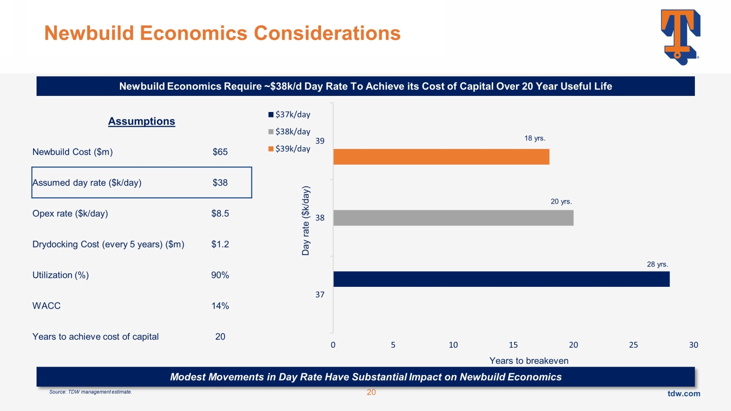 tdw.com tdw.com Newbuild Economics Considerations Assumptions Newbuild Cost ($m) $65 Assumed day rate ($k/day) $38 Opex rate ($k/day) $8.5 Drydocking Cost (every 5 years) ($m) $1.2 Utilization (%) 90% WACC 14% Years to achieve cost of capital 20 Newbuild Economics Require ~$38k/d Day Rate To Achieve its Cost of Capital Over 20 Year Useful Life 20 Source: TDW management estimate. 0 5 10 15 20 25 30 37 38 39 $37k/day $38k/day $39k/day Years to breakeven 28 yrs. Day rate ($k/day) 20 yrs. 18 yrs. Modest Movements in Day Rate Have Substantial Impact on Newbuild Economics