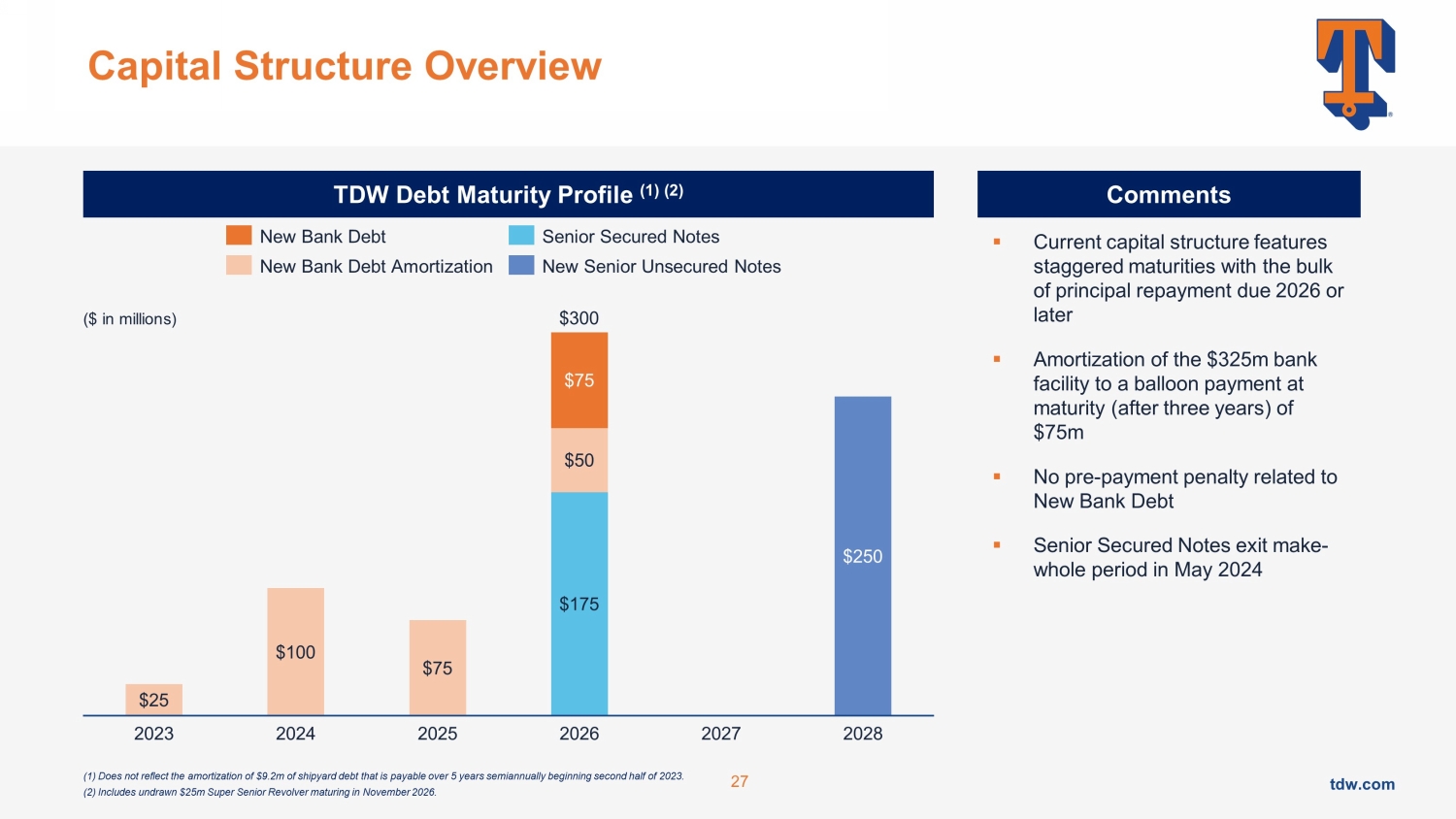 tdw.com tdw.com Capital Structure Overview TDW Debt Maturity Profile (1) (2) 27 $25 $100 $75 $175 $250 $50 $75 2024 2027 2025 2023 2026 2028 $300 New Bank Debt New Bank Debt Amortization Senior Secured Notes New Senior Unsecured Notes Comments ($ in millions) ▪ Current capital structure features staggered maturities with the bulk of principal repayment due 2026 or later ▪ Amortization of the $325m bank facility to a balloon payment at maturity (after three years) of $75m ▪ No pre - payment penalty related to New Bank Debt ▪ Senior Secured Notes exit make - whole period in May 2024 (1) Does not reflect the amortization of $9.2m of shipyard debt that is payable over 5 years semiannually beginning second ha lf of 2023. (2) Includes undrawn $25m Super Senior Revolver maturing in November 2026.