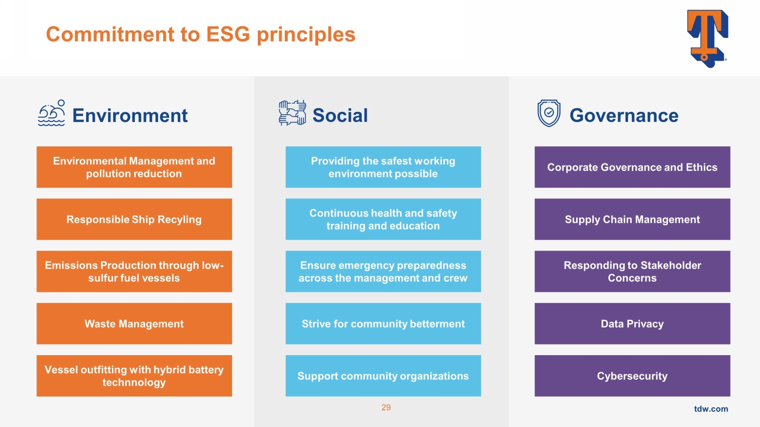 tdw.com tdw.com Commitment to ESG principles Environment Social Governance 29 Environmental Management and pollution reduction Responsible Ship Recyling Emissions Production through low - sulfur fuel vessels Waste Management Vessel outfitting with hybrid battery technnology Providing the safest working environment possible Continuous health and safety training and education Ensure emergency preparedness across the management and crew Strive for community betterment Support community organizations Corporate Governance and Ethics Supply Chain Management Responding to Stakeholder Concerns Data Privacy Cybersecurity