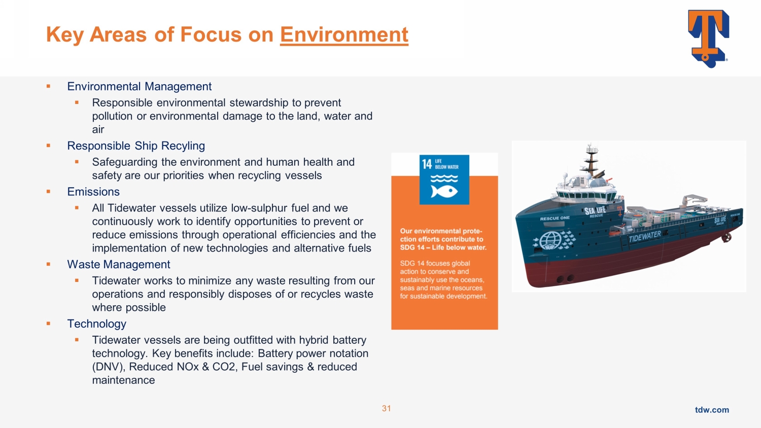tdw.com tdw.com Sustainability Report ▪ Tidewater’s third annual comprehensive and stand - alone sustainability report presenting the company’s ESG performance, along with its management approach to material sustainability topics now available on the company website: https://www.tdw.com/sustainability/sustainability - report/ ▪ Prepared in accordance with: ▪ Global Reporting Initiative (GRI) Standards ▪ Sustainability Accounting Standards Board (SASB) Marine Transportation Standard ▪ Task force on Climate - related Financial Disclosures (TCFD) 30