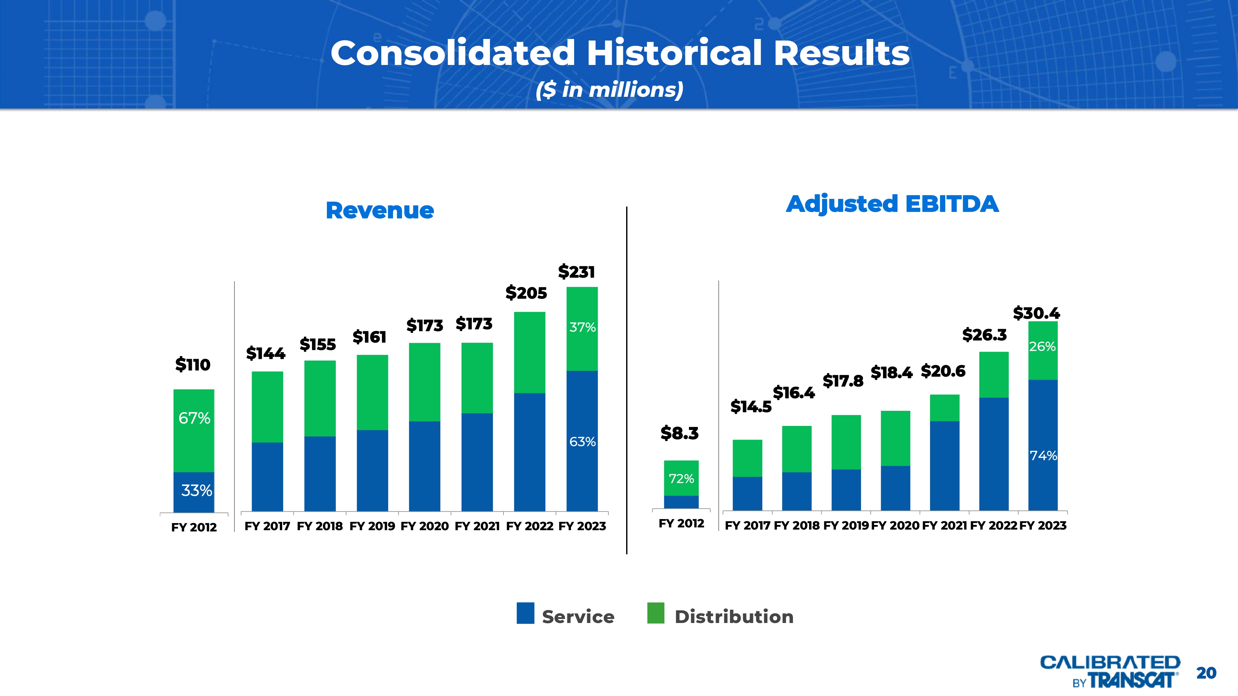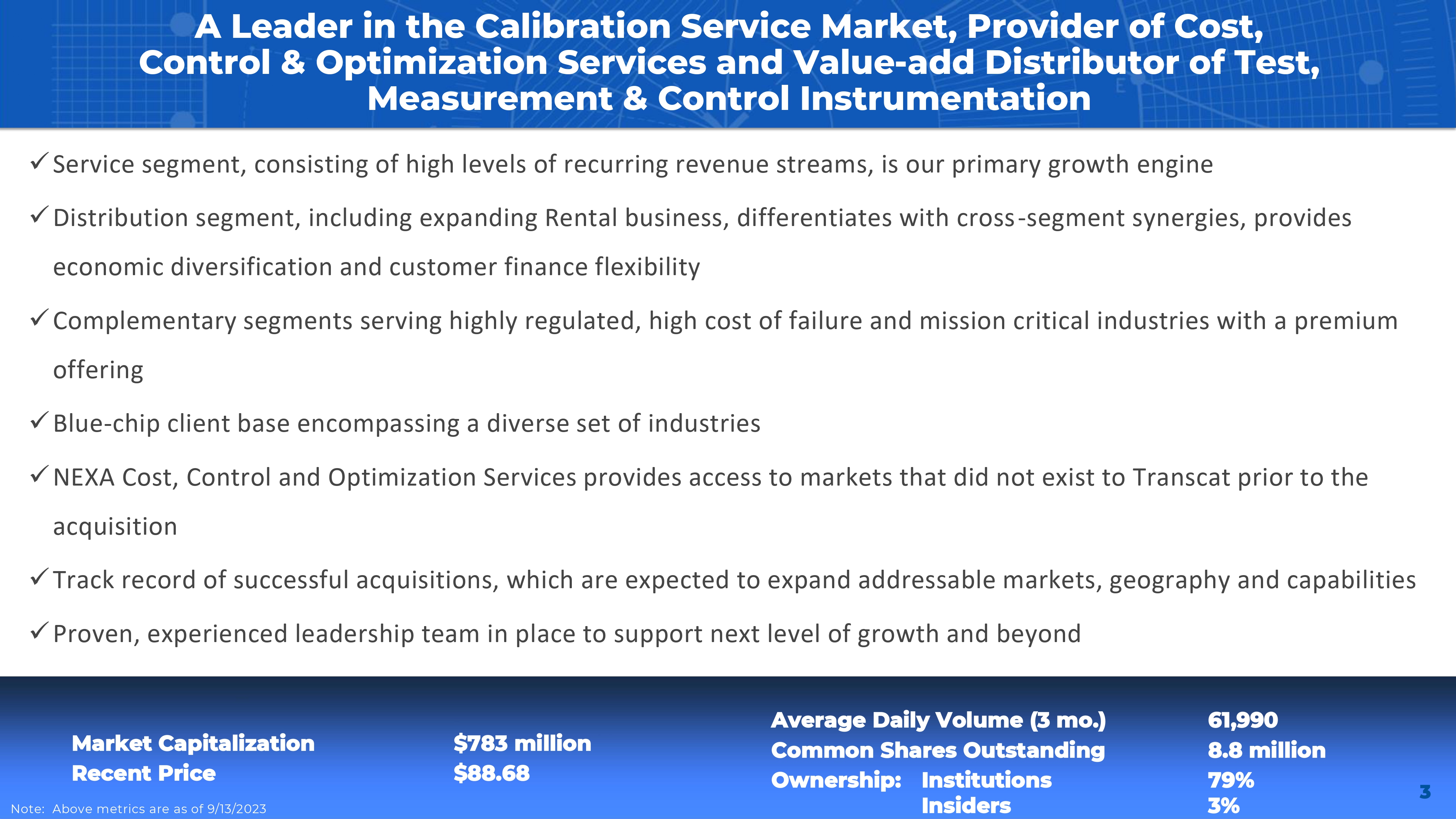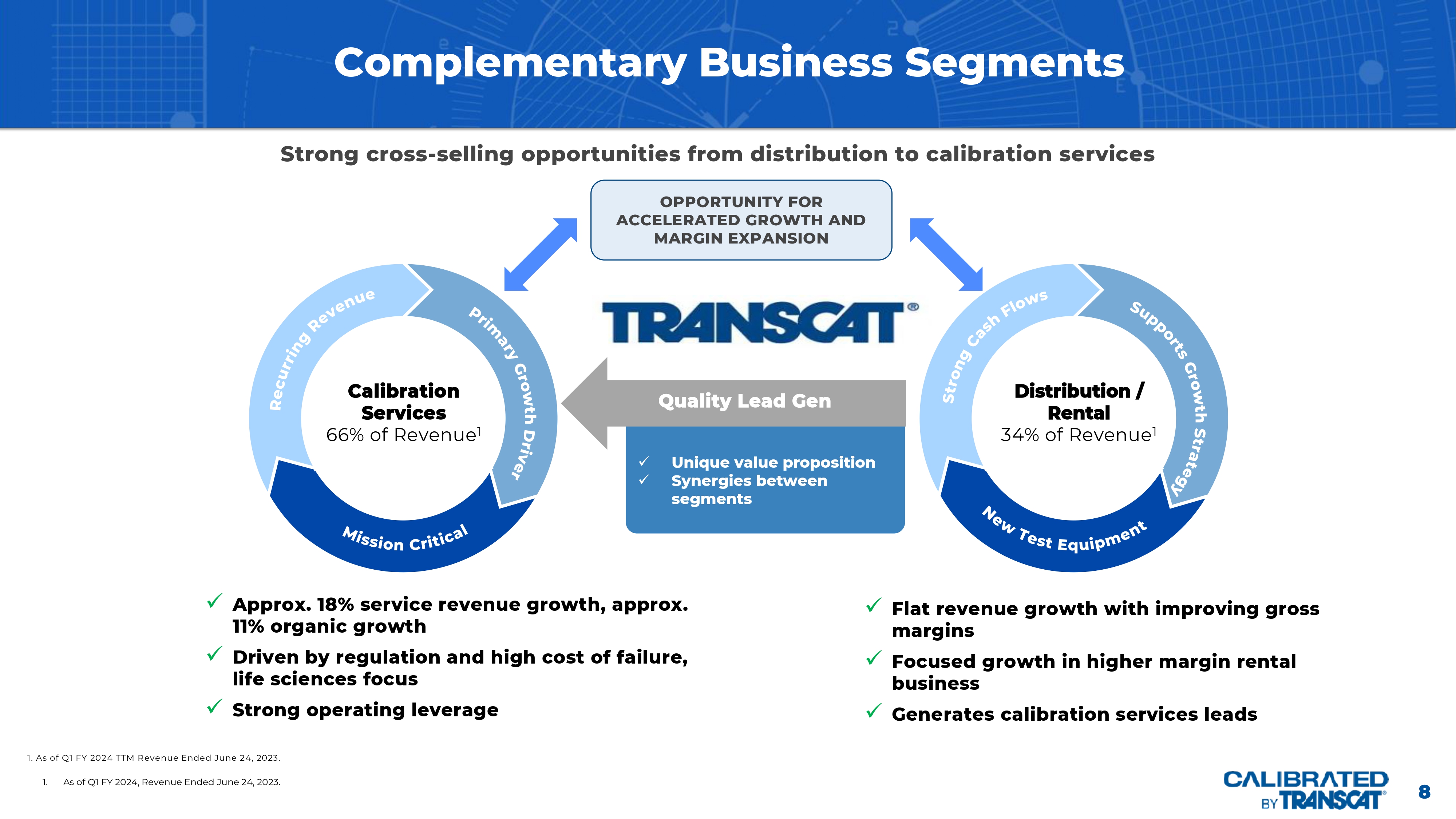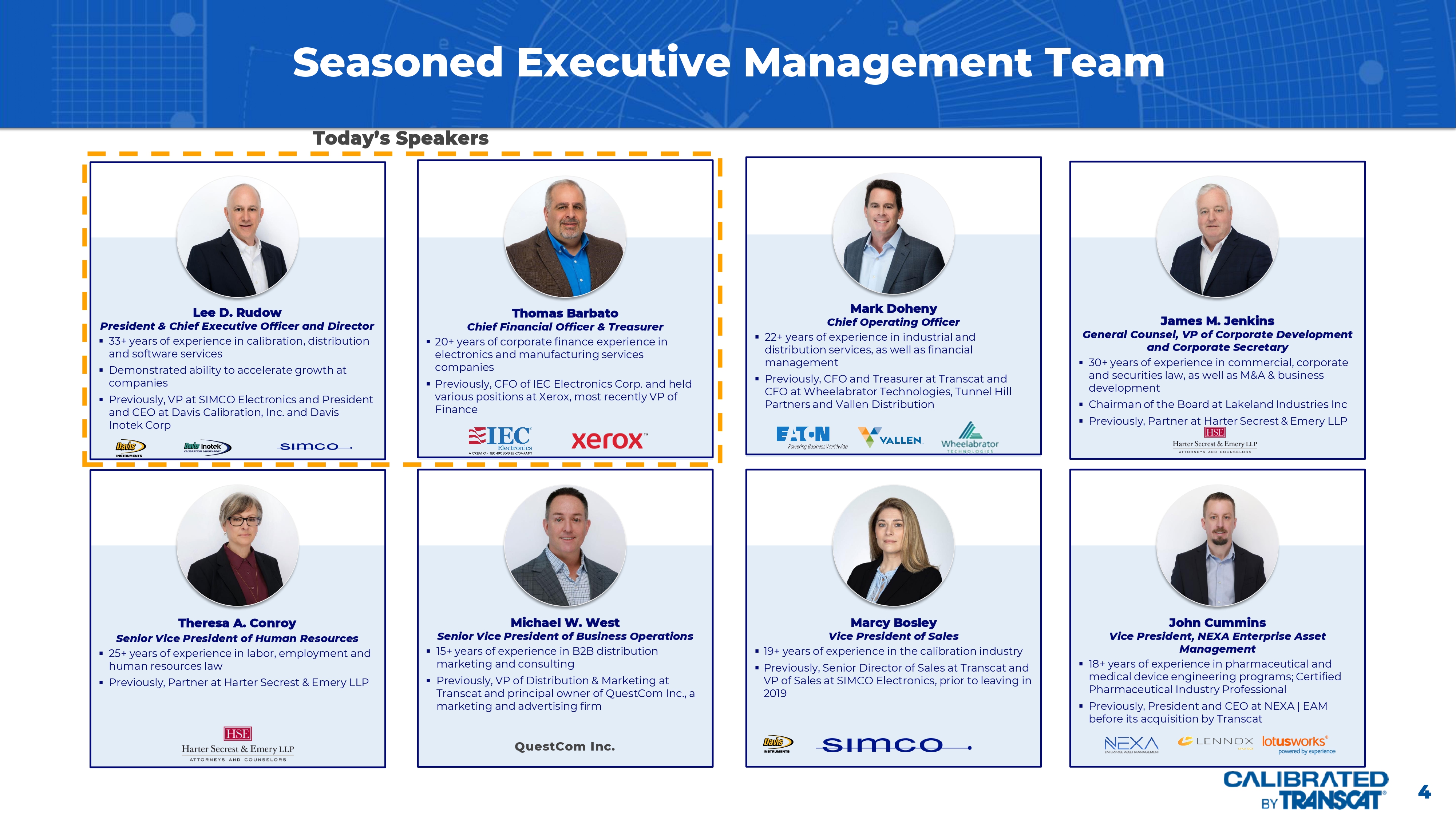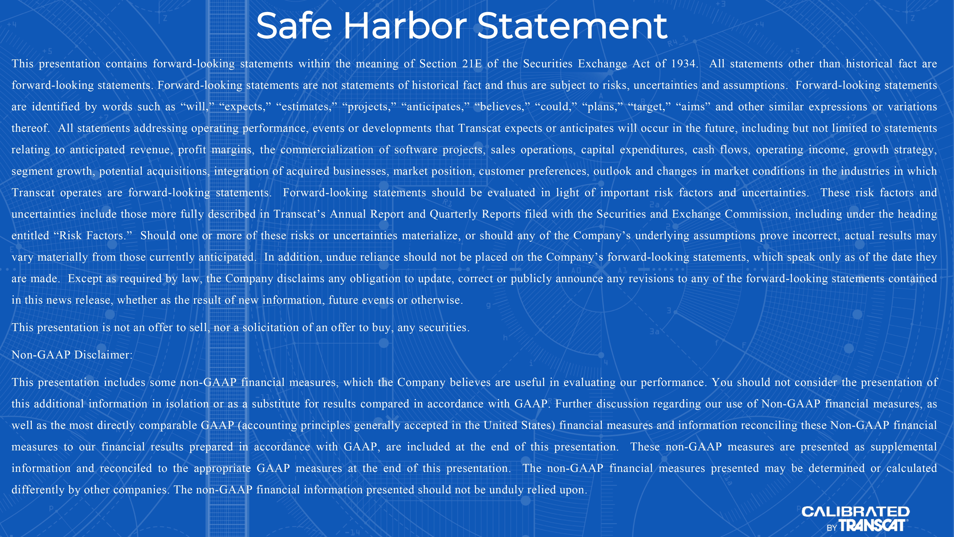 This presentation contains forward - looking statements within the meaning of Section 21 E of the Securities Exchange Act of 1934 . All statements other than historical fact are forward - looking statements . Forward - looking statements are not statements of historical fact and thus are subject to risks, uncertainties and assumptions . Forward - looking statements are identified by words such as “will,” “expects,” “estimates,” “projects,” “anticipates,” “believes,” “could,” “plans,” “target,” “aims” and other similar expressions or variations thereof . All statements addressing operating performance, events or developments that Transcat expects or anticipates will occur in the future, including but not limited to statements relating to anticipated revenue, profit margins, the commercialization of software projects, sales operations, capital expenditures, cash flows, operating income, growth strategy, segment growth, potential acquisitions, integration of acquired businesses, market position, customer preferences, outlook and changes in market conditions in the industries in which Transcat operates are forward - looking statements . Forward - looking statements should be evaluated in light of important risk factors and uncertainties . These risk factors and uncertainties include those more fully described in Transcat’s Annual Report and Quarterly Reports filed with the Securities and Exchange Commission, including under the heading entitled “Risk Factors . ” Should one or more of these risks or uncertainties materialize, or should any of the Company’s underlying assumptions prove incorrect, actual results may vary materially from those currently anticipated . In addition, undue reliance should not be placed on the Company’s forward - looking statements, which speak only as of the date they are made . Except as required by law, the Company disclaims any obligation to update, correct or publicly announce any revisions to any of the forward - looking statements contained in this news release, whether as the result of new information, future events or otherwise . This presentation is not an offer to sell, nor a solicitation of an offer to buy, any securities . Non - GAAP Disclaimer : This presentation includes some non - GAAP financial measures, which the Company believes are useful in evaluating our performance . You should not consider the presentation of this additional information in isolation or as a substitute for results compared in accordance with GAAP . Further discussion regarding our use of Non - GAAP financial measures, as well as the most directly comparable GAAP (accounting principles generally accepted in the United States) financial measures and information reconciling these Non - GAAP financial measures to our financial results prepared in accordance with GAAP, are included at the end of this presentation . These non - GAAP measures are presented as supplemental information and reconciled to the appropriate GAAP measures at the end of this presentation . The non - GAAP financial measures presented may be determined or calculated differently by other companies . The non - GAAP financial information presented should not be unduly relied upon . Safe Harbor Statement