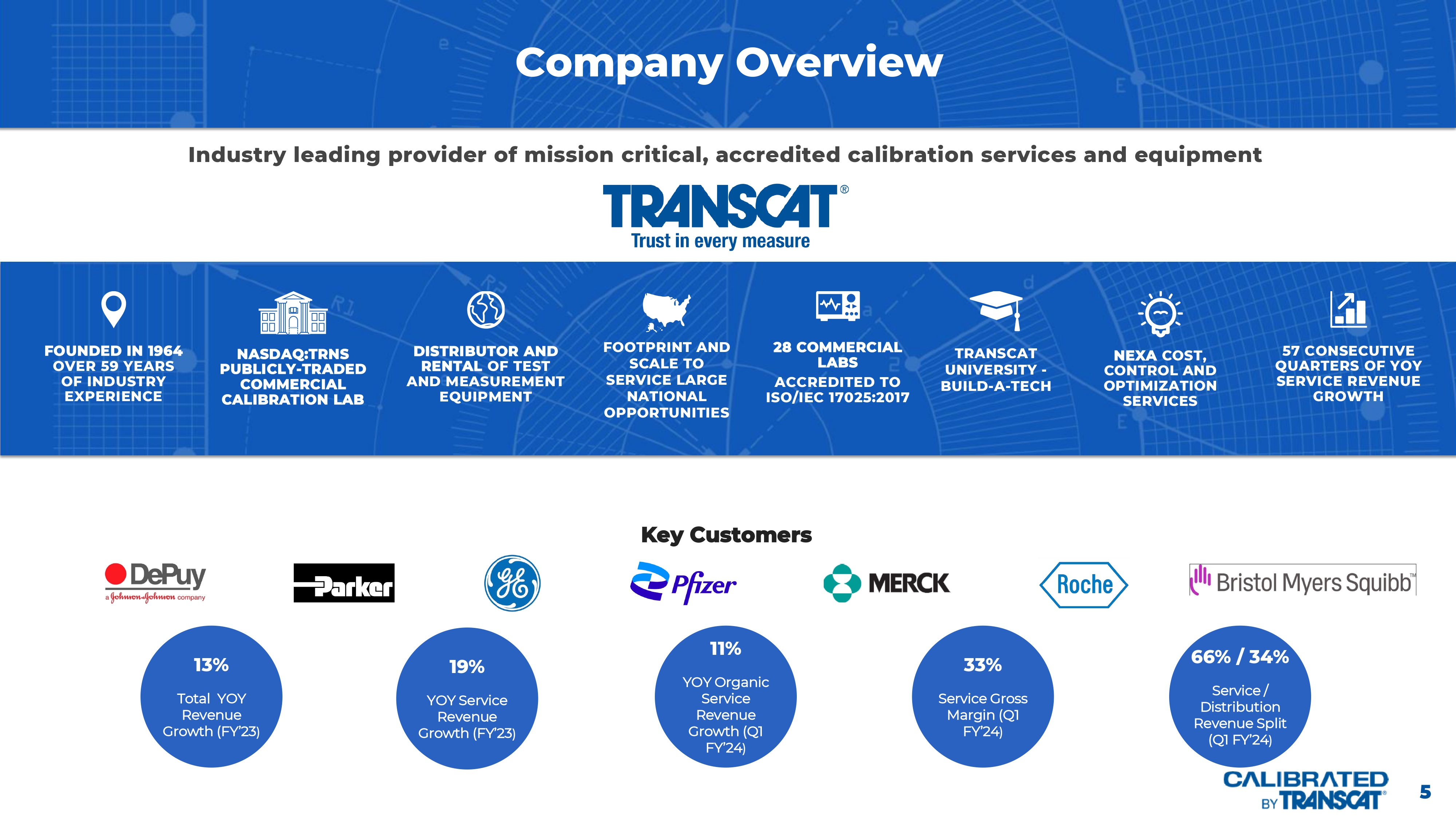 4 Seasoned Executive Management Team Michael W. West Senior Vice President of Business Operations ▪ 15+ years of experience in B2B distribution marketing and consulting ▪ Previously, VP of Distribution & Marketing at Transcat and principal owner of QuestCom Inc., a marketing and advertising firm QuestCom Inc. Mark Doheny Chief Operating Officer ▪ 22+ years of experience in industrial and distribution services, as well as financial management ▪ Previously, CFO and Treasurer at Transcat and CFO at Wheelabrator Technologies, Tunnel Hill Partners and Vallen Distribution Thomas Barbato Chief Financial Officer & Treasurer ▪ 20+ years of corporate finance experience in electronics and manufacturing services companies ▪ Previously, CFO of IEC Electronics Corp. and held various positions at Xerox, most recently VP of Finance Marcy Bosley Vice President of Sales ▪ 19+ years of experience in the calibration industry ▪ Previously, Senior Director of Sales at Transcat and VP of Sales at SIMCO Electronics, prior to leaving in 2019 Theresa A. Conroy Senior Vice President of Human Resources ▪ 25+ years of experience in labor, employment and human resources law ▪ Previously, Partner at Harter Secrest & Emery LLP James M. Jenkins General Counsel, VP of Corporate Development and Corporate Secretary ▪ 30+ years of experience in commercial, corporate and securities law, as well as M&A & business development ▪ Chairman of the Board at Lakeland Industries Inc ▪ Previously , Partner at Harter Secrest & Emery LLP John Cummins Vice President, NEXA Enterprise Asset Management ▪ 18+ years of experience in pharmaceutical and medical device engineering programs; Certified Pharmaceutical Industry Professional ▪ Previously, President and CEO at NEXA | EAM before its acquisition by Transcat Lee D. Rudow President & Chief Executive Officer and Director ▪ 33+ years of experience in calibration, distribution and software services ▪ Demonstrated ability to accelerate growth at companies ▪ Previously, VP at SIMCO Electronics and President and CEO at Davis Calibration, Inc. and Davis Inotek Corp Today’s Speakers