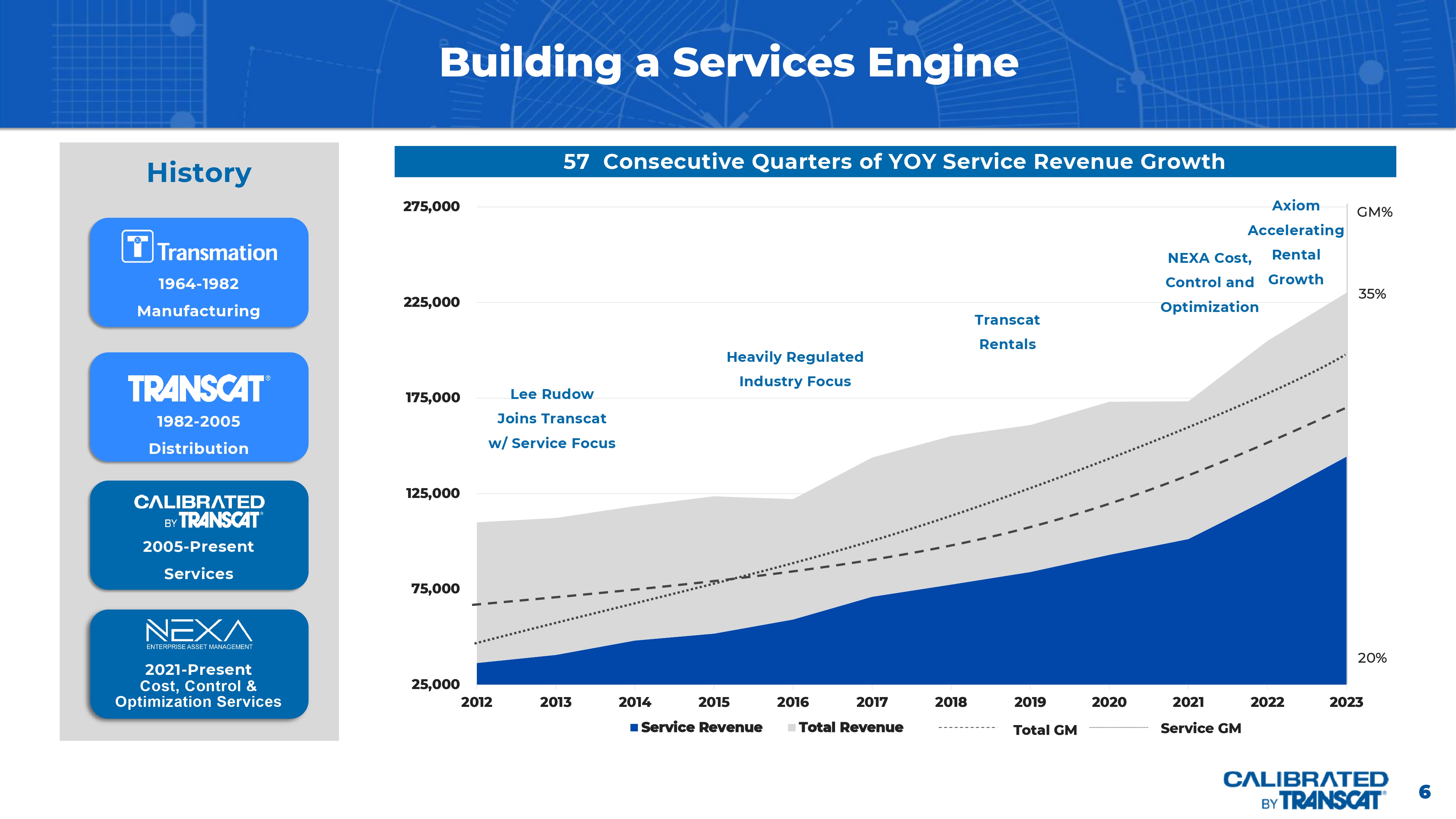 5 Company Overview Industry leading provider of mission critical, accredited calibration services and equipment FOUNDED IN 1964 OVER 59 YEARS OF INDUSTRY EXPERIENCE NASDAQ:TRNS PUBLICLY - TRADED COMMERCIAL CALIBRATION LAB 57 CONSECUTIVE QUARTERS OF YOY SERVICE REVENUE GROWTH NEXA COST, CONTROL AND OPTIMIZATION SERVICES DISTRIBUTOR AND RENTAL OF TEST AND MEASUREMENT EQUIPMENT 28 COMMERCIAL LABS ACCREDITED TO ISO/IEC 17025:2017 FOOTPRINT AND SCALE TO SERVICE LARGE NATIONAL OPPORTUNITIES TRANSCAT UNIVERSITY - BUILD - A - TECH Key Customers 19% YOY Service Revenue Growth (FY’23 ) 11% YOY Organic Service Revenue Growth (Q1 FY’24 ) 13% Total YOY Revenue Growth (FY’23 ) 33% Service Gross Margin (Q1 FY’24 ) 66% / 34% Service / Distribution Revenue Split (Q1 FY’24 )