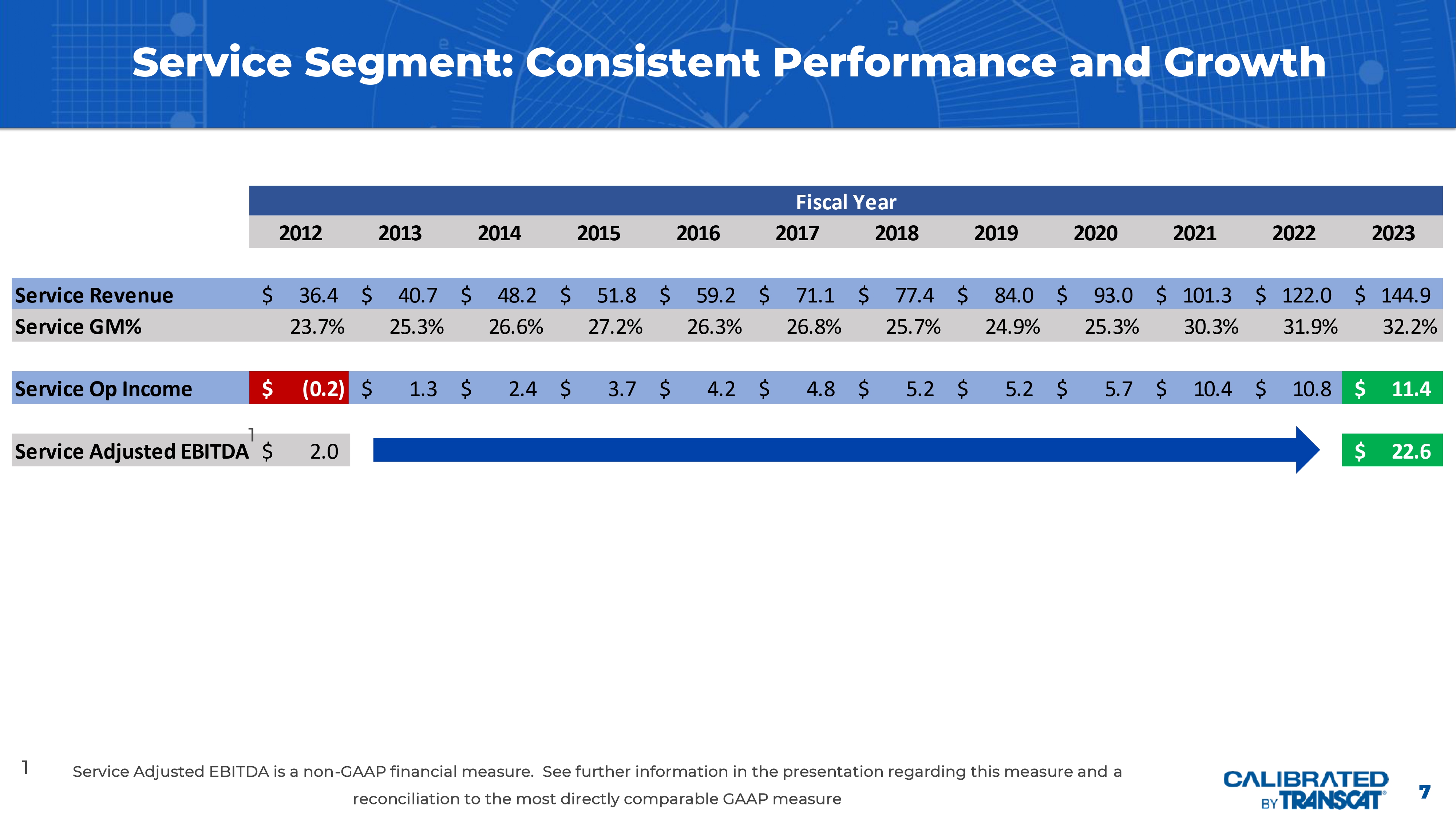 6 History 57 Consecutive Quarters of YOY Service Revenue Growth 25,000 75,000 125,000 175,000 225,000 275,000 2012 2013 2014 2015 2016 2017 2018 2019 2020 2021 2022 2023 Service Revenue Total Revenue Total GM Service GM GM% 35% 20% Lee Rudow Joins Transcat w/ Service Focus Heavily Regulated Industry Focus NEXA Cost, Control and Optimization Transcat Rentals 1964 - 1982 Manufacturing 1982 - 2005 Distribution 2005 - Present Services 2021 - Present Cost, Control & Optimization Services Building a Services Engine Axiom Accelerating Rental Growth