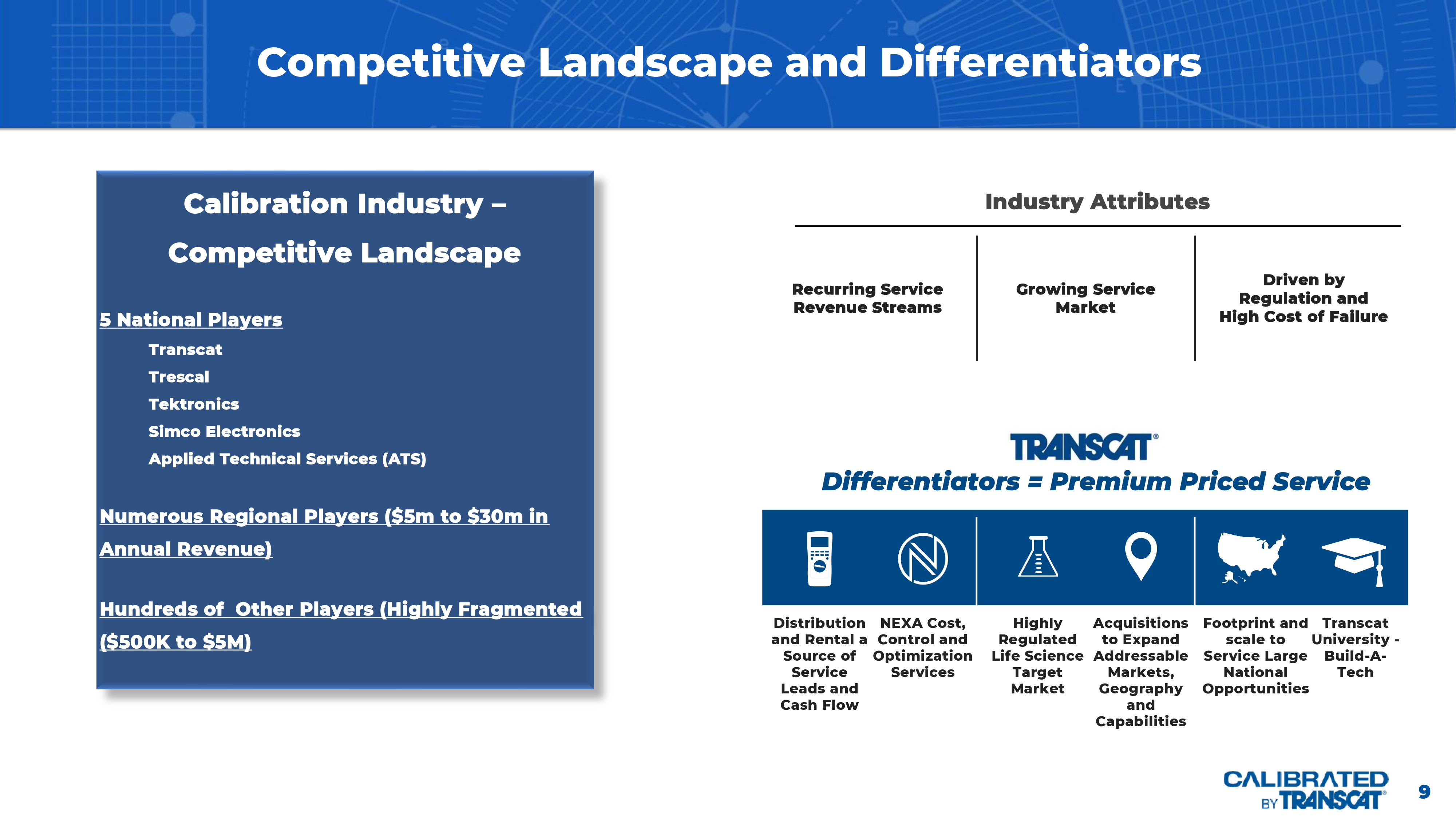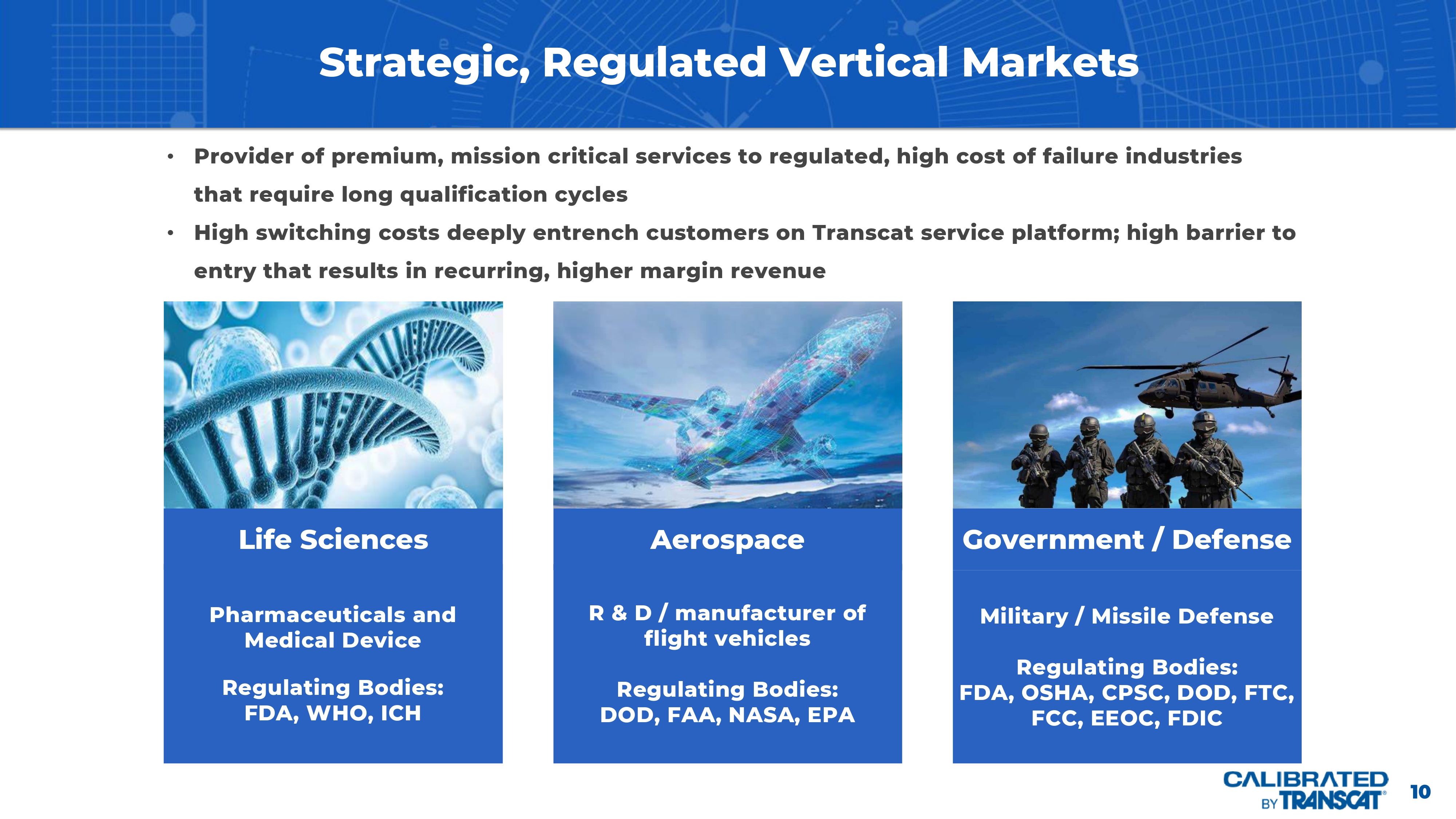 9 Competitive Landscape and Differentiators Industry Attributes Recurring Service Revenue Streams Growing Service Market Driven by Regulation and High Cost of Failure Differentiators = Premium Priced Service Distribution and Rental a Source of Service Leads and Cash Flow NEXA Cost, Control and Optimization Services Highly Regulated Life Science Target Market Acquisitions to Expand Addressable Markets, Geography and Capabilities Footprint and scale to Service Large National Opportunities Transcat University - Build - A - Tech Calibration Industry – Competitive Landscape 5 National Players Transcat Trescal Tektronics Simco Electronics Applied Technical Services (ATS) Numerous Regional Players ($5m to $30m in Annual Revenue) Hundreds of Other Players (Highly Fragmented ($500K to $5M)