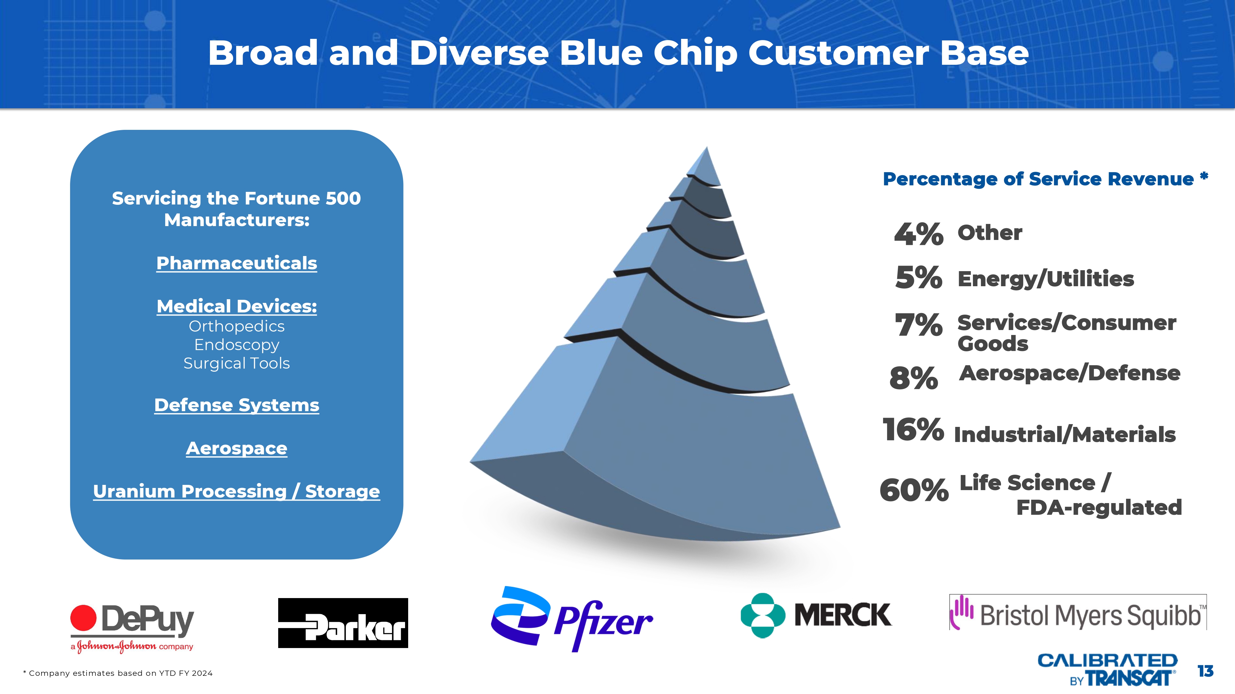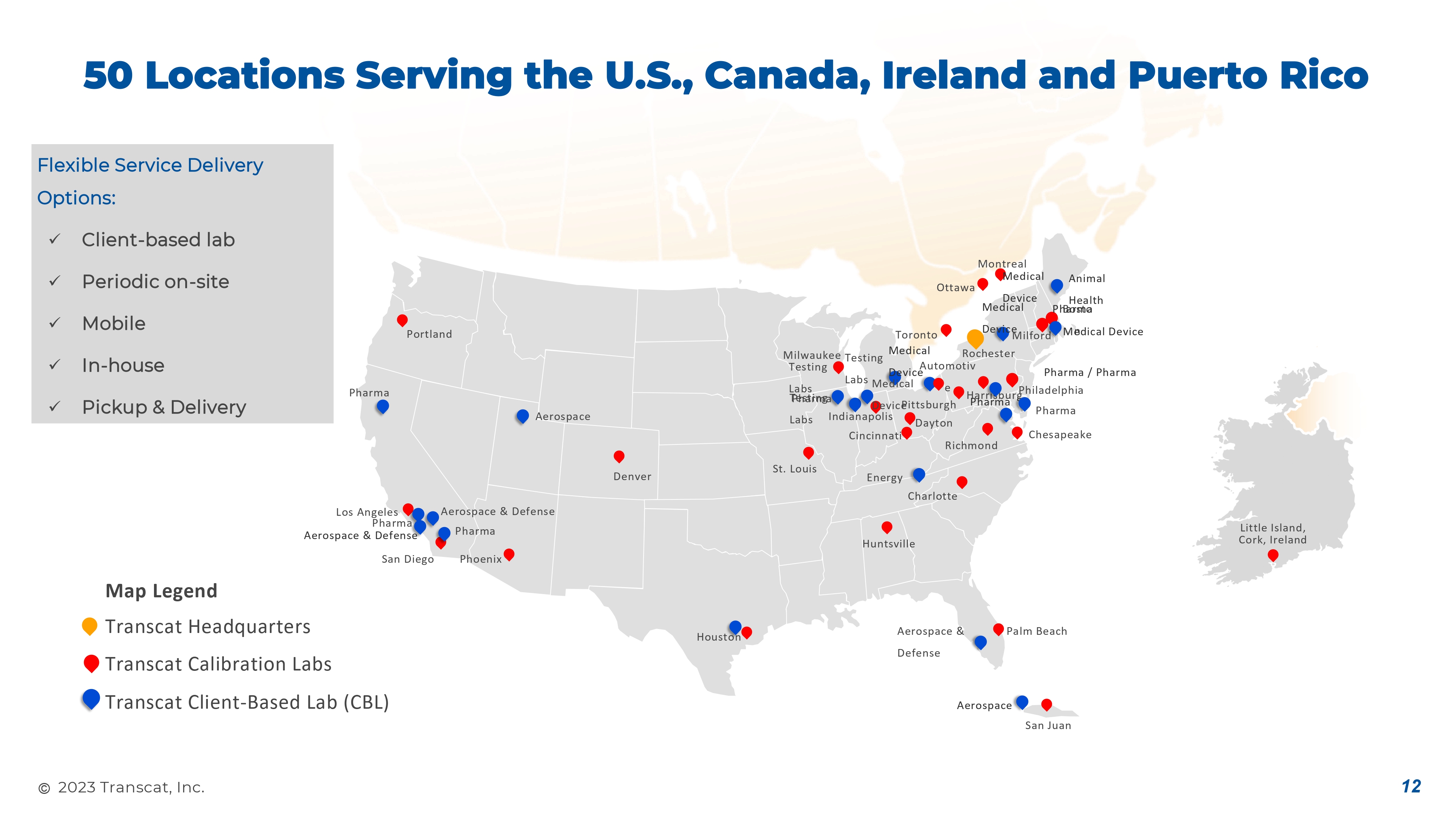 12 © 2022 Transcat Inc. San Juan Map Legend Transcat Headquarters Transcat Calibration Labs Transcat Client - Based Lab (CBL) Montreal Bosto n Harrisburg Philadelphia Pittsburgh Rochester Toronto Ottawa Milwaukee Indianapolis Dayton Charlotte St. Louis Denver Houston Phoenix San Diego Los Angeles Portland Testing Labs Pharma Pharma Aerospace Aerospace & Defense Aerospace & Defense Pharma Aerospace Pharma Pharma / Pharma Pharma Medical Device Medical Device Animal Health Medical Device Flexible Service Delivery Options: x Client - based lab x Periodic on - site x Mobile x In - house x Pickup & Delivery 50 Locations Serving the U.S., Canada, Ireland and Puerto Rico Milford Richmond Chesapeake Huntsville Medical Device Palm Beach Cincinnati Energy Aerospace & Defense Medical Device Testing Labs Little Island, Cork, Ireland Testing Labs Pharma Automotiv e Pharma 2023 Transcat, Inc.