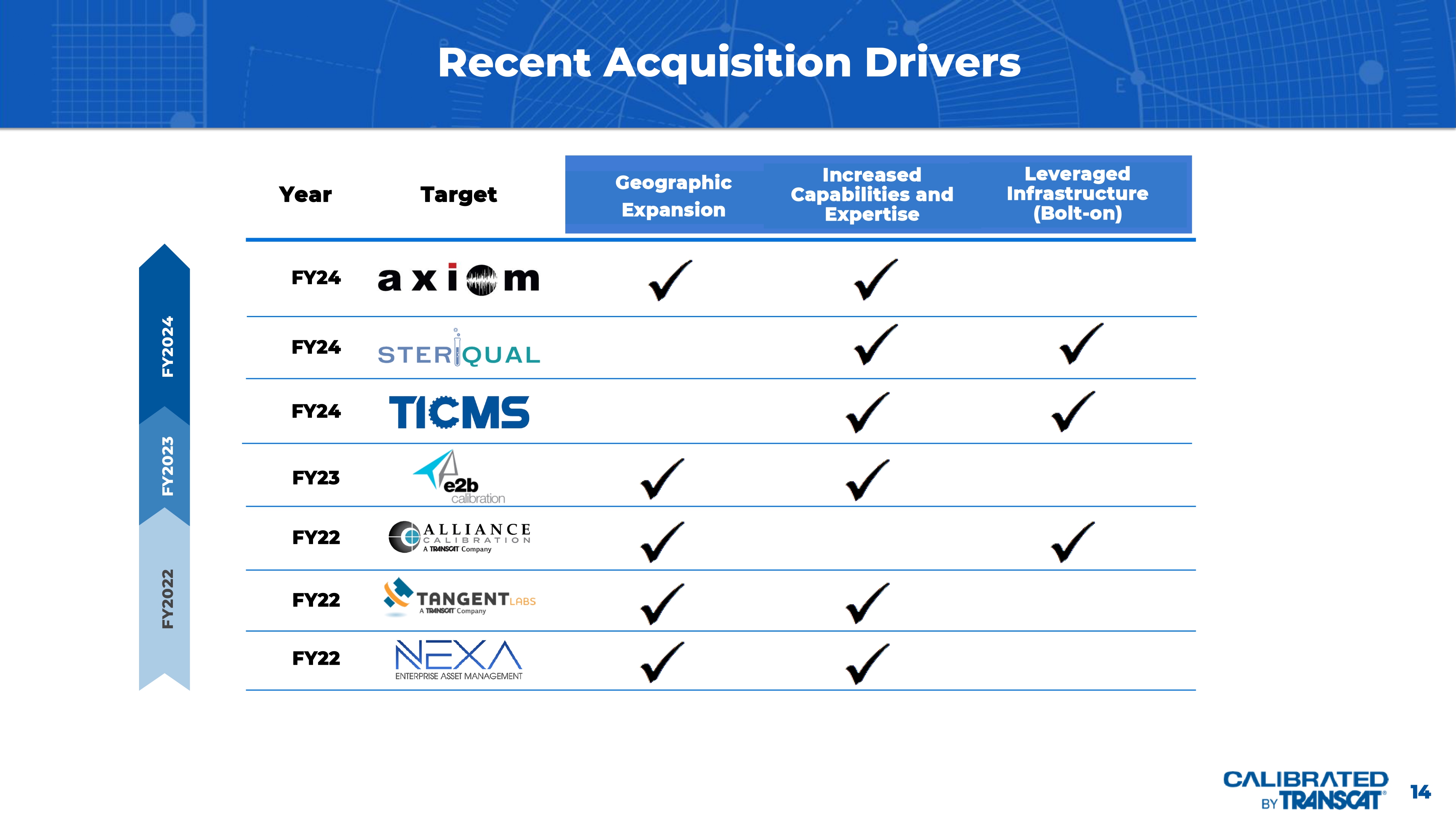 13 * Company estimates based on YTD FY 2024 Broad and Diverse Blue Chip Customer Base Percentage of Service Revenue * Servicing the Fortune 500 Manufacturers: Pharmaceuticals Medical Devices: Orthopedics Endoscopy Surgical Tools Defense Systems Aerospace Uranium Processing / Storage Industrial/Materials 60% Life Science / FDA - regulated 16% Other 4% Energy/Utilities 5% Services/Consumer Goods 7% 8% Aerospace/Defense