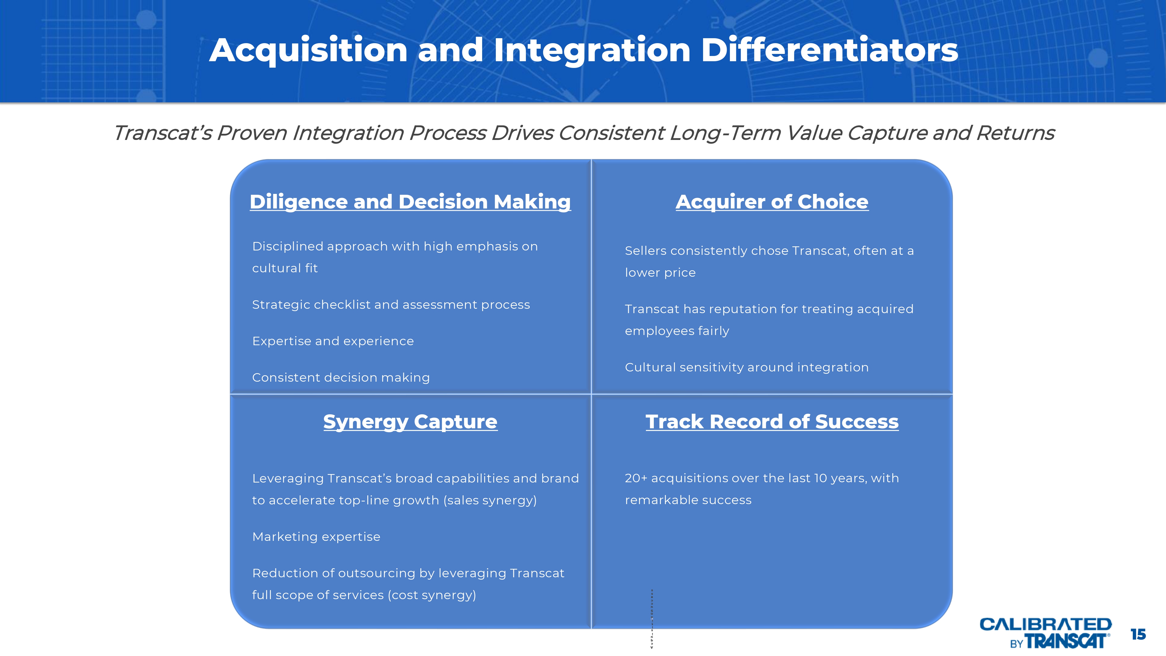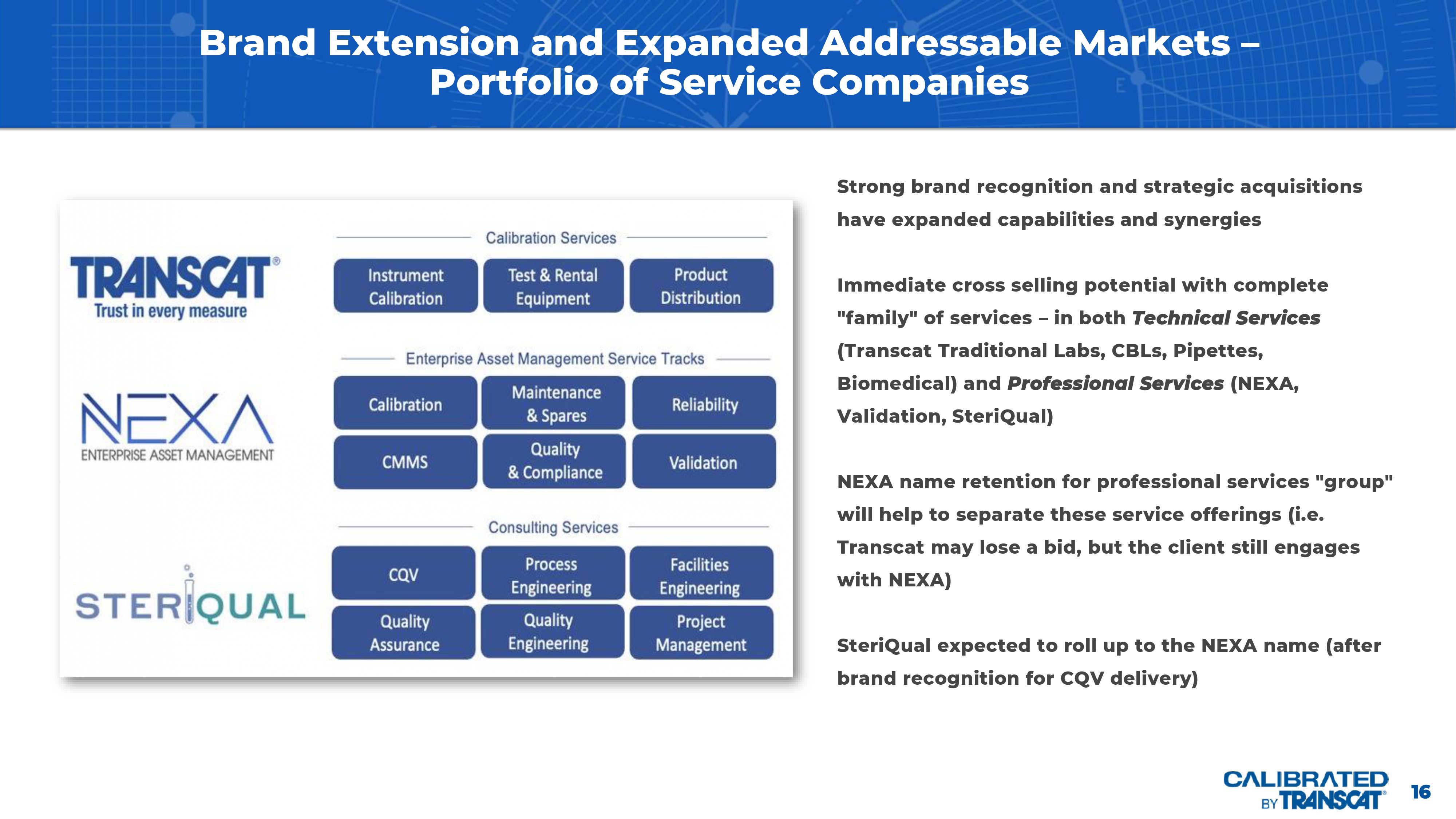 15 Acquisition and Integration Differentiators Diligence and Decision Making Acquirer of Choice Synergy Capture Track Record of Success A c q u i s i t i o n S u c c e s s Disciplined approach with high emphasis on cultural fit Strategic checklist and assessment process Expertise and experience Consistent decision making Transcat’s Proven Integration Process Drives Consistent Long - Term Value Capture and Returns Sellers consistently chose Transcat, often at a lower price Transcat has reputation for treating acquired employees fairly Cultural sensitivity around integration Leveraging Transcat’s broad capabilities and brand to accelerate top - line growth (sales synergy) Marketing expertise Reduction of outsourcing by leveraging Transcat full scope of services (cost synergy) 20+ acquisitions over the last 10 years, with remarkable success