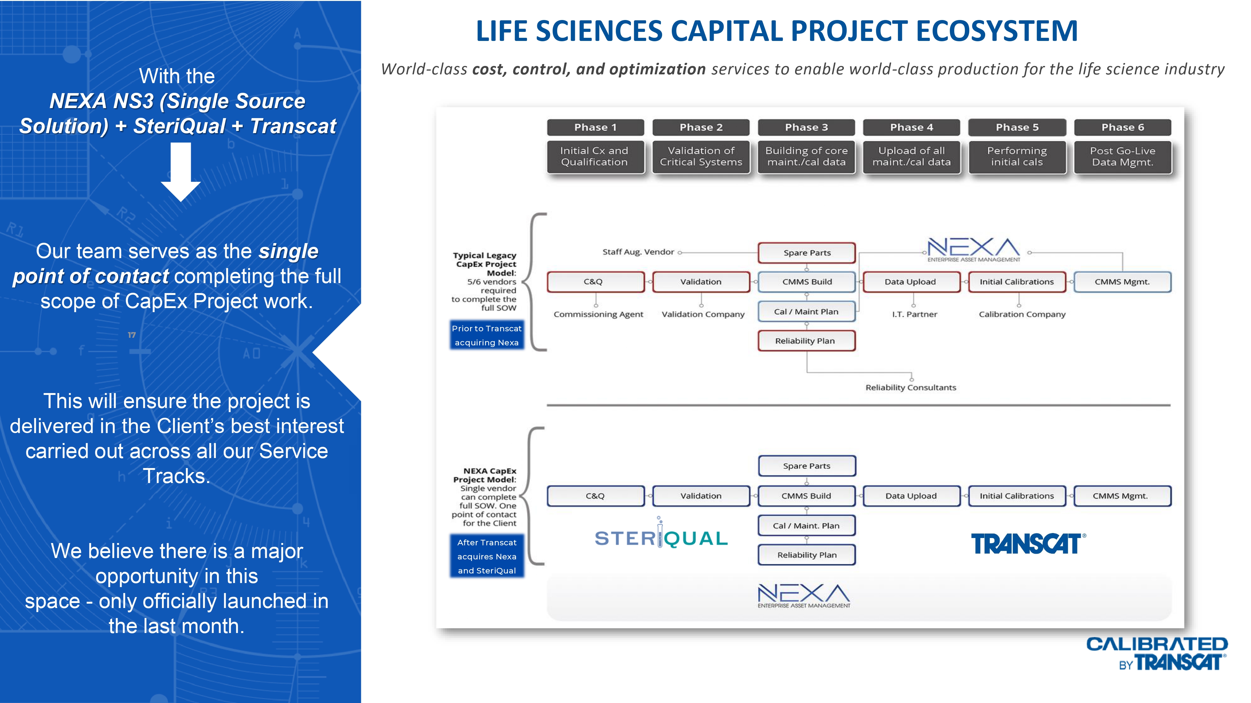 LIFE SCIENCES CAPITAL PROJECT ECOSYSTEM 17 With the NEXA NS3 (Single Source Solution) + SteriQual + Transcat Our team serves as the single point of contact completing the full scope of CapEx Project work. This will ensure the project is delivered in the Client’s best interest carried out across all our Service Tracks. We believe there is a major opportunity in this space - only officially launched in the last month. World - class cost, control, and optimization services to enable world - class production for the life science industry Prior to Transcat acquiring Nexa After Transcat acquires Nexa and SteriQual