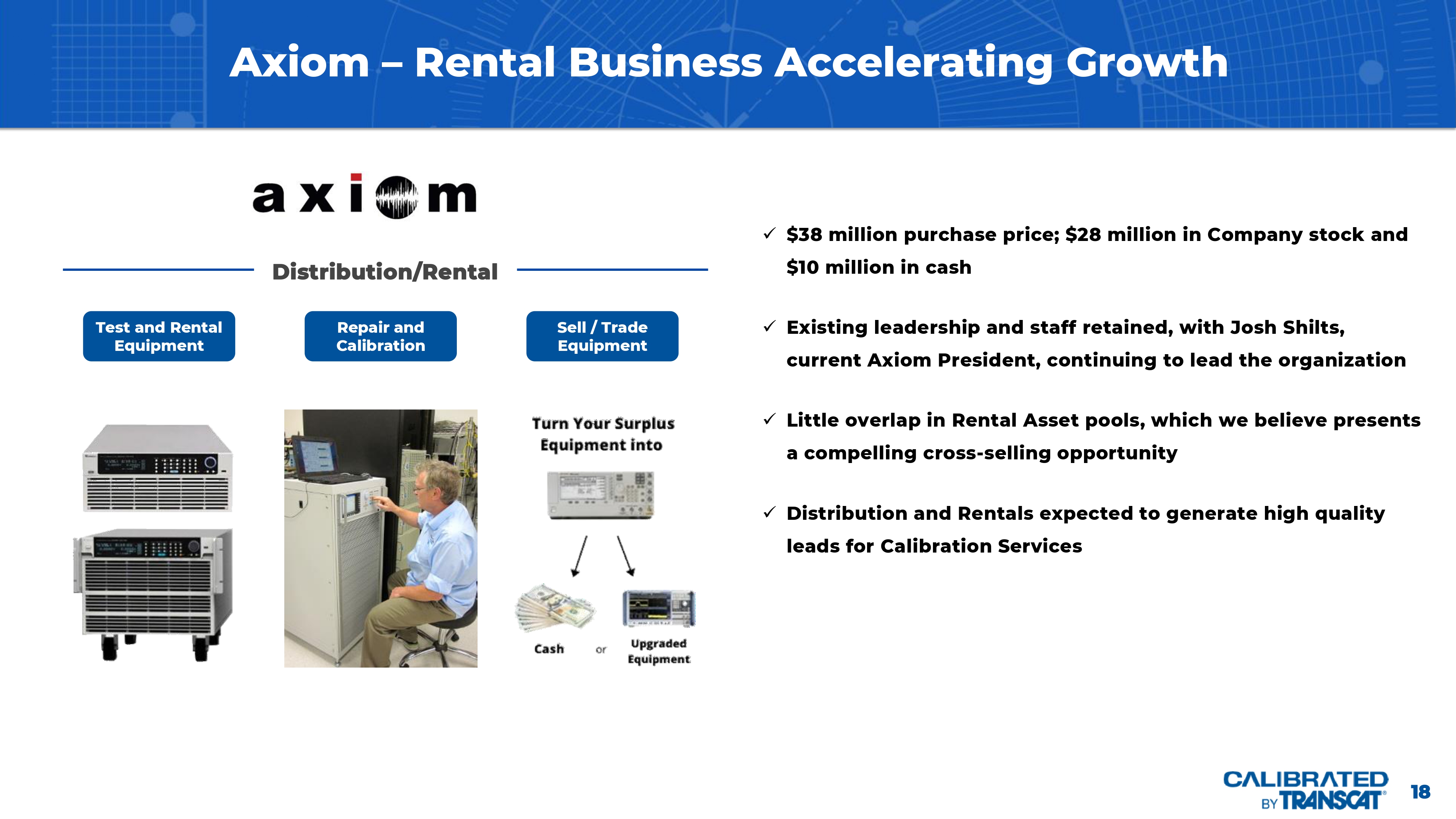 18 Axiom – Rental Business Accelerating Growth x $38 million purchase price; $28 million in Company stock and $10 million in cash x Existing leadership and staff retained, with Josh Shilts, current Axiom President, continuing to lead the organization x Little overlap in Rental Asset pools, which we believe presents a compelling cross - selling opportunity x Distribution and Rentals expected to generate high quality leads for Calibration Services Distribution/Rental Test and Rental Equipment Repair and Calibration Sell / Trade Equipment