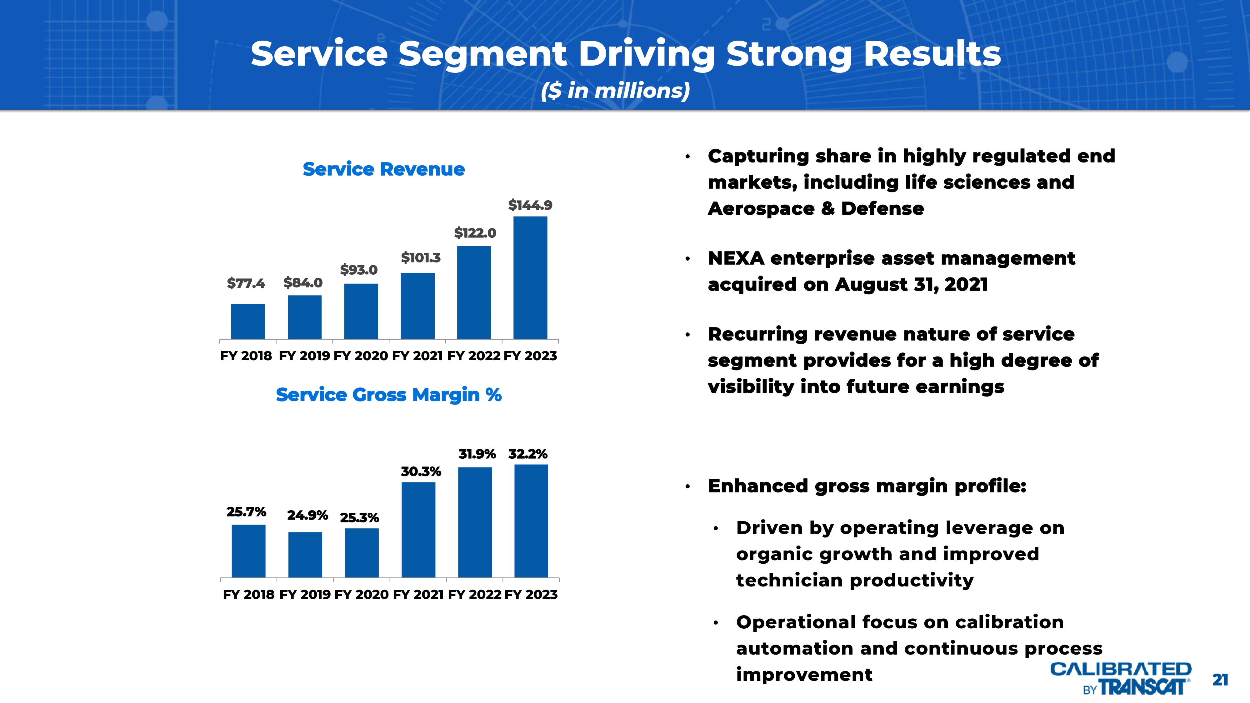 20 Consolidated Historical Results Distribution FY 2017 FY 2018 FY 2019 FY 2020 FY 2021 FY 2022 FY 2023 Revenue $173 $173 $155 FY 2017 FY 2018 FY 2019 FY 2020 FY 2021 FY 2022 FY 2023 Adjusted EBITDA $14.5 $16.4 $20.6 $18.4 $17.8 $144 $161 $ 205 $26.3 63% 37% FY 2012 $ 110 33% 67% FY 2012 Service $8.3 $ 231 $30.4 74% 26% 72% ($ in millions)