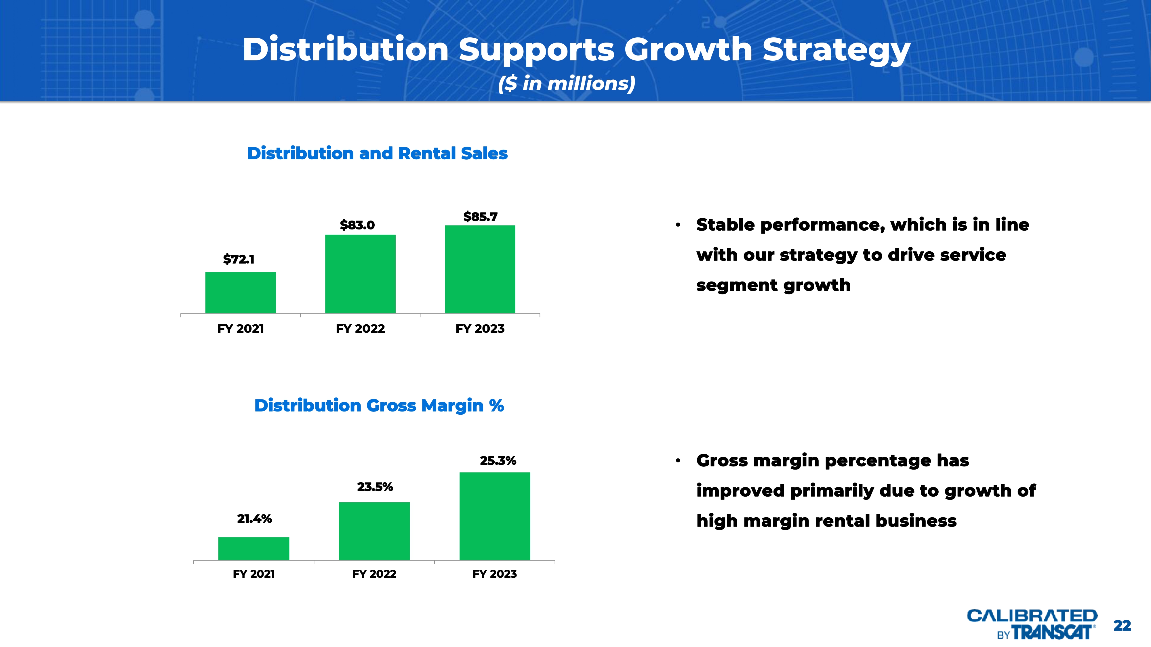 21 Service Segment Driving Strong Results $77.4 $84.0 $93.0 $101.3 $122.0 $144.9 FY 2018 FY 2019 FY 2020 FY 2021 FY 2022 FY 2023 Service Revenue 25.7% 24.9% 25.3% 30.3% 31.9% 32.2% FY 2018 FY 2019 FY 2020 FY 2021 FY 2022 FY 2023 Service Gross Margin % • Capturing share in highly regulated end markets, including life sciences and Aerospace & Defense • NEXA enterprise asset management acquired on August 31, 2021 • Recurring revenue nature of service segment provides for a high degree of visibility into future earnings • Enhanced gross margin profile: • Driven by operating leverage on organic growth and improved technician productivity • Operational focus on calibration automation and continuous process improvement ($ in millions)