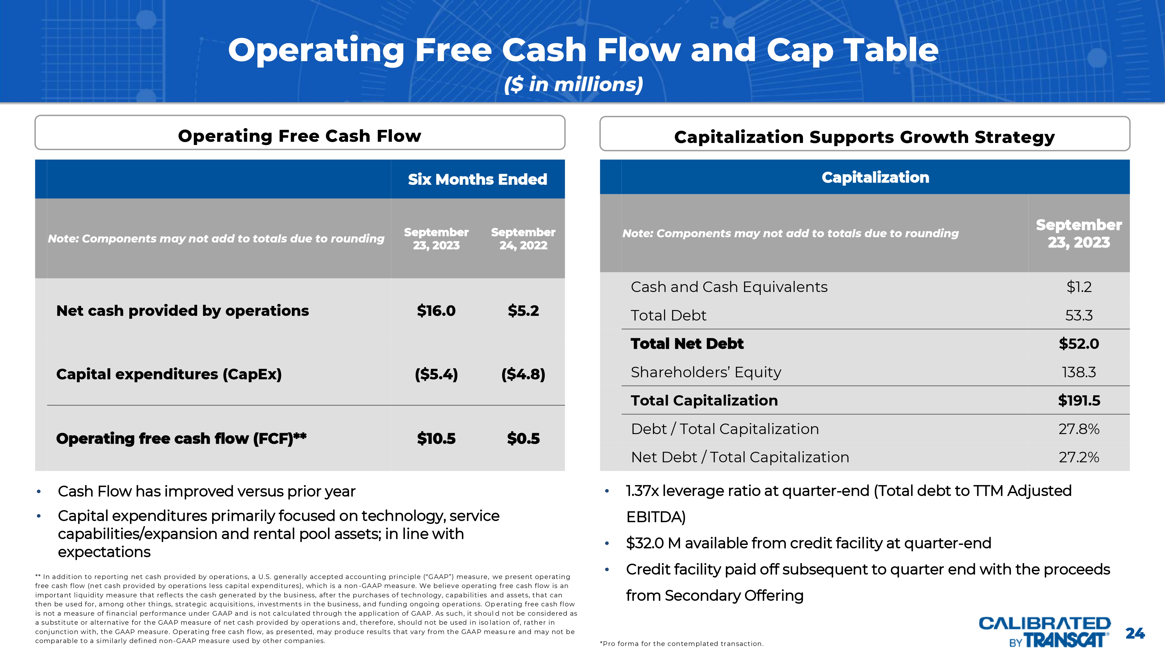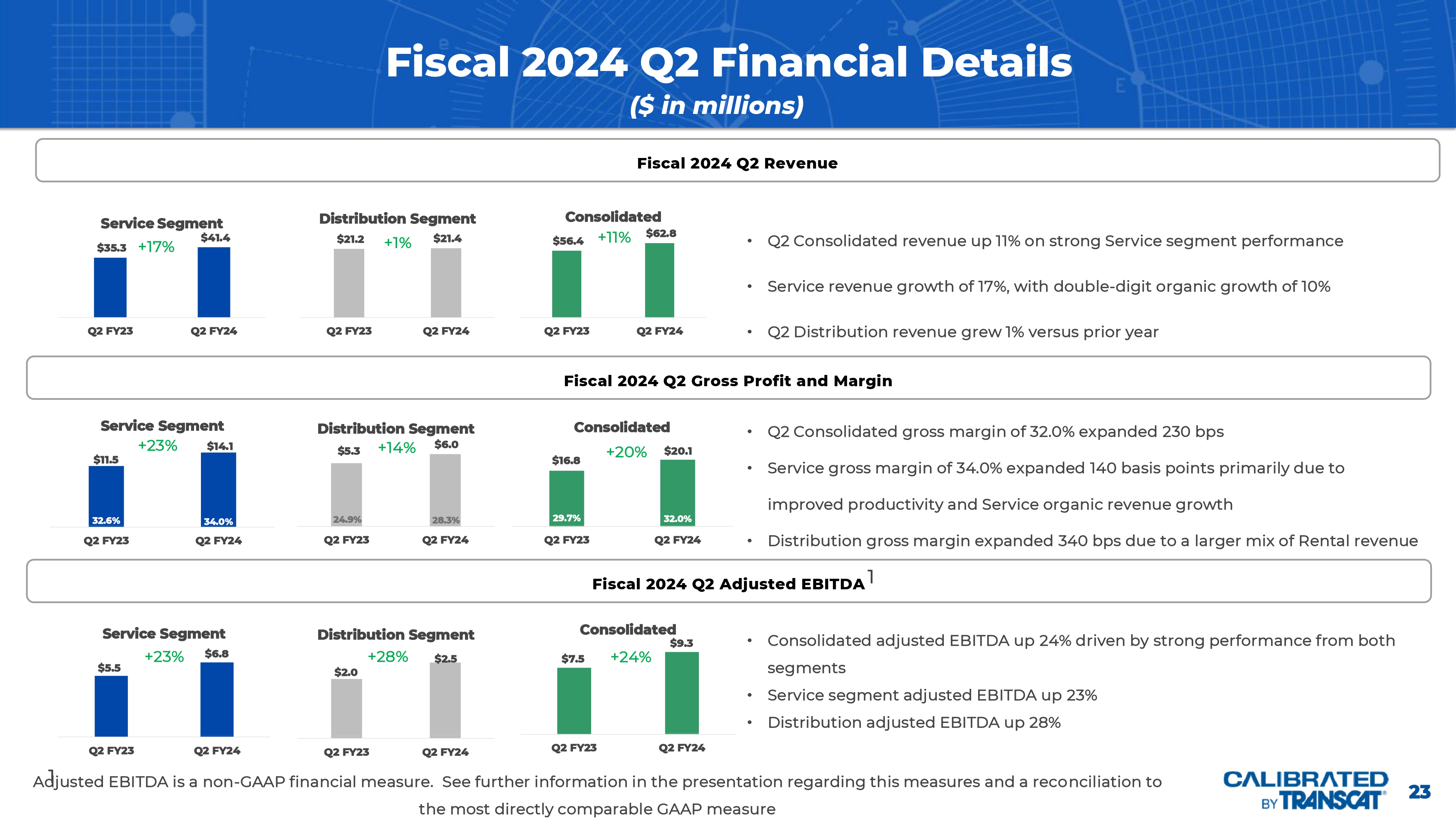 23 Fiscal 2024 Q2 Financial Details Fiscal 2024 Q2 Gross Profit and Margin Fiscal 2024 Q2 Adjusted EBITDA • Q2 Consolidated revenue up 11% on strong Service segment performance • Service revenue growth of 17%, with double - digit organic growth of 10% • Q2 Distribution revenue grew 1% versus prior year • Q2 Consolidated gross margin of 32.0% expanded 230 bps • Service gross margin of 34.0% expanded 140 basis points primarily due to improved productivity and Service organic revenue growth • Distribution gross margin expanded 340 bps due to a larger mix of Rental revenue • Consolidated adjusted EBITDA up 24 % driven by strong performance from both segments • Service segment adjusted EBITDA up 23 % • Distribution adjusted EBITDA up 28% Fiscal 2024 Q2 Revenue ($ in millions) Adjusted EBITDA is a non - GAAP financial measure. See further information in the presentation regarding this measures and a reco nciliation to the most directly comparable GAAP measure 1 1 $35.3 $41.4 Q2 FY23 Q2 FY24 Service Segment $21.2 $21.4 Q2 FY23 Q2 FY24 Distribution Segment $56.4 $62.8 Q2 FY23 Q2 FY24 Consolidated 32.6% 34.0% $11.5 $14.1 Q2 FY23 Q2 FY24 Service Segment 24.9% 28.3% $5.3 $6.0 Q2 FY23 Q2 FY24 Distribution Segment 29.7% 32.0% $16.8 $20.1 Q2 FY23 Q2 FY24 Consolidated $5.5 $6.8 Q2 FY23 Q2 FY24 Service Segment $2.0 $2.5 Q2 FY23 Q2 FY24 Distribution Segment $7.5 $9.3 Q2 FY23 Q2 FY24 Consolidated +17% +1% +11% +23% +14% +20% +23% +28% +24%