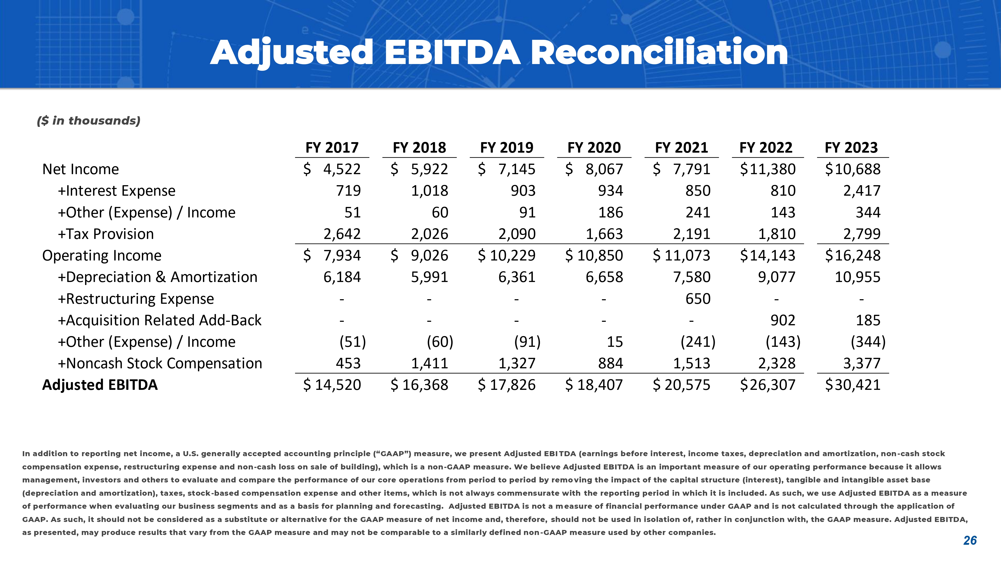 26 ($ in thousands) Adjusted EBITDA Reconciliation In addition to reporting net income, a U.S. generally accepted accounting principle (“GAAP”) measure, we present Adjusted EBI TDA (earnings before interest, income taxes, depreciation and amortization, non - cash stock compensation expense, restructuring expense and non - cash loss on sale of building), which is a non - GAAP measure. We believe Adju sted EBITDA is an important measure of our operating performance because it allows management, investors and others to evaluate and compare the performance of our core operations from period to period by remo vin g the impact of the capital structure (interest), tangible and intangible asset base (depreciation and amortization), taxes, stock - based compensation expense and other items, which is not always commensurate with the reporting period in which it is included. As such, we use Adjusted EBITDA as a measure of performance when evaluating our business segments and as a basis for planning and forecasting. Adjusted EBITDA is not a m eas ure of financial performance under GAAP and is not calculated through the application of GAAP. As such, it should not be considered as a substitute or alternative for the GAAP measure of net income and, therefore, sho uld not be used in isolation of, rather in conjunction with, the GAAP measure. Adjusted EBITDA, as presented, may produce results that vary from the GAAP measure and may not be comparable to a similarly defined non - GAAP meas ure used by other companies. FY 2017 FY 2018 FY 2019 FY 2020 FY 2021 FY 2022 FY 2023 Net Income 4,522$ 5,922$ 7,145$ 8,067$ 7,791$ 11,380$ 10,688$ +Interest Expense 719 1,018 903 934 850 810 2,417 +Other (Expense) / Income 51 60 91 186 241 143 344 +Tax Provision 2,642 2,026 2,090 1,663 2,191 1,810 2,799 Operating Income 7,934$ 9,026$ 10,229$ 10,850$ 11,073$ 14,143$ 16,248$ +Depreciation & Amortization 6,184 5,991 6,361 6,658 7,580 9,077 10,955 +Restructuring Expense - - - - 650 - - +Acquisition Related Add-Back - - - - - 902 185 +Other (Expense) / Income (51) (60) (91) 15 (241) (143) (344) +Noncash Stock Compensation 453 1,411 1,327 884 1,513 2,328 3,377 Adjusted EBITDA 14,520$ 16,368$ 17,826$ 18,407$ 20,575$ 26,307$ 30,421$