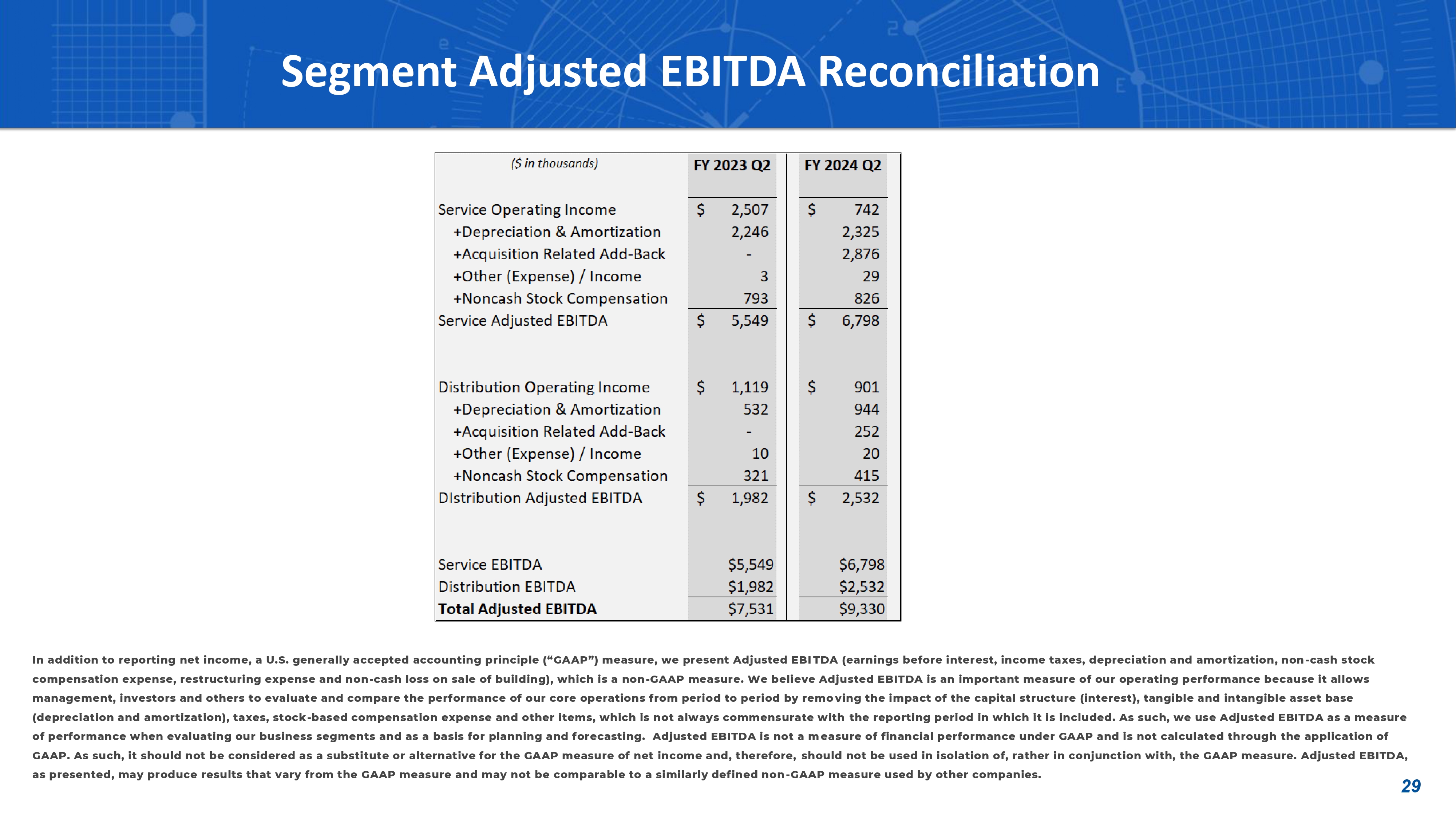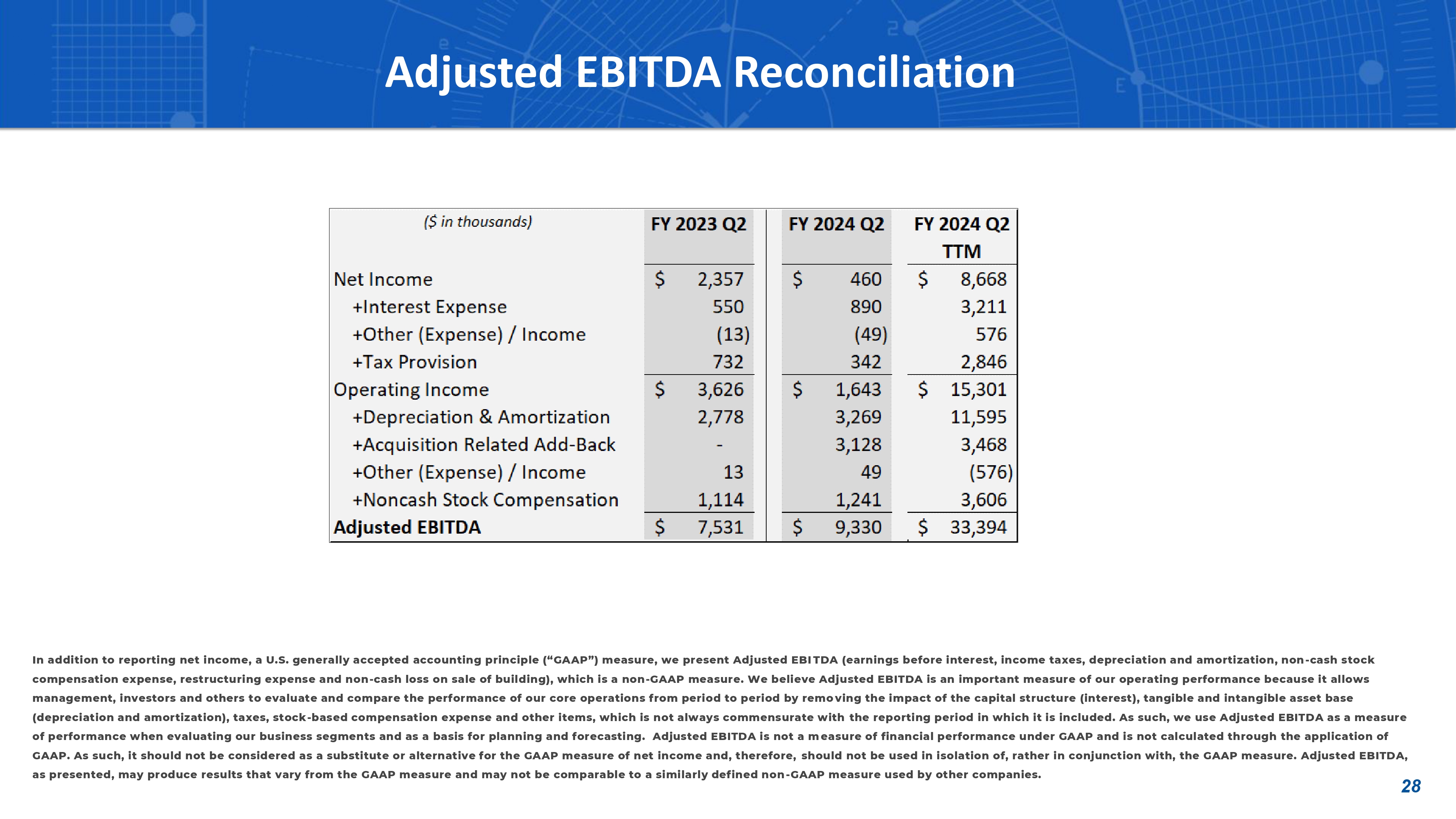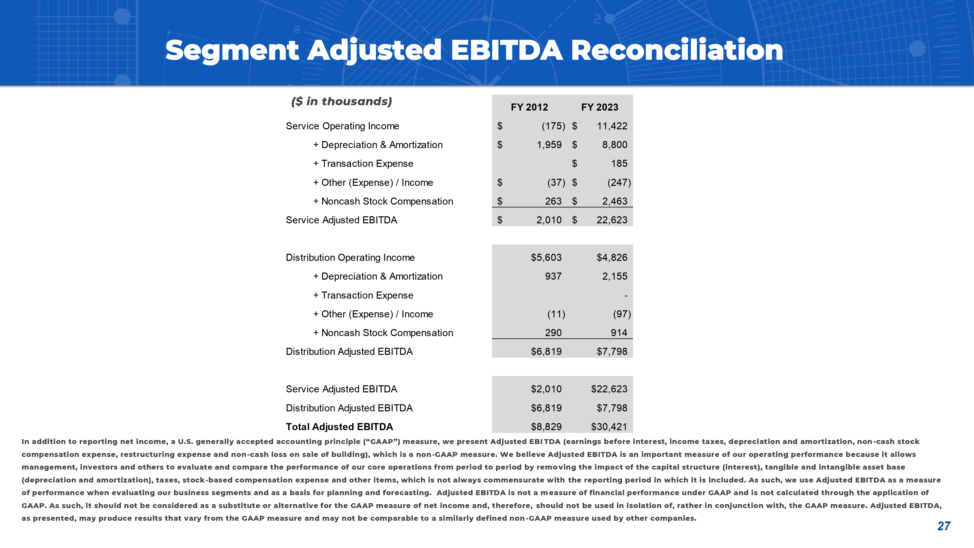 27 FY 2012 FY 2023 Service Operating Income (175)$ 11,422$ + Depreciation & Amortization 1,959$ 8,800$ + Transaction Expense 185$ + Other (Expense) / Income (37)$ (247)$ + Noncash Stock Compensation 263$ 2,463$ Service Adjusted EBITDA 2,010$ 22,623$ Distribution Operating Income $5,603 $4,826 + Depreciation & Amortization 937 2,155 + Transaction Expense - + Other (Expense) / Income (11) (97) + Noncash Stock Compensation 290 914 Distribution Adjusted EBITDA $6,819 $7,798 Service Adjusted EBITDA $2,010 $22,623 Distribution Adjusted EBITDA $6,819 $7,798 Total Adjusted EBITDA $8,829 $30,421 ($ in thousands) Segment Adjusted EBITDA Reconciliation In addition to reporting net income, a U.S. generally accepted accounting principle (“GAAP”) measure, we present Adjusted EBI TDA (earnings before interest, income taxes, depreciation and amortization, non - cash stock compensation expense, restructuring expense and non - cash loss on sale of building), which is a non - GAAP measure. We believe Adju sted EBITDA is an important measure of our operating performance because it allows management, investors and others to evaluate and compare the performance of our core operations from period to period by remo vin g the impact of the capital structure (interest), tangible and intangible asset base (depreciation and amortization), taxes, stock - based compensation expense and other items, which is not always commensurate with the reporting period in which it is included. As such, we use Adjusted EBITDA as a measure of performance when evaluating our business segments and as a basis for planning and forecasting. Adjusted EBITDA is not a m eas ure of financial performance under GAAP and is not calculated through the application of GAAP. As such, it should not be considered as a substitute or alternative for the GAAP measure of net income and, therefore, sho uld not be used in isolation of, rather in conjunction with, the GAAP measure. Adjusted EBITDA, as presented, may produce results that vary from the GAAP measure and may not be comparable to a similarly defined non - GAAP meas ure used by other companies.