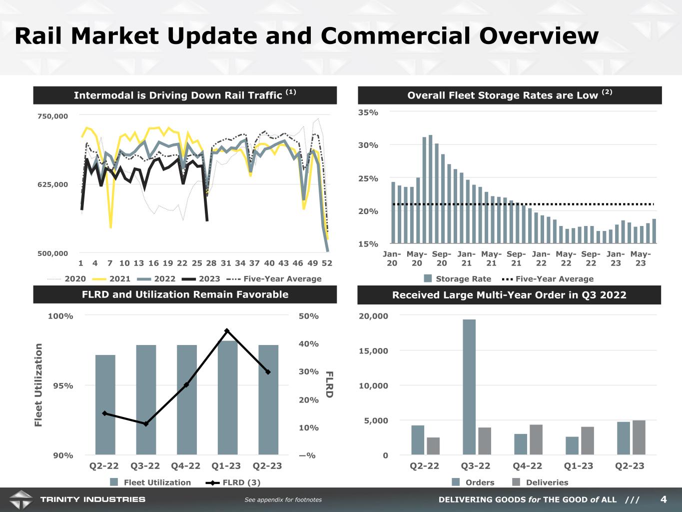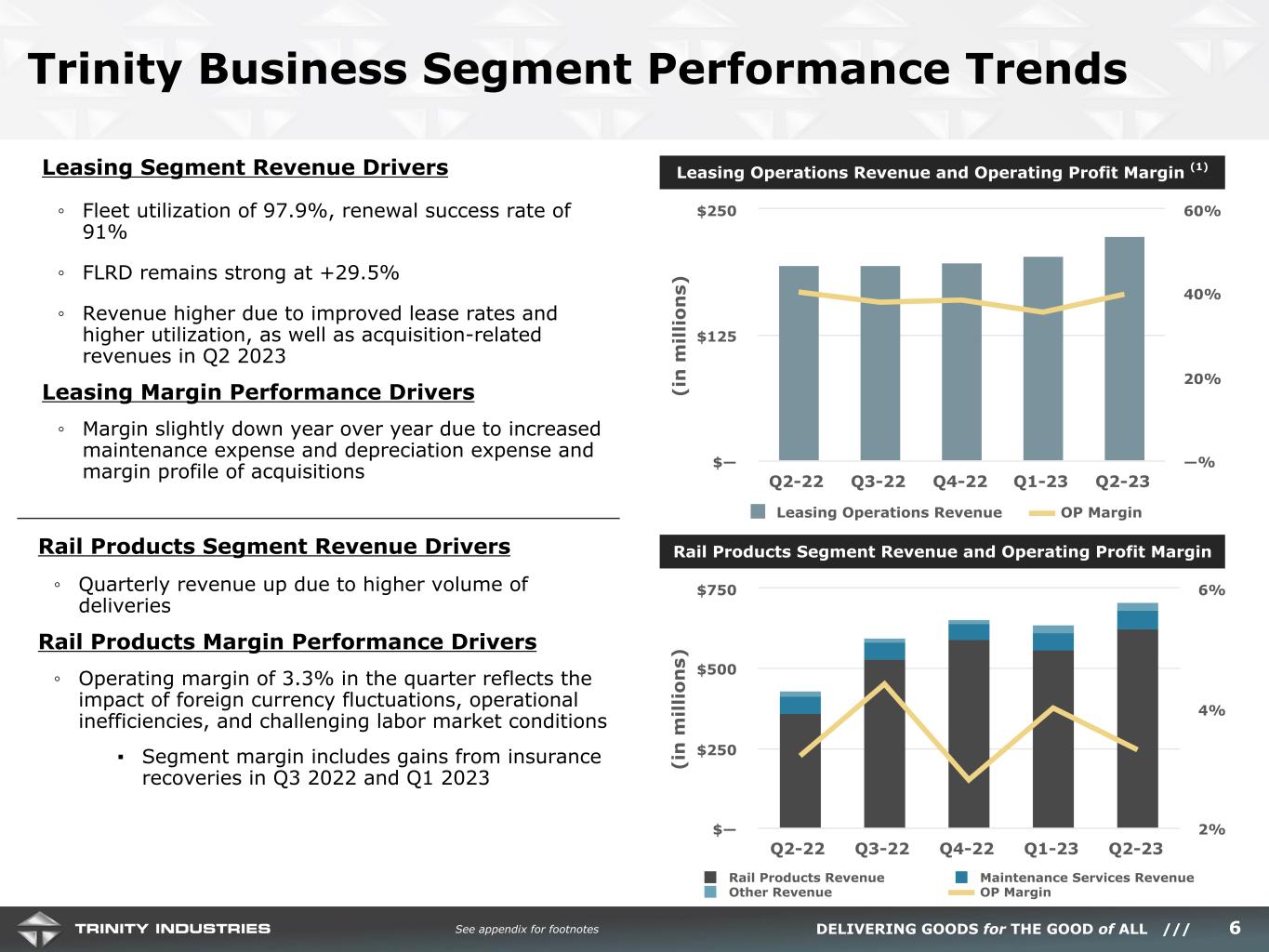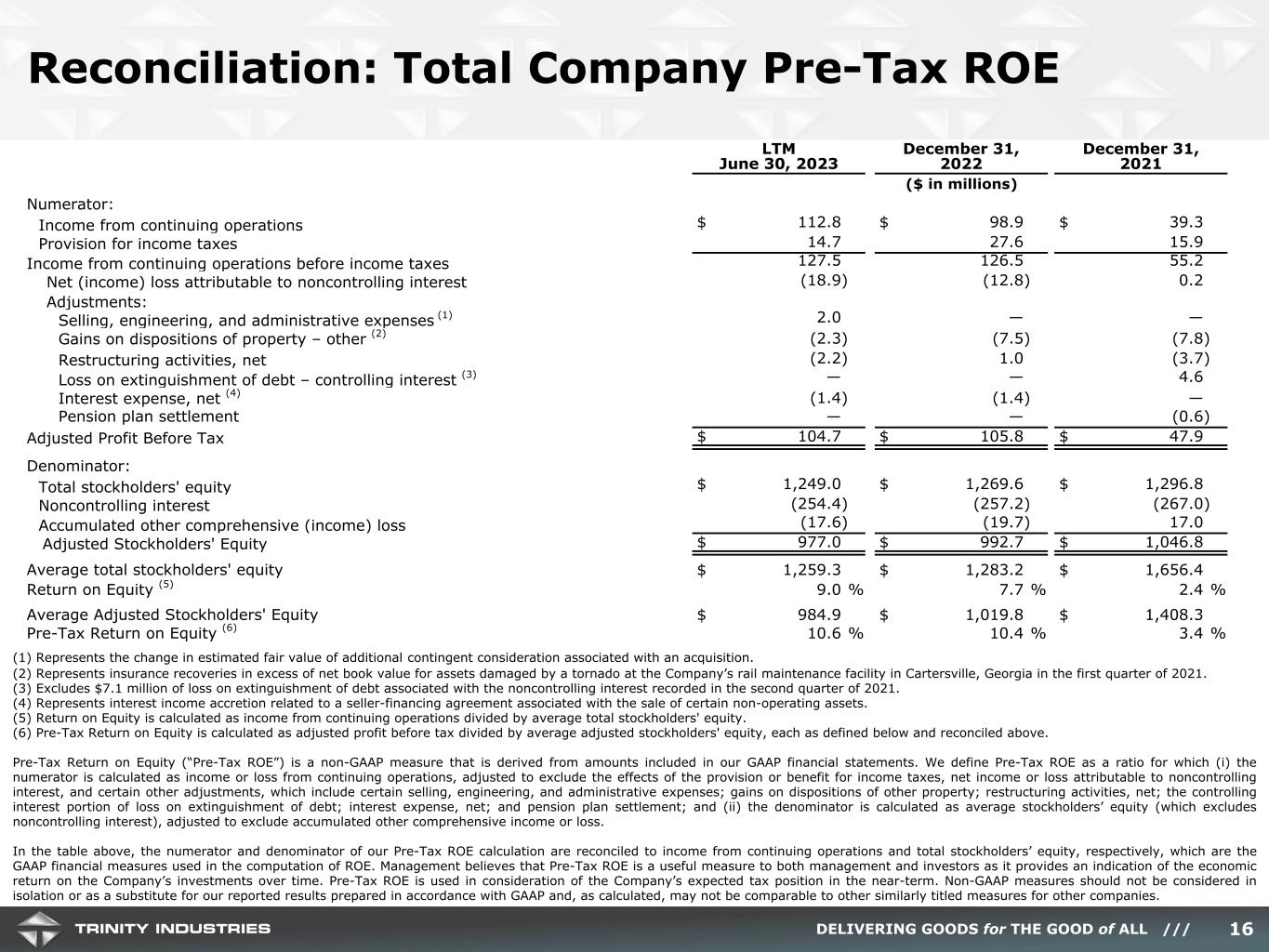 DELIVERING GOODS for THE GOOD of ALL /// Footnotes and Reconciliations 17 Slide 4 - Rail Market Update and Commercial Overview (1) Association of American Railroads (AAR) Weekly Railcar Loadings (2) AAR Rail Time Indicators – July 1, 2023 (3) Future Lease Rate Differential (FLRD) calculates the implied change in lease rates for railcar leases expiring over the next four quarters. The FLRD assumes that these expiring leases will be renewed at the most recent quarterly transacted lease rates for each railcar type. We believe the FLRD is useful to both management and investors as it provides insight into the near-term trend in lease rates. The FLRD is calculated as follows: (New Lease Rates — Expiring Lease Rates) x Expiring Railcar Leases (Expiring Lease Rates x Expiring Railcar Leases) Slide 6 - Trinity Business Segment Performance Trends (1) Leasing Operations Profit Margin calculated using only revenues and operating profit from Leasing Operations including partially-owned subsidiaries and excluding lease portfolio sales. Leasing Operations is specific to revenue and operating profit reported under “Leasing and management” within the Railcar Leasing and Management Services Group. Slide 8 - Strong Performance Trends and Key Highlights Adjusted EPS includes the following adjustments reported by the Company (each per common diluted share): ◦ Reported Q2-22 GAAP EPS and Adjusted EPS was $0.14. ◦ Reported Q3-22 GAAP EPS was $0.35. Adjusted EPS excludes $0.01 related to the insurance recoveries in excess of net book value for assets damaged by a tornado at the Company’s rail maintenance facility in Cartersville, Georgia in the first quarter of 2021. ◦ Reported Q4-22 GAAP EPS was $0.46; Adjusted EPS excludes $0.01 of interest income accretion related to a seller-financing agreement associated with the sale of certain non-operating assets and $0.01 related to prior year carryback claims as permitted under recent tax legislation. ◦ Reported Q1-23 GAAP EPS was $0.09; Adjusted EPS excludes $0.01 related to the insurance recoveries in excess of net book value for assets damaged by a tornado at the Company’s rail maintenance facility in Cartersville, Georgia in the first quarter of 2021 and $0.01 from interest income accretion related to a seller-financing agreement associated with the sale of certain non-operating assets and restructuring activities. ◦ Reported Q2-23 GAAP EPS was $0.23; Adjusted EPS excludes $0.02 related to the change in estimated fair value of additional contingent consideration associated with an acquisition and $0.02 related to gains associated with restructuring activities. Slide 9 - Healthy Balance Sheet Strategically Positioned for Opportunistic Deployment and Value Creation (1) Balances and blended average interest rate as of June 30, 2023