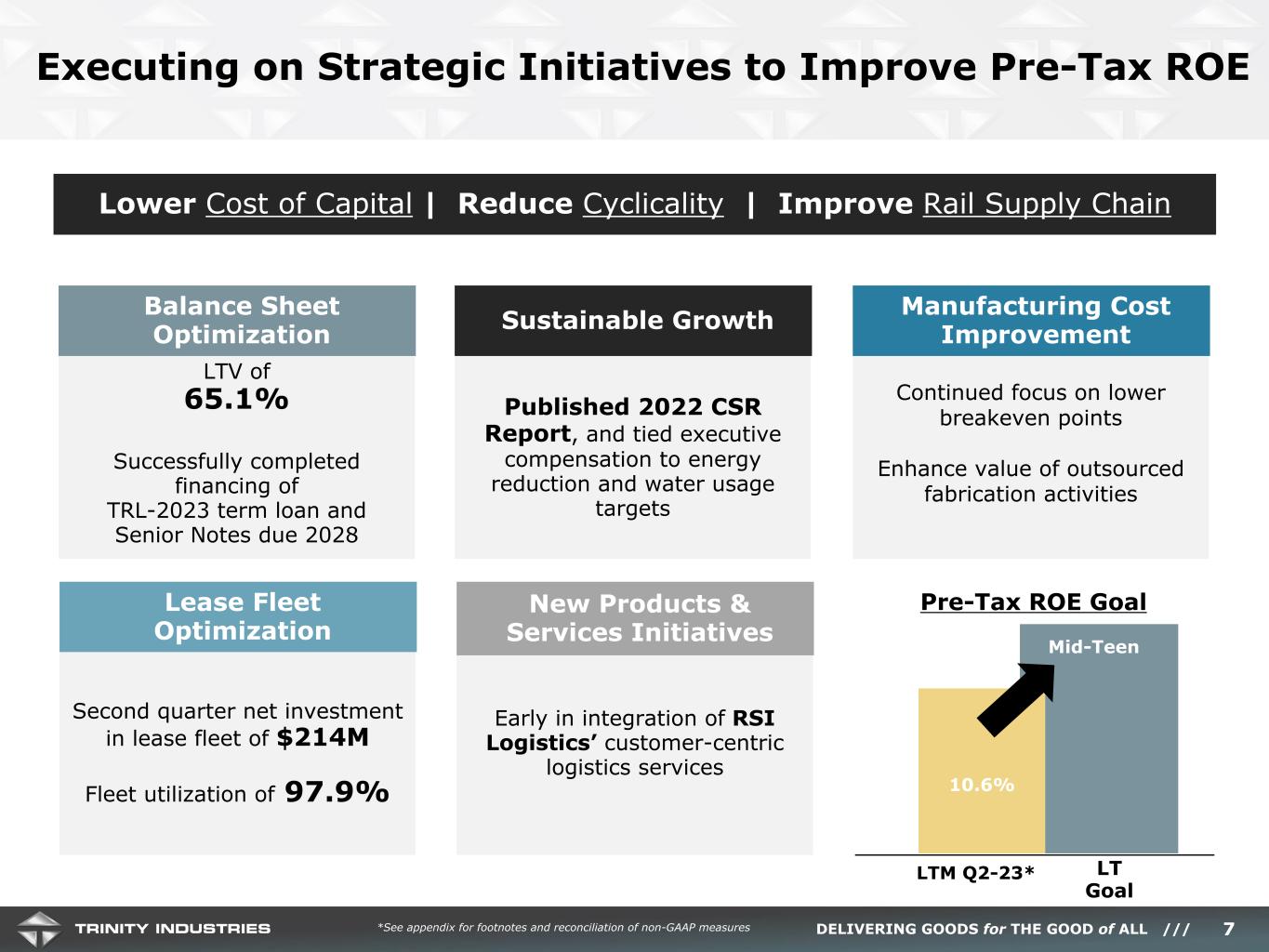 DELIVERING GOODS for THE GOOD of ALL /// Trinity Business Segment Performance Trends 6 Rail Products Segment Revenue Drivers ◦ Quarterly revenue up due to higher volume of deliveries Rail Products Margin Performance Drivers ◦ Operating margin of 3.3% in the quarter reflects the impact of foreign currency fluctuations, operational inefficiencies, and challenging labor market conditions ▪ Segment margin includes gains from insurance recoveries in Q3 2022 and Q1 2023 Leasing Operations Revenue and Operating Profit Margin (1) Rail Products Segment Revenue and Operating Profit Margin See appendix for footnotes (i n m ill io n s) Leasing Operations Revenue OP Margin Q2-22 Q3-22 Q4-22 Q1-23 Q2-23 $— $125 $250 —% 20% 40% 60% (i n m ill io n s) Rail Products Revenue Maintenance Services Revenue Other Revenue OP Margin Q2-22 Q3-22 Q4-22 Q1-23 Q2-23 $— $250 $500 $750 2% 4% 6% Leasing Segment Revenue Drivers ◦ Fleet utilization of 97.9%, renewal success rate of 91% ◦ FLRD remains strong at +29.5% ◦ Revenue higher due to improved lease rates and higher utilization, as well as acquisition-related revenues in Q2 2023 Leasing Margin Performance Drivers ◦ Margin slightly down year over year due to increased maintenance expense and depreciation expense and margin profile of acquisitions