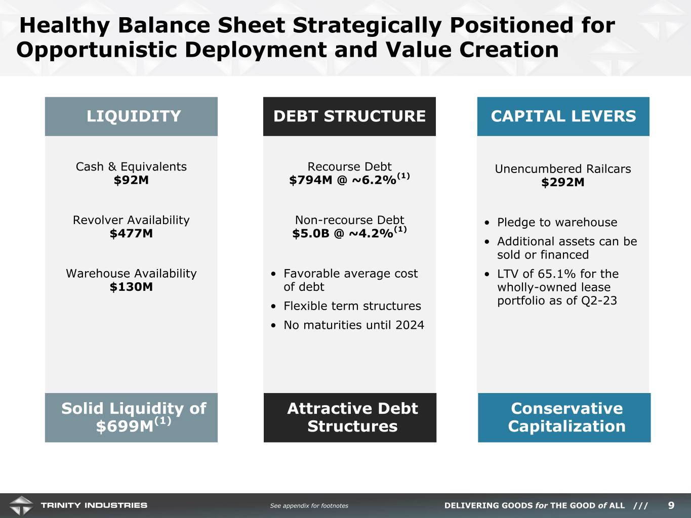 DELIVERING GOODS for THE GOOD of ALL /// Revenue and EPS Improved Year over Year Q2 2023 Financial Summary: Income Statement: • Total revenues of $722M reflect higher external railcar deliveries and improved lease rates • Earnings per share from continuing operations of $0.23 • Benefited from $129M in lease portfolio sales Year-to-date Cash Flow: • Cash flow from continuing operations of $140M • Adjusted free cash flow of $81M* after investments and dividends • Net lease fleet investment of $214M • Investment of $21M in manufacturing and general capex • Shareholder returns of $43M through dividends paid Strong Performance Trends and Key Highlights 8 Cash Flow Reflects Supply Chain Challenges and Timing * See appendix for reconciliation of non-GAAP measures (i n m ill io n s) Leasing Rail Products Adj EPS, Cont Ops (Diluted) * Q2-22 Q3-22 Q4-22 Q1-23 Q2-23 $— $250 $500 $750 $— $0.25 $0.50 (i n m ill io n s) Cash Flow from Cont Ops Adjusted Free Cash Flow * Q2-22 Q3-22 Q4-22 Q1-23 Q2-23 $(100) $(50) $— $50 $100 $150