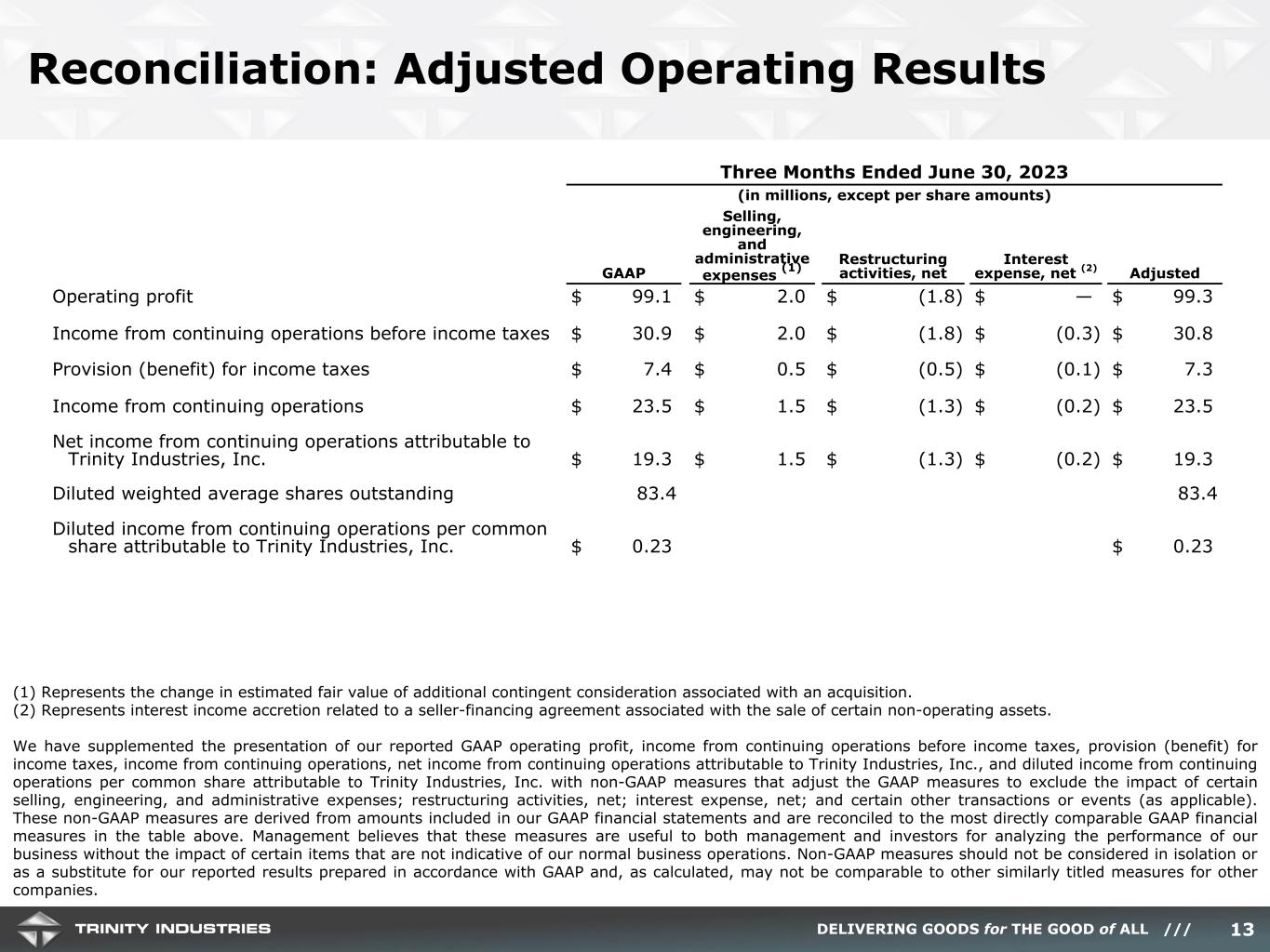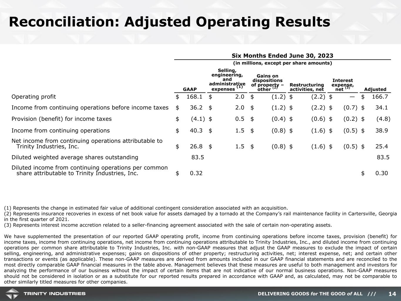 DELIVERING GOODS for THE GOOD of ALL /// Reconciliation: Adjusted Operating Results 13 Three Months Ended June 30, 2023 (in millions, except per share amounts) GAAP Selling, engineering, and administrative expenses (1) Restructuring activities, net Interest expense, net (2) Adjusted Operating profit $ 99.1 $ 2.0 $ (1.8) $ — $ 99.3 Income from continuing operations before income taxes $ 30.9 $ 2.0 $ (1.8) $ (0.3) $ 30.8 Provision (benefit) for income taxes $ 7.4 $ 0.5 $ (0.5) $ (0.1) $ 7.3 Income from continuing operations $ 23.5 $ 1.5 $ (1.3) $ (0.2) $ 23.5 Net income from continuing operations attributable to Trinity Industries, Inc. $ 19.3 $ 1.5 $ (1.3) $ (0.2) $ 19.3 Diluted weighted average shares outstanding 83.4 83.4 Diluted income from continuing operations per common share attributable to Trinity Industries, Inc. $ 0.23 $ 0.23 (1) Represents the change in estimated fair value of additional contingent consideration associated with an acquisition. (2) Represents interest income accretion related to a seller-financing agreement associated with the sale of certain non-operating assets. We have supplemented the presentation of our reported GAAP operating profit, income from continuing operations before income taxes, provision (benefit) for income taxes, income from continuing operations, net income from continuing operations attributable to Trinity Industries, Inc., and diluted income from continuing operations per common share attributable to Trinity Industries, Inc. with non-GAAP measures that adjust the GAAP measures to exclude the impact of certain selling, engineering, and administrative expenses; restructuring activities, net; interest expense, net; and certain other transactions or events (as applicable). These non-GAAP measures are derived from amounts included in our GAAP financial statements and are reconciled to the most directly comparable GAAP financial measures in the table above. Management believes that these measures are useful to both management and investors for analyzing the performance of our business without the impact of certain items that are not indicative of our normal business operations. Non-GAAP measures should not be considered in isolation or as a substitute for our reported results prepared in accordance with GAAP and, as calculated, may not be comparable to other similarly titled measures for other companies.