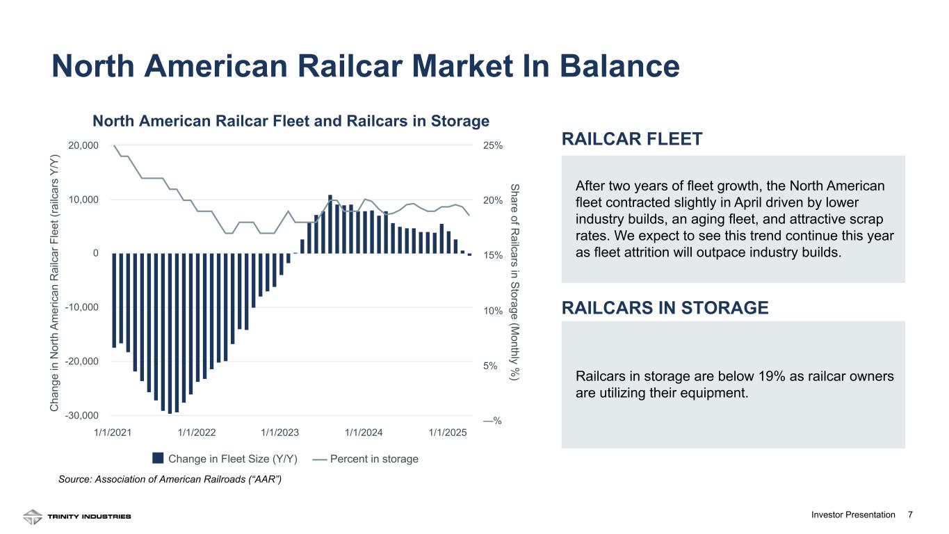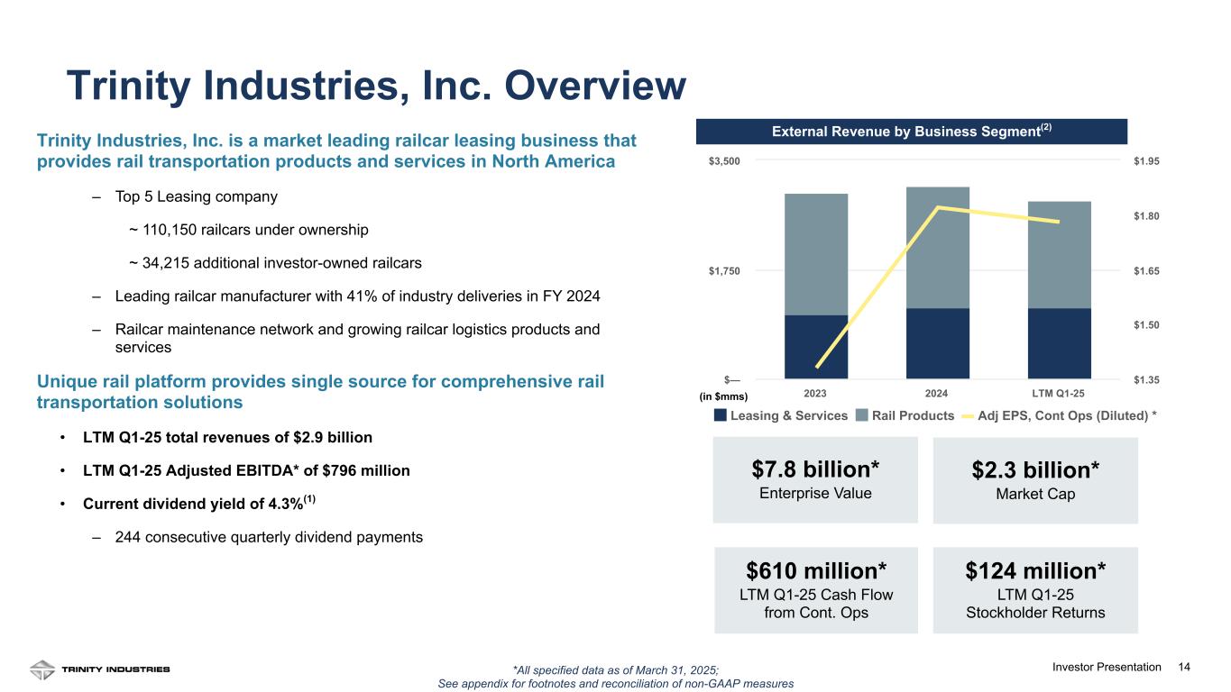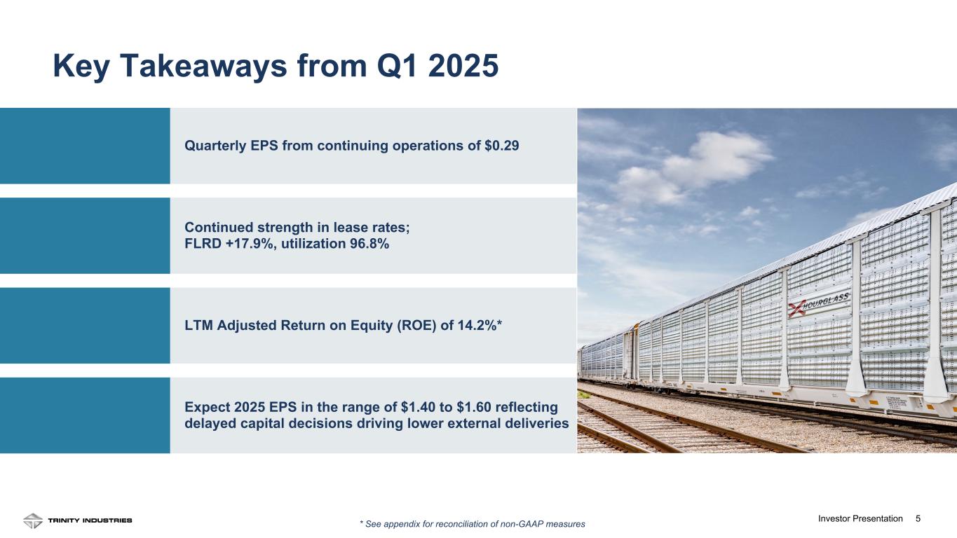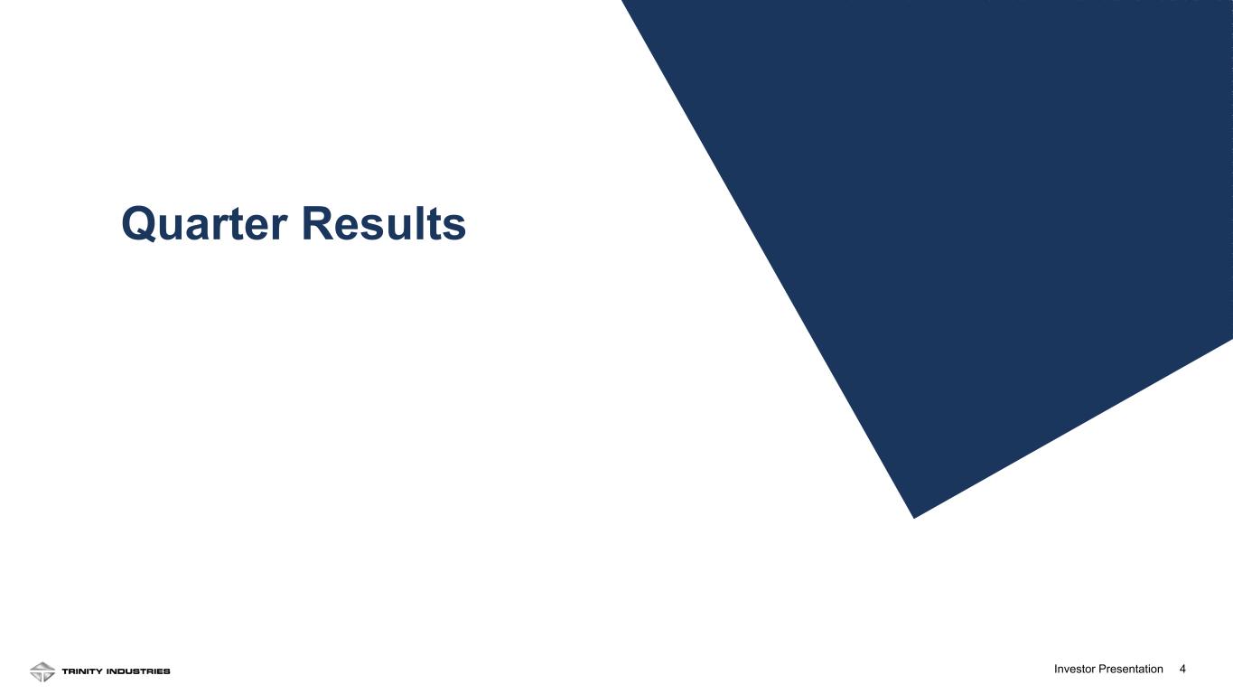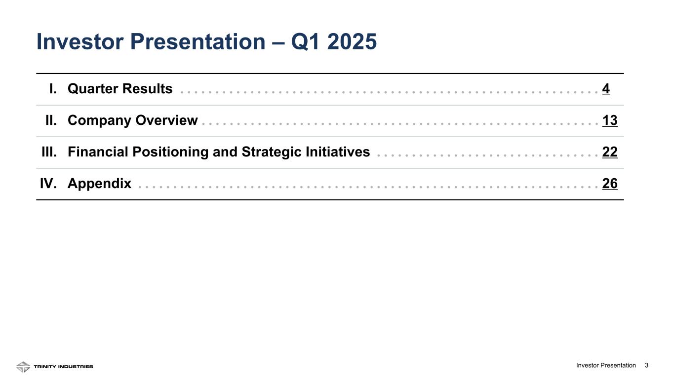 2Investor Presentation 2 Forward Looking Statements Some statements in this presentation, which are not historical facts, are “forward-looking statements” as defined by the Private Securities Litigation Reform Act of 1995. Forward-looking statements include statements about Trinity's estimates, expectations, beliefs, intentions or strategies for the future, and the assumptions underlying these forward-looking statements, including, but not limited to, future financial and operating performance, future opportunities and any other statements regarding events or developments that Trinity believes or anticipates will or may occur in the future. Trinity uses the words “anticipates,” “assumes,” “believes,” “estimates,” “expects,” “intends,” “forecasts,” “may,” “will,” “should,” “guidance,” “projected,” “outlook,” and similar expressions to identify these forward-looking statements. Forward-looking statements speak only as of the date of this material, and Trinity expressly disclaims any obligation or undertaking to disseminate any updates or revisions to any forward-looking statement contained herein to reflect any change in Trinity’s expectations with regard thereto or any change in events, conditions or circumstances on which any such statement is based, except as required by federal securities laws. Forward-looking statements involve risks and uncertainties that could cause actual results to differ materially from historical experience or our present expectations, including but not limited to risks and uncertainties regarding economic, competitive, governmental, and technological factors affecting Trinity’s operations, markets, products, services and prices, and such forward-looking statements are not guarantees of future performance. For a discussion of such risks and uncertainties, which could cause actual results to differ from those contained in the forward-looking statements, see “Risk Factors” and “Forward-Looking Statements” in Trinity’s Annual Report on Form 10-K for the most recent fiscal year, as may be revised and updated by Trinity’s Quarterly Reports on Form 10-Q, and Trinity’s Current Reports on Form 8-K. This presentation also includes references to calculations that are not based on generally accepted accounting principles (“GAAP”). Reconciliations of each of these non-GAAP measures to the most directly comparable GAAP measures have been included in the Appendix. When forward-looking non-GAAP measures are provided, Trinity does not provide quantitative reconciliations of forward-looking non-GAAP measures to the most directly comparable GAAP measures because it cannot, without unreasonable effort, predict the timing and amounts of certain items included in the computations of each of these measures. These factors include, but are not limited to: the product mix of expected railcar deliveries; the timing and amount of significant transactions and investments, such as lease portfolio sales, capital expenditures, and returns of capital to shareholders; and the amount and timing of certain other items outside the normal course of our core business operations. Except where noted, financial data is presented as of the Company’s most recent fiscal quarter ending March 31, 2025. “LTM” represents Last Twelve Months(1) financial information from April 1, 2024 to March 31, 2025. See appendix for footnotes