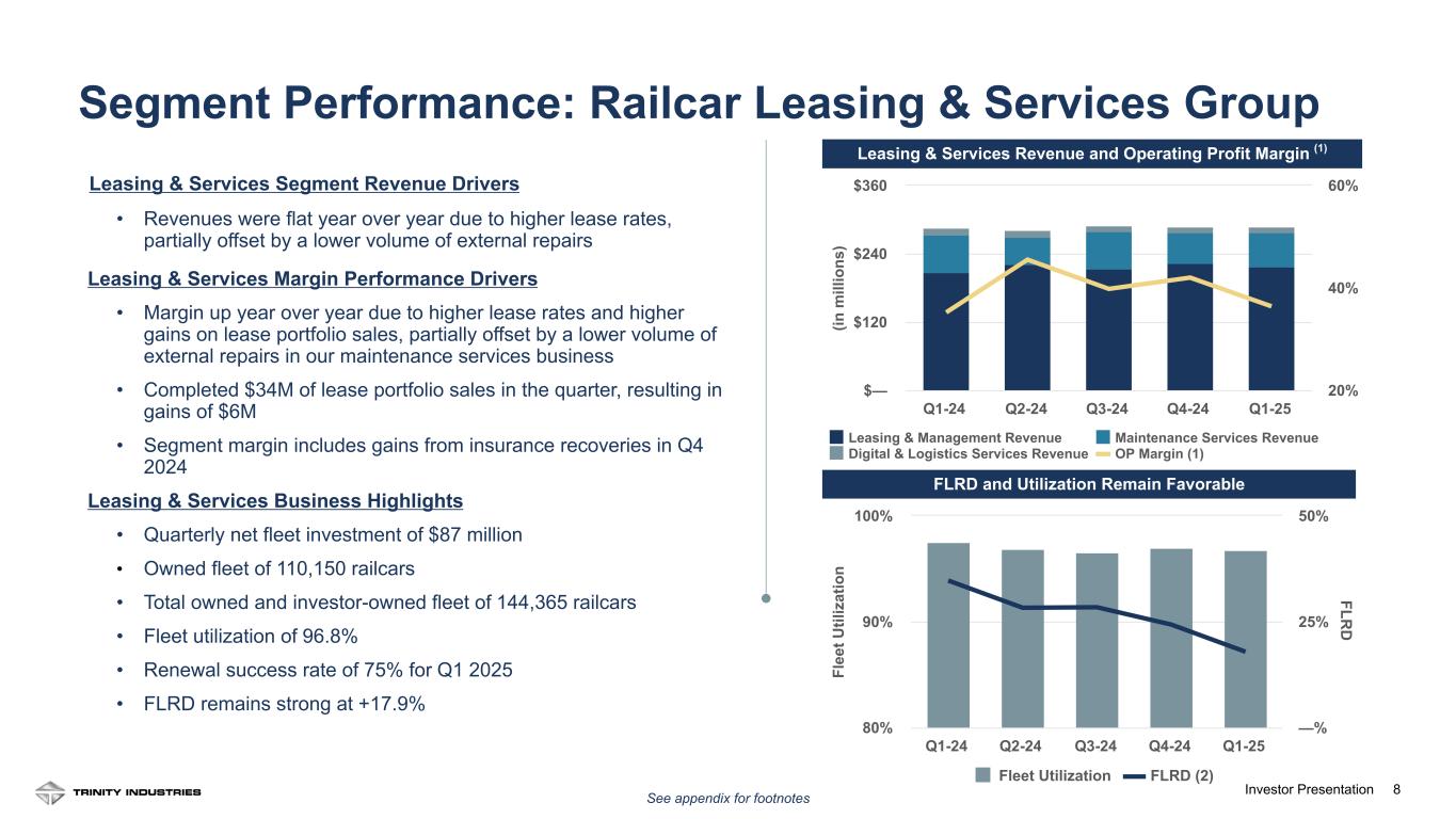 7Investor Presentation North American Railcar Market In Balance C ha ng e in N or th A m er ic an R ai lc ar F le et (r ai lc ar s Y /Y ) S hare of R ailcars in S torage (M onthly % ) Change in Fleet Size (Y/Y) Percent in storage 1/1/2021 1/1/2022 1/1/2023 1/1/2024 1/1/2025 -30,000 -20,000 -10,000 0 10,000 20,000 —% 5% 10% 15% 20% 25% North American Railcar Fleet and Railcars in Storage Source: Association of American Railroads (“AAR”) RAILCAR FLEET After two years of fleet growth, the North American fleet contracted slightly in April driven by lower industry builds, an aging fleet, and attractive scrap rates. We expect to see this trend continue this year as fleet attrition will outpace industry builds. RAILCARS IN STORAGE Railcars in storage are below 19% as railcar owners are utilizing their equipment.