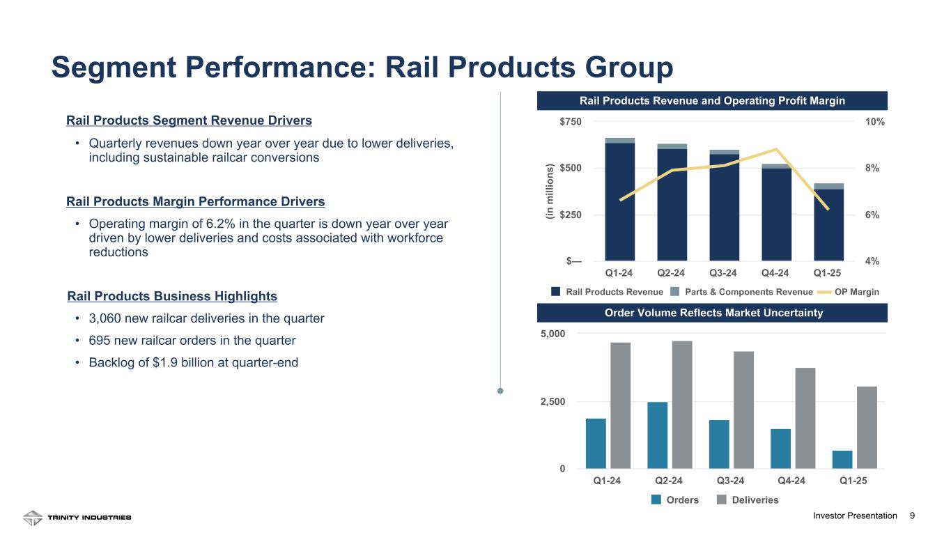 8Investor Presentation8 Leasing & Services Revenue and Operating Profit Margin (1) (in m ill io ns ) Leasing & Management Revenue Maintenance Services Revenue Digital & Logistics Services Revenue OP Margin (1) Q1-24 Q2-24 Q3-24 Q4-24 Q1-25 $— $120 $240 $360 20% 40% 60%Leasing & Services Segment Revenue Drivers • Revenues were flat year over year due to higher lease rates, partially offset by a lower volume of external repairs Leasing & Services Margin Performance Drivers • Margin up year over year due to higher lease rates and higher gains on lease portfolio sales, partially offset by a lower volume of external repairs in our maintenance services business • Completed $34M of lease portfolio sales in the quarter, resulting in gains of $6M • Segment margin includes gains from insurance recoveries in Q4 2024 Leasing & Services Business Highlights • Quarterly net fleet investment of $87 million • Owned fleet of 110,150 railcars • Total owned and investor-owned fleet of 144,365 railcars • Fleet utilization of 96.8% • Renewal success rate of 75% for Q1 2025 • FLRD remains strong at +17.9% See appendix for footnotes Segment Performance: Railcar Leasing & Services Group Fl ee t U til iz at io n FLR D Fleet Utilization FLRD (2) Q1-24 Q2-24 Q3-24 Q4-24 Q1-25 80% 90% 100% —% 25% 50% FLRD and Utilization Remain Favorable