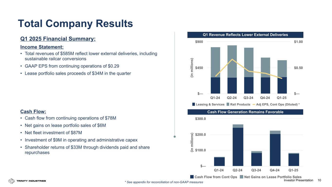 9Investor Presentation9 Rail Products Segment Revenue Drivers • Quarterly revenues down year over year due to lower deliveries, including sustainable railcar conversions Rail Products Margin Performance Drivers • Operating margin of 6.2% in the quarter is down year over year driven by lower deliveries and costs associated with workforce reductions Rail Products Business Highlights • 3,060 new railcar deliveries in the quarter • 695 new railcar orders in the quarter • Backlog of $1.9 billion at quarter-end Rail Products Revenue and Operating Profit Margin (in m ill io ns ) Rail Products Revenue Parts & Components Revenue OP Margin Q1-24 Q2-24 Q3-24 Q4-24 Q1-25 $— $250 $500 $750 4% 6% 8% 10% Segment Performance: Rail Products Group Orders Deliveries Q1-24 Q2-24 Q3-24 Q4-24 Q1-25 0 2,500 5,000 Order Volume Reflects Market Uncertainty
