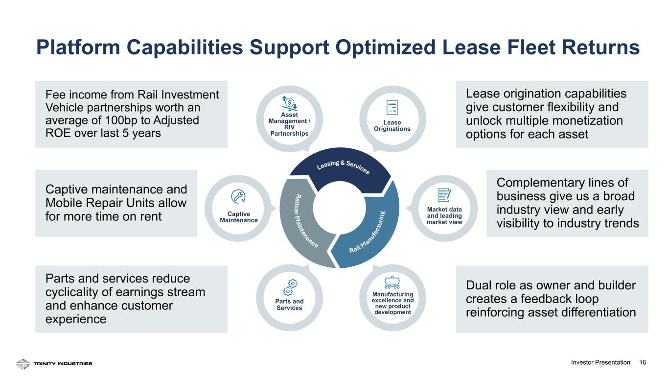 15Investor Presentation Optimize customers’ ownership and usage of railcar equipment Cross-sell to deliver innovative solutions and differentiated experience Create an unmatched rail platform that provides a full suite of customer solutions to make a Trinity leased railcar the “railcar of choice” for our shipper customers for higher fleet utilization, more value streams per railcar, and higher shareholder returns Trinity’s Platform Built for Superior Performance