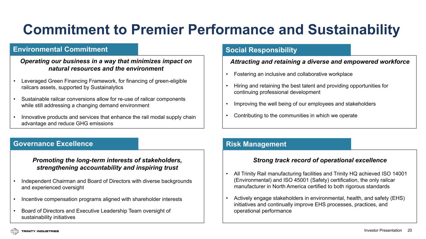 19Investor Presentation 13% 13% 9% 26% 12% 13% TRN, 14% TRN UnionTank GATX All other * ITE CIT Wells Fargo The TrinityRail platform has grown at a 10% CAGR since 2003 Lessors Make Up A Growing Share of the North American Fleet Railcar Lessor Ownership Profile Presents Consolidation Opportunity Operating Lessors *Over 90 lessors own 252K railcars in “All other” 19 Financial Lessors 55% 18% 17% 10% Lessor Railroad Shipper TTX See appendix for source information Capitalizing on Structural Change in the Rail Market