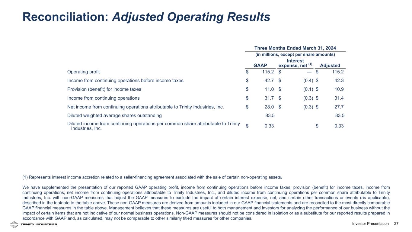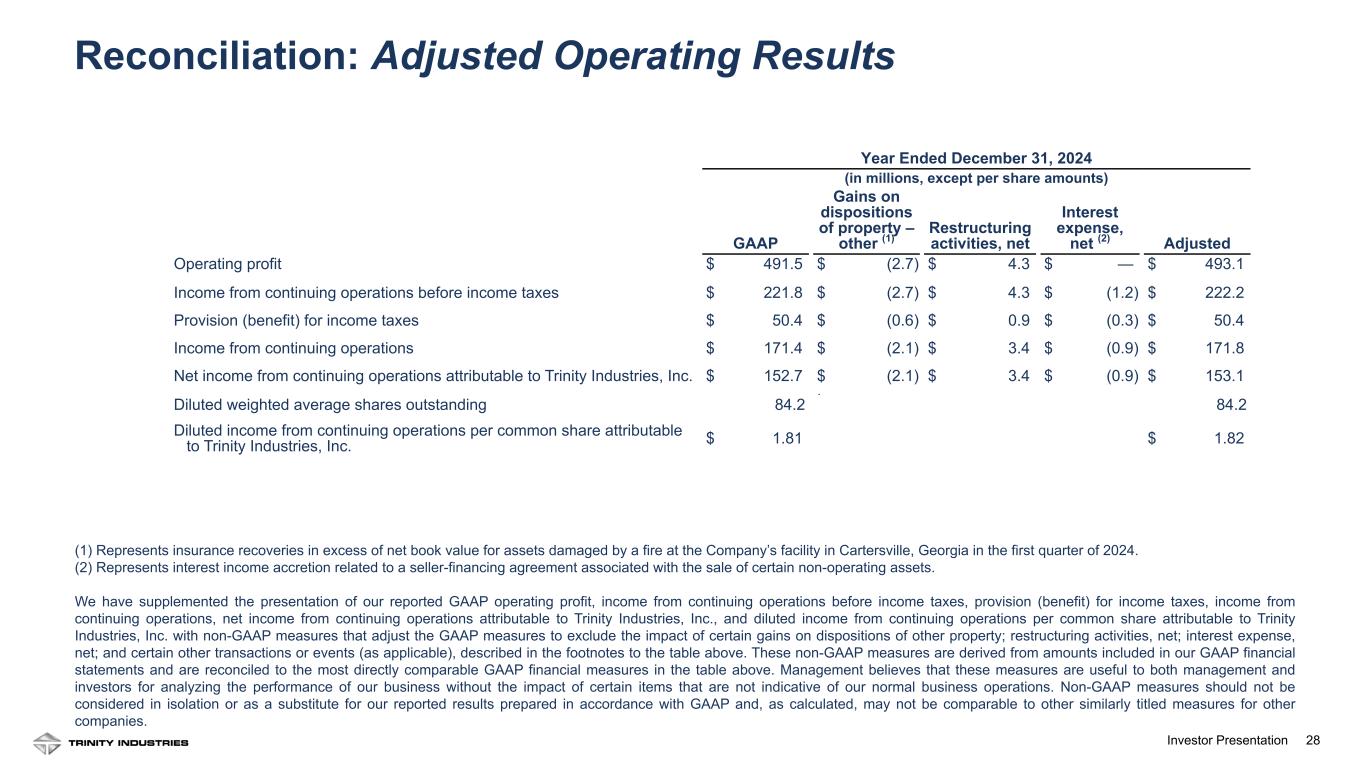 27Investor Presentation 27 Reconciliation: Adjusted Operating Results (1) Represents interest income accretion related to a seller-financing agreement associated with the sale of certain non-operating assets. We have supplemented the presentation of our reported GAAP operating profit, income from continuing operations before income taxes, provision (benefit) for income taxes, income from continuing operations, net income from continuing operations attributable to Trinity Industries, Inc., and diluted income from continuing operations per common share attributable to Trinity Industries, Inc. with non-GAAP measures that adjust the GAAP measures to exclude the impact of certain interest expense, net; and certain other transactions or events (as applicable), described in the footnote to the table above. These non-GAAP measures are derived from amounts included in our GAAP financial statements and are reconciled to the most directly comparable GAAP financial measures in the table above. Management believes that these measures are useful to both management and investors for analyzing the performance of our business without the impact of certain items that are not indicative of our normal business operations. Non-GAAP measures should not be considered in isolation or as a substitute for our reported results prepared in accordance with GAAP and, as calculated, may not be comparable to other similarly titled measures for other companies. Three Months Ended March 31, 2024 (in millions, except per share amounts) GAAP Interest expense, net (1) Adjusted Operating profit $ 115.2 $ — $ 115.2 Income from continuing operations before income taxes $ 42.7 $ (0.4) $ 42.3 Provision (benefit) for income taxes $ 11.0 $ (0.1) $ 10.9 Income from continuing operations $ 31.7 $ (0.3) $ 31.4 Net income from continuing operations attributable to Trinity Industries, Inc. $ 28.0 $ (0.3) $ 27.7 Diluted weighted average shares outstanding 83.5 83.5 Diluted income from continuing operations per common share attributable to Trinity Industries, Inc. $ 0.33 $ 0.33