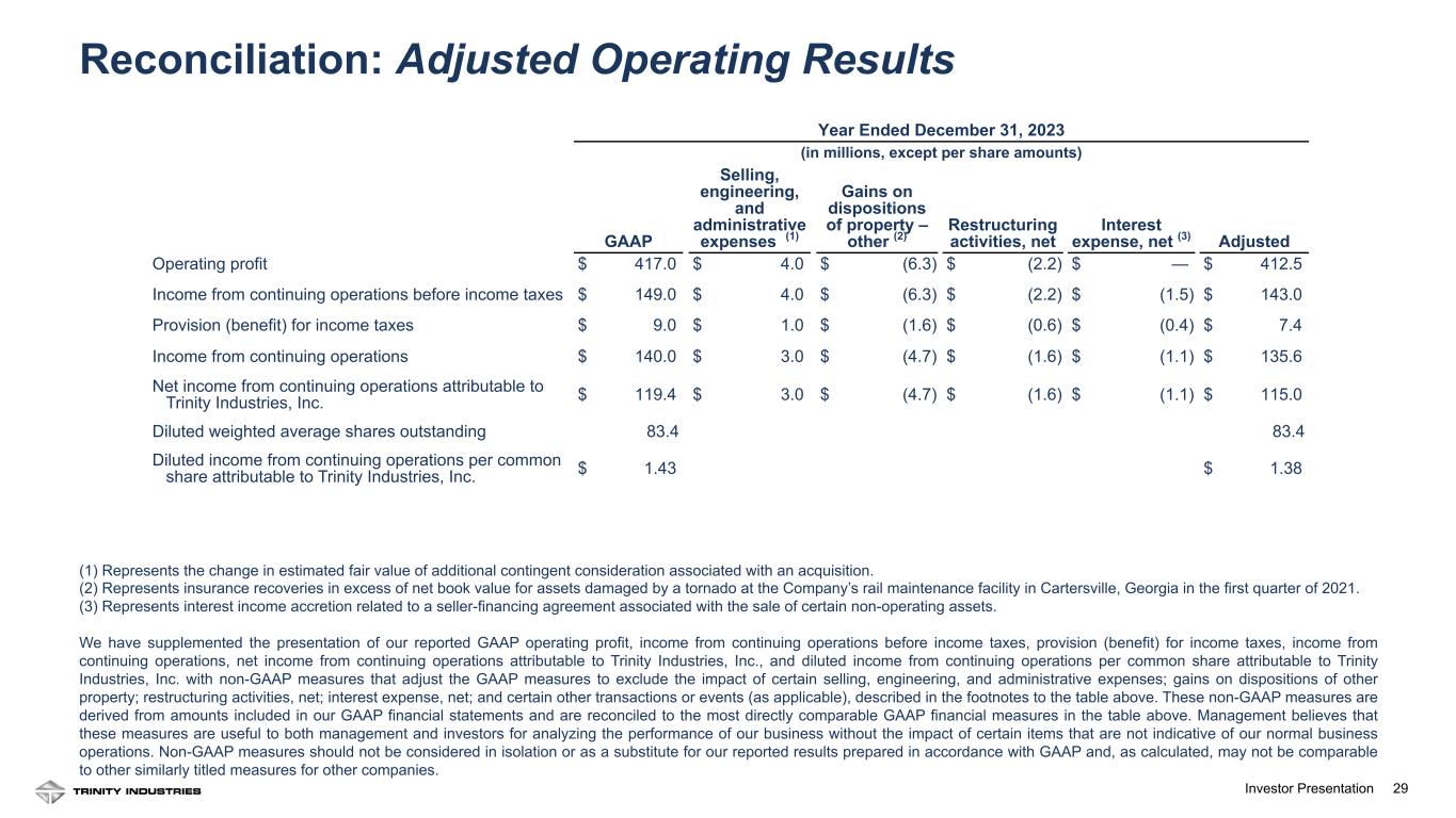 28Investor Presentation 28 Year Ended December 31, 2024 (in millions, except per share amounts) GAAP Gains on dispositions of property – other (1) Restructuring activities, net Interest expense, net (2) Adjusted Operating profit $ 491.5 $ (2.7) $ 4.3 $ — $ 493.1 Income from continuing operations before income taxes $ 221.8 $ (2.7) $ 4.3 $ (1.2) $ 222.2 Provision (benefit) for income taxes $ 50.4 $ (0.6) $ 0.9 $ (0.3) $ 50.4 Income from continuing operations $ 171.4 $ (2.1) $ 3.4 $ (0.9) $ 171.8 Net income from continuing operations attributable to Trinity Industries, Inc. $ 152.7 $ (2.1) $ 3.4 $ (0.9) $ 153.1 . Diluted weighted average shares outstanding 84.2 84.2 Diluted income from continuing operations per common share attributable to Trinity Industries, Inc. $ 1.81 $ 1.82 Reconciliation: Adjusted Operating Results (1) Represents insurance recoveries in excess of net book value for assets damaged by a fire at the Company’s facility in Cartersville, Georgia in the first quarter of 2024. (2) Represents interest income accretion related to a seller-financing agreement associated with the sale of certain non-operating assets. We have supplemented the presentation of our reported GAAP operating profit, income from continuing operations before income taxes, provision (benefit) for income taxes, income from continuing operations, net income from continuing operations attributable to Trinity Industries, Inc., and diluted income from continuing operations per common share attributable to Trinity Industries, Inc. with non-GAAP measures that adjust the GAAP measures to exclude the impact of certain gains on dispositions of other property; restructuring activities, net; interest expense, net; and certain other transactions or events (as applicable), described in the footnotes to the table above. These non-GAAP measures are derived from amounts included in our GAAP financial statements and are reconciled to the most directly comparable GAAP financial measures in the table above. Management believes that these measures are useful to both management and investors for analyzing the performance of our business without the impact of certain items that are not indicative of our normal business operations. Non-GAAP measures should not be considered in isolation or as a substitute for our reported results prepared in accordance with GAAP and, as calculated, may not be comparable to other similarly titled measures for other companies.