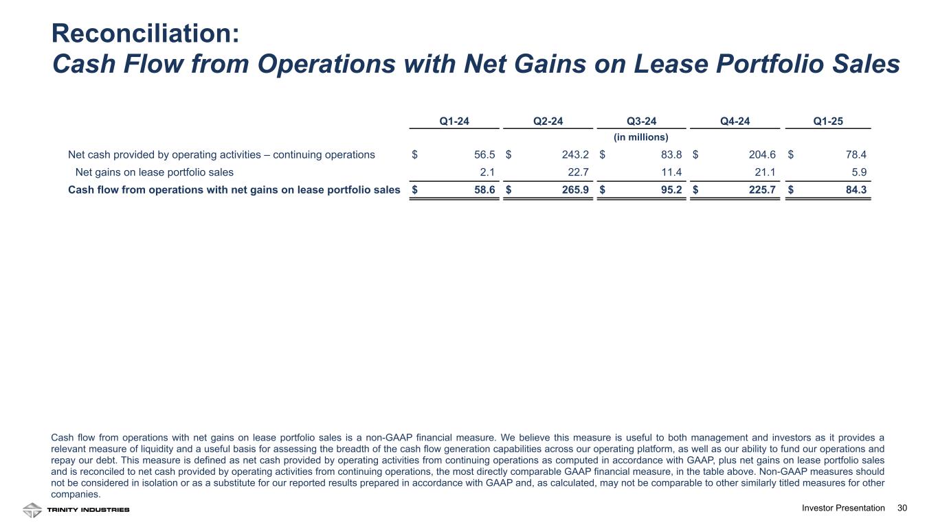 29Investor Presentation 29 (1) Represents the change in estimated fair value of additional contingent consideration associated with an acquisition. (2) Represents insurance recoveries in excess of net book value for assets damaged by a tornado at the Company’s rail maintenance facility in Cartersville, Georgia in the first quarter of 2021. (3) Represents interest income accretion related to a seller-financing agreement associated with the sale of certain non-operating assets. We have supplemented the presentation of our reported GAAP operating profit, income from continuing operations before income taxes, provision (benefit) for income taxes, income from continuing operations, net income from continuing operations attributable to Trinity Industries, Inc., and diluted income from continuing operations per common share attributable to Trinity Industries, Inc. with non-GAAP measures that adjust the GAAP measures to exclude the impact of certain selling, engineering, and administrative expenses; gains on dispositions of other property; restructuring activities, net; interest expense, net; and certain other transactions or events (as applicable), described in the footnotes to the table above. These non-GAAP measures are derived from amounts included in our GAAP financial statements and are reconciled to the most directly comparable GAAP financial measures in the table above. Management believes that these measures are useful to both management and investors for analyzing the performance of our business without the impact of certain items that are not indicative of our normal business operations. Non-GAAP measures should not be considered in isolation or as a substitute for our reported results prepared in accordance with GAAP and, as calculated, may not be comparable to other similarly titled measures for other companies. Year Ended December 31, 2023 (in millions, except per share amounts) GAAP Selling, engineering, and administrative expenses (1) Gains on dispositions of property – other (2) Restructuring activities, net Interest expense, net (3) Adjusted Operating profit $ 417.0 $ 4.0 $ (6.3) $ (2.2) $ — $ 412.5 Income from continuing operations before income taxes $ 149.0 $ 4.0 $ (6.3) $ (2.2) $ (1.5) $ 143.0 Provision (benefit) for income taxes $ 9.0 $ 1.0 $ (1.6) $ (0.6) $ (0.4) $ 7.4 Income from continuing operations $ 140.0 $ 3.0 $ (4.7) $ (1.6) $ (1.1) $ 135.6 Net income from continuing operations attributable to Trinity Industries, Inc. $ 119.4 $ 3.0 $ (4.7) $ (1.6) $ (1.1) $ 115.0 Diluted weighted average shares outstanding 83.4 83.4 Diluted income from continuing operations per common share attributable to Trinity Industries, Inc. $ 1.43 $ 1.38 Reconciliation: Adjusted Operating Results