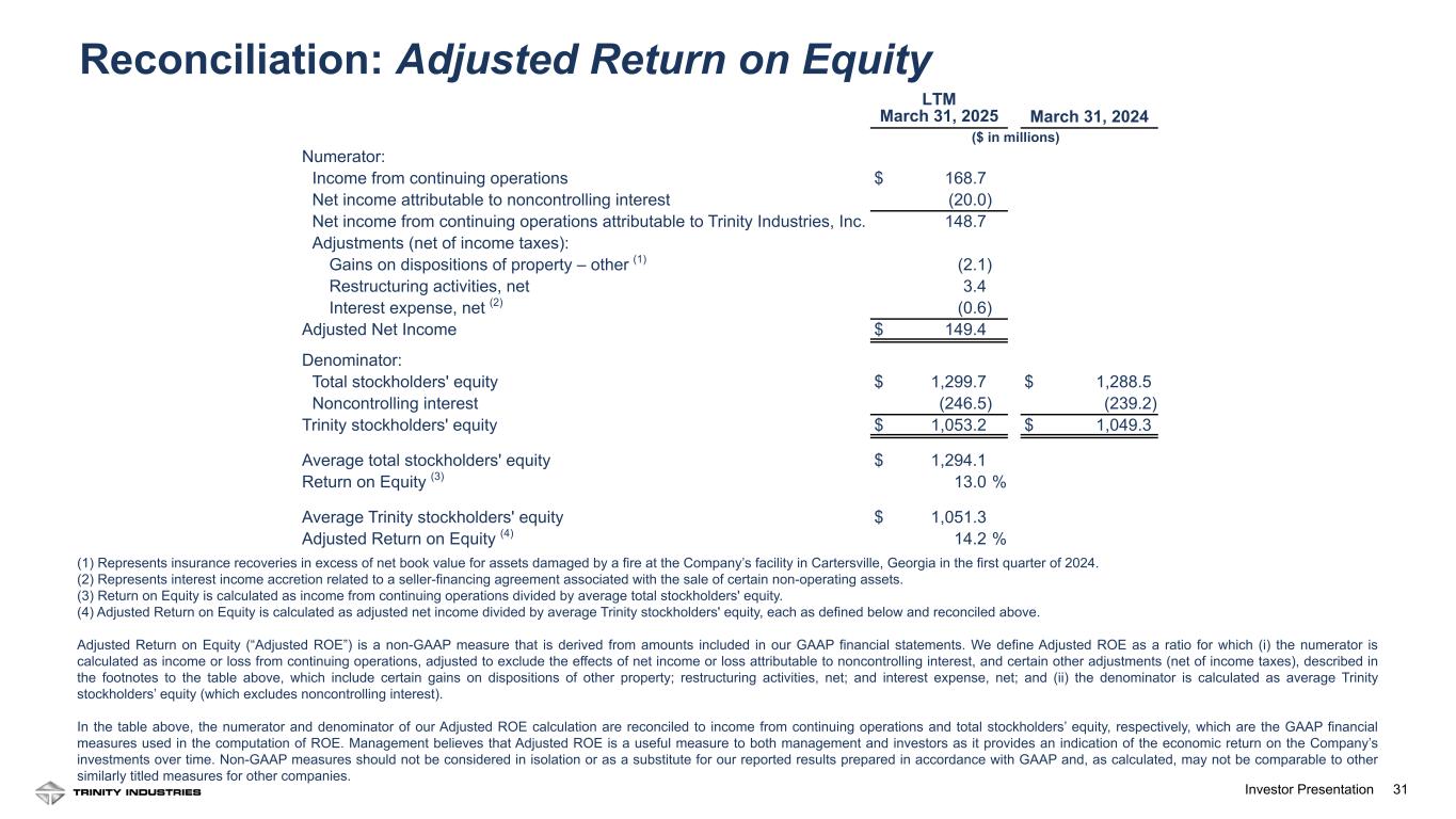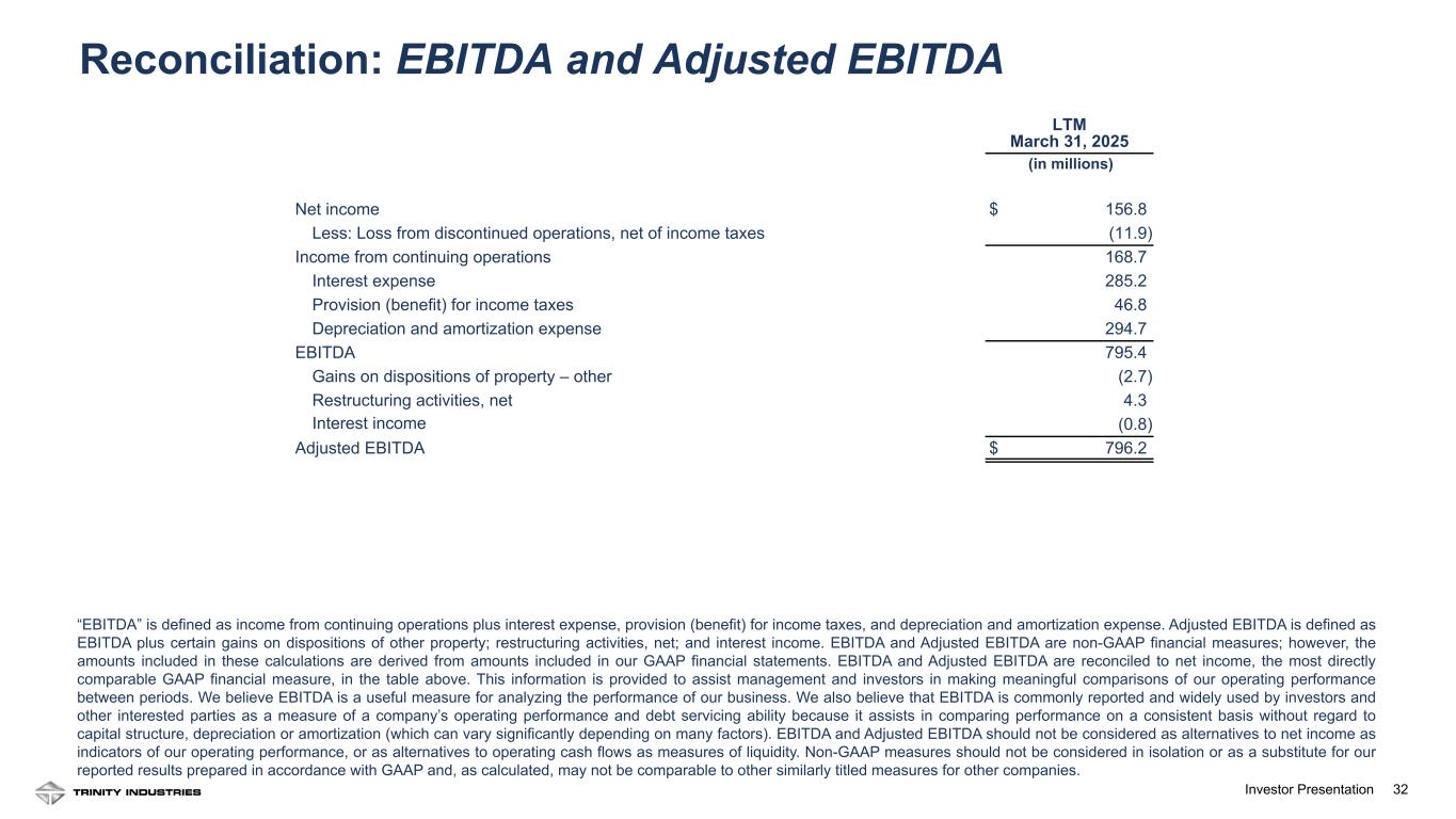 31Investor Presentation (1) Represents insurance recoveries in excess of net book value for assets damaged by a fire at the Company’s facility in Cartersville, Georgia in the first quarter of 2024. (2) Represents interest income accretion related to a seller-financing agreement associated with the sale of certain non-operating assets. (3) Return on Equity is calculated as income from continuing operations divided by average total stockholders' equity. (4) Adjusted Return on Equity is calculated as adjusted net income divided by average Trinity stockholders' equity, each as defined below and reconciled above. Adjusted Return on Equity (“Adjusted ROE”) is a non-GAAP measure that is derived from amounts included in our GAAP financial statements. We define Adjusted ROE as a ratio for which (i) the numerator is calculated as income or loss from continuing operations, adjusted to exclude the effects of net income or loss attributable to noncontrolling interest, and certain other adjustments (net of income taxes), described in the footnotes to the table above, which include certain gains on dispositions of other property; restructuring activities, net; and interest expense, net; and (ii) the denominator is calculated as average Trinity stockholders’ equity (which excludes noncontrolling interest). In the table above, the numerator and denominator of our Adjusted ROE calculation are reconciled to income from continuing operations and total stockholders’ equity, respectively, which are the GAAP financial measures used in the computation of ROE. Management believes that Adjusted ROE is a useful measure to both management and investors as it provides an indication of the economic return on the Company’s investments over time. Non-GAAP measures should not be considered in isolation or as a substitute for our reported results prepared in accordance with GAAP and, as calculated, may not be comparable to other similarly titled measures for other companies. LTM March 31, 2025 March 31, 2024 ($ in millions) Numerator: Income from continuing operations $ 168.7 Net income attributable to noncontrolling interest (20.0) Net income from continuing operations attributable to Trinity Industries, Inc. 148.7 Adjustments (net of income taxes): Gains on dispositions of property – other (1) (2.1) Restructuring activities, net 3.4 Interest expense, net (2) (0.6) Adjusted Net Income $ 149.4 Denominator: Total stockholders' equity $ 1,299.7 $ 1,288.5 Noncontrolling interest (246.5) (239.2) Trinity stockholders' equity $ 1,053.2 $ 1,049.3 Average total stockholders' equity $ 1,294.1 Return on Equity (3) 13.0 % Average Trinity stockholders' equity $ 1,051.3 Adjusted Return on Equity (4) 14.2 % Reconciliation: Adjusted Return on Equity