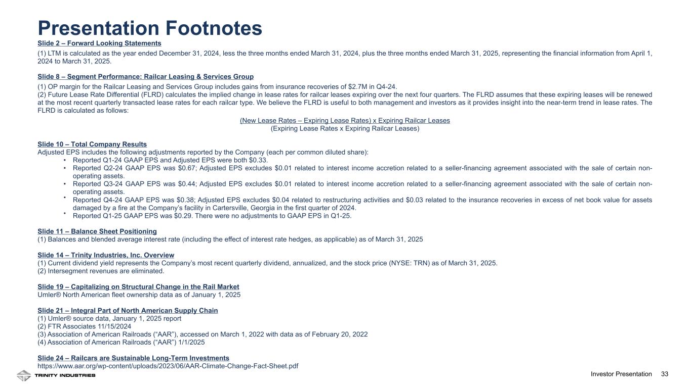 33Investor Presentation Slide 2 – Forward Looking Statements (1) LTM is calculated as the year ended December 31, 2024, less the three months ended March 31, 2024, plus the three months ended March 31, 2025, representing the financial information from April 1, 2024 to March 31, 2025. Slide 8 – Segment Performance: Railcar Leasing & Services Group (1) OP margin for the Railcar Leasing and Services Group includes gains from insurance recoveries of $2.7M in Q4-24. (2) Future Lease Rate Differential (FLRD) calculates the implied change in lease rates for railcar leases expiring over the next four quarters. The FLRD assumes that these expiring leases will be renewed at the most recent quarterly transacted lease rates for each railcar type. We believe the FLRD is useful to both management and investors as it provides insight into the near-term trend in lease rates. The FLRD is calculated as follows: (New Lease Rates – Expiring Lease Rates) x Expiring Railcar Leases (Expiring Lease Rates x Expiring Railcar Leases) Slide 10 – Total Company Results Adjusted EPS includes the following adjustments reported by the Company (each per common diluted share): • Reported Q1-24 GAAP EPS and Adjusted EPS were both $0.33. • Reported Q2-24 GAAP EPS was $0.67; Adjusted EPS excludes $0.01 related to interest income accretion related to a seller-financing agreement associated with the sale of certain non- operating assets. • Reported Q3-24 GAAP EPS was $0.44; Adjusted EPS excludes $0.01 related to interest income accretion related to a seller-financing agreement associated with the sale of certain non- operating assets. • Reported Q4-24 GAAP EPS was $0.38; Adjusted EPS excludes $0.04 related to restructuring activities and $0.03 related to the insurance recoveries in excess of net book value for assets damaged by a fire at the Company’s facility in Cartersville, Georgia in the first quarter of 2024. • Reported Q1-25 GAAP EPS was $0.29. There were no adjustments to GAAP EPS in Q1-25. Slide 11 – Balance Sheet Positioning (1) Balances and blended average interest rate (including the effect of interest rate hedges, as applicable) as of March 31, 2025 Slide 14 – Trinity Industries, Inc. Overview (1) Current dividend yield represents the Company’s most recent quarterly dividend, annualized, and the stock price (NYSE: TRN) as of March 31, 2025. (2) Intersegment revenues are eliminated. Slide 19 – Capitalizing on Structural Change in the Rail Market Umler® North American fleet ownership data as of January 1, 2025 Slide 21 – Integral Part of North American Supply Chain (1) Umler® source data, January 1, 2025 report (2) FTR Associates 11/15/2024 (3) Association of American Railroads (“AAR”), accessed on March 1, 2022 with data as of February 20, 2022 (4) Association of American Railroads (“AAR”) 1/1/2025 Slide 24 – Railcars are Sustainable Long-Term Investments https://www.aar.org/wp-content/uploads/2023/06/AAR-Climate-Change-Fact-Sheet.pdf Presentation Footnotes