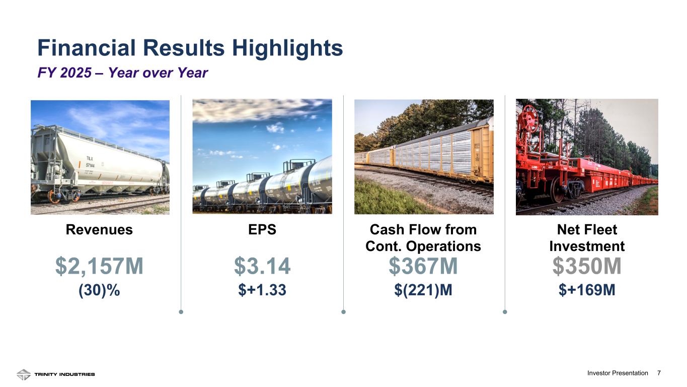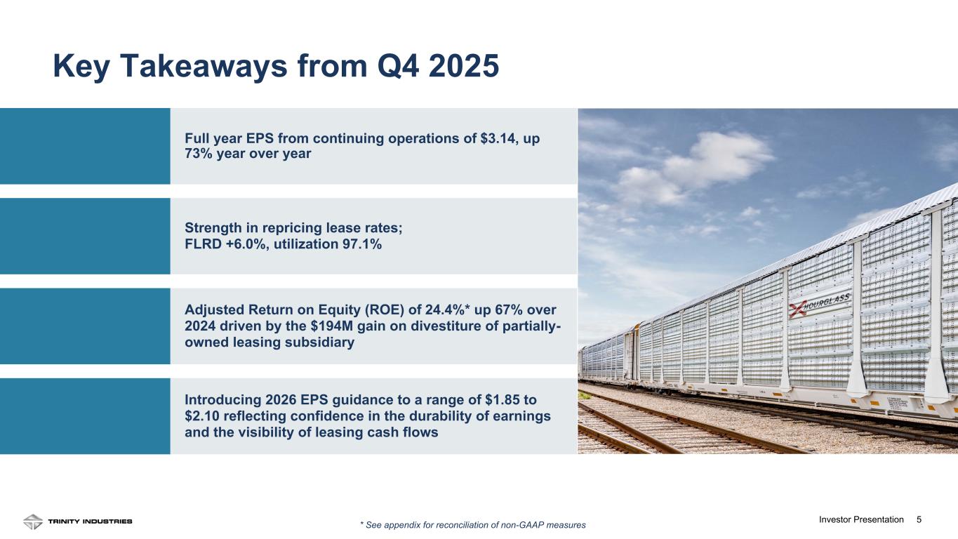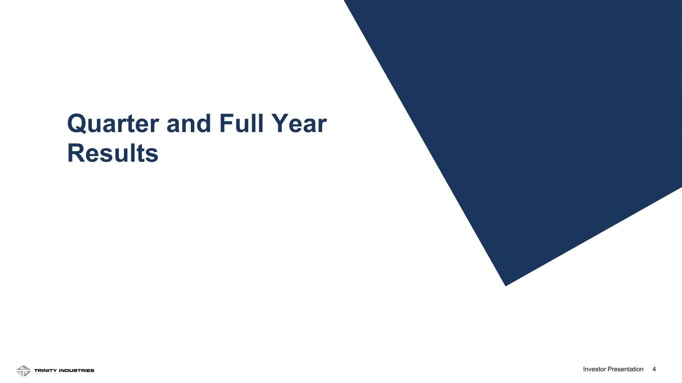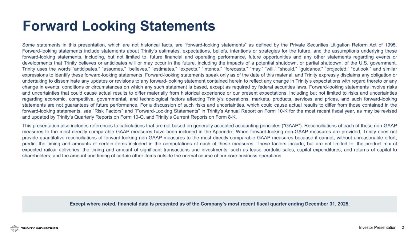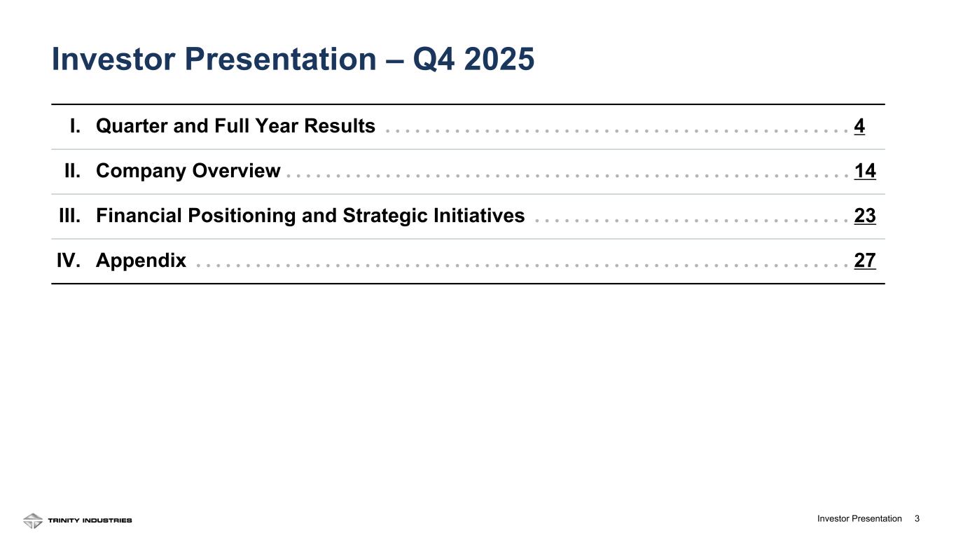 2Investor Presentation 2 Forward Looking Statements Some statements in this presentation, which are not historical facts, are “forward-looking statements” as defined by the Private Securities Litigation Reform Act of 1995. Forward-looking statements include statements about Trinity's estimates, expectations, beliefs, intentions or strategies for the future, and the assumptions underlying these forward-looking statements, including, but not limited to, future financial and operating performance, future opportunities and any other statements regarding events or developments that Trinity believes or anticipates will or may occur in the future, including the impacts of a potential shutdown, or partial shutdown, of the U.S. government. Trinity uses the words “anticipates,” “assumes,” “believes,” “estimates,” “expects,” “intends,” “forecasts,” “may,” “will,” “should,” “guidance,” “projected,” “outlook,” and similar expressions to identify these forward-looking statements. Forward-looking statements speak only as of the date of this material, and Trinity expressly disclaims any obligation or undertaking to disseminate any updates or revisions to any forward-looking statement contained herein to reflect any change in Trinity’s expectations with regard thereto or any change in events, conditions or circumstances on which any such statement is based, except as required by federal securities laws. Forward-looking statements involve risks and uncertainties that could cause actual results to differ materially from historical experience or our present expectations, including but not limited to risks and uncertainties regarding economic, competitive, governmental, and technological factors affecting Trinity’s operations, markets, products, services and prices, and such forward-looking statements are not guarantees of future performance. For a discussion of such risks and uncertainties, which could cause actual results to differ from those contained in the forward-looking statements, see “Risk Factors” and “Forward-Looking Statements” in Trinity’s Annual Report on Form 10-K for the most recent fiscal year, as may be revised and updated by Trinity’s Quarterly Reports on Form 10-Q, and Trinity’s Current Reports on Form 8-K. This presentation also includes references to calculations that are not based on generally accepted accounting principles (“GAAP”). Reconciliations of each of these non-GAAP measures to the most directly comparable GAAP measures have been included in the Appendix. When forward-looking non-GAAP measures are provided, Trinity does not provide quantitative reconciliations of forward-looking non-GAAP measures to the most directly comparable GAAP measures because it cannot, without unreasonable effort, predict the timing and amounts of certain items included in the computations of each of these measures. These factors include, but are not limited to: the product mix of expected railcar deliveries; the timing and amount of significant transactions and investments, such as lease portfolio sales, capital expenditures, and returns of capital to shareholders; and the amount and timing of certain other items outside the normal course of our core business operations. Except where noted, financial data is presented as of the Company’s most recent fiscal quarter ending December 31, 2025.