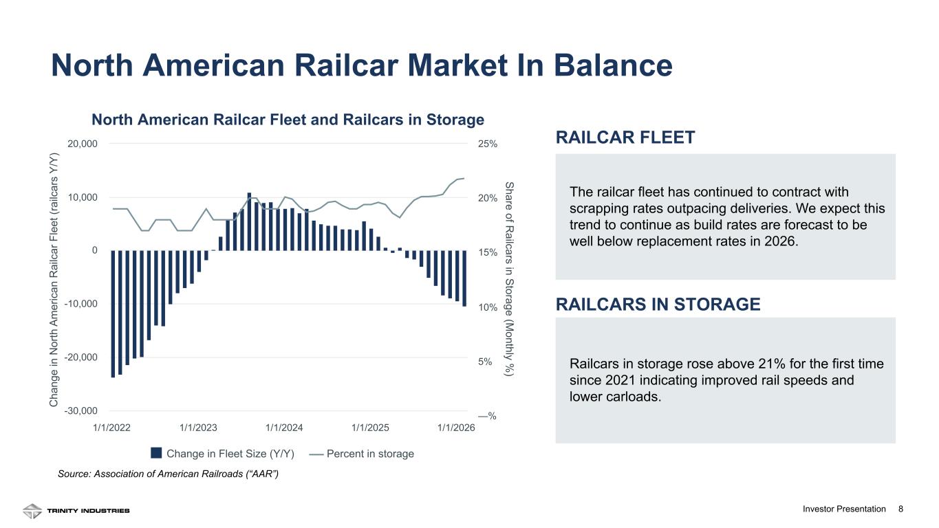 8Investor Presentation North American Railcar Market In Balance C ha ng e in N or th A m er ic an R ai lc ar F le et (r ai lc ar s Y /Y ) S hare of R ailcars in S torage (M onthly % ) Change in Fleet Size (Y/Y) Percent in storage 1/1/2022 1/1/2023 1/1/2024 1/1/2025 1/1/2026 -30,000 -20,000 -10,000 0 10,000 20,000 —% 5% 10% 15% 20% 25% North American Railcar Fleet and Railcars in Storage Source: Association of American Railroads (“AAR”) RAILCAR FLEET The railcar fleet has continued to contract with scrapping rates outpacing deliveries. We expect this trend to continue as build rates are forecast to be well below replacement rates in 2026. Railcars in storage rose above 21% for the first time since 2021 indicating improved rail speeds and lower carloads. RAILCARS IN STORAGE